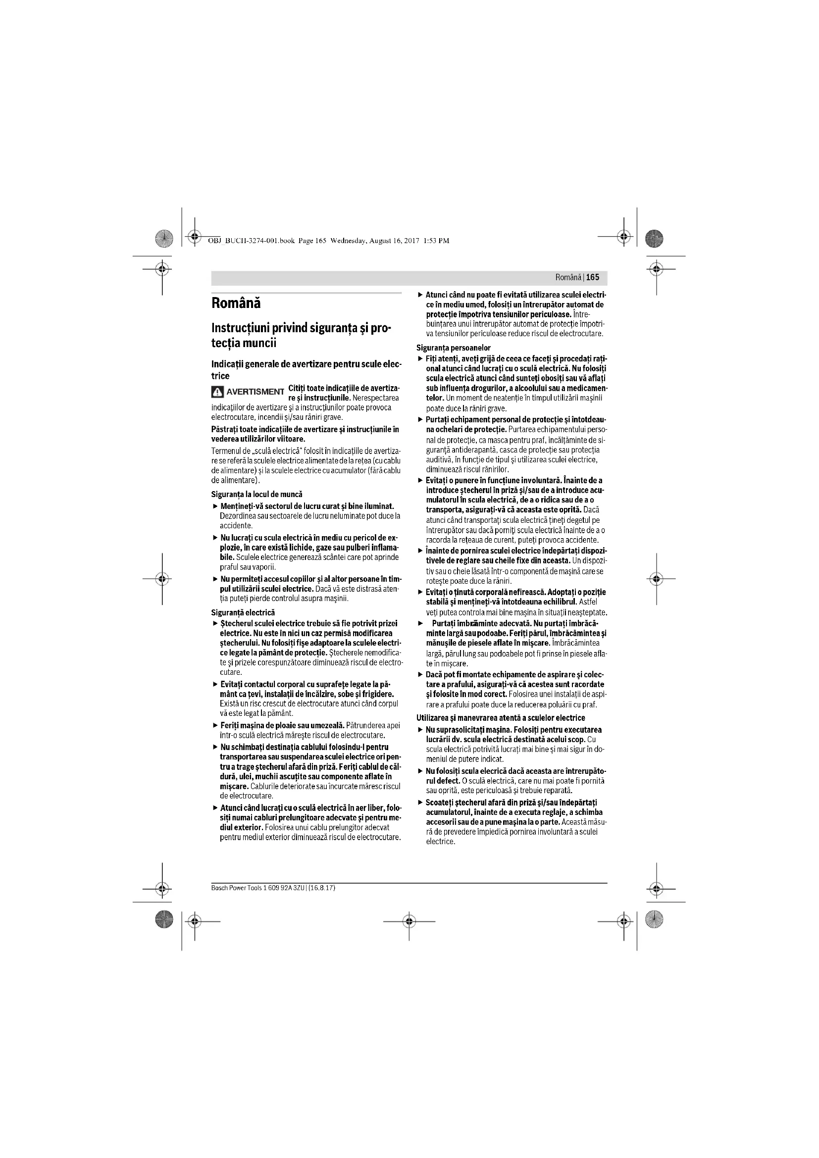 Техникалық өзгерістер енгізу құқығы сақталады. OBJ_BUCH-3274-001.book Page 164 Wednesday, August 16, 2017 1:53 PMRomână | 165 Bosch Power Tools 1 609 92A 3ZU | (16.8.17) Română Instrucţiuni privind siguranţa şi pro- tecţia muncii Indicaţii generale de avertizare pentru scule elec- trice Citiţi toate indicaţiile de avertiza- re şi instrucţiunile. Nerespectarea indicaţiilor de avertizare şi a instrucţiunilor poate provoca electrocutare, incendii şi/sau răniri grave. Păstraţi toate indicaţiile de avertizare şi instrucţiunile în vederea utilizărilor viitoare. Termenul de „sculă electrică“ folosit în indicaţiile de avertiza- re se referă la sculele electrice alimentate de la reţea (cu cablu de alimentare) şi la sculele electrice cu acumulator (fără cablu de alimentare). Siguranţa la locul de muncă Menţineţi-vă sectorul de lucru curat şi bine iluminat. Dezordinea sau sectoarele de lucru neluminate pot duce la accidente. Nu lucraţi cu scula electrică în mediu cu pericol de ex- plozie, în care există lichide, gaze sau pulberi inflama- bile. Sculele electrice generează scântei care pot aprinde praful sau vaporii. Nu permiteţi accesul copiilor şi al altor persoane în tim- pul utilizării sculei electrice. Dacă vă este distrasă aten- ţia puteţi pierde controlul asupra maşinii. Siguranţă electrică Ştecherul sculei electrice trebuie să fie potrivit prizei electrice. Nu este în nici un caz permisă modificarea ştecherului. Nu folosiţi fişe adaptoare la sculele electri- ce legate la pământ de protecţie. Ştecherele nemodifica- te şi prizele corespunzătoare diminuează riscul de electro- cutare. Evitaţi contactul corporal cu suprafeţe legate la pă- mânt ca ţevi, instalaţii de înc ălzire, sobe şi frigidere. Există un risc crescut de electrocutare atunci când corpul vă este legat la pământ. Feriţi maşina de ploaie sau umezeală. Pătrunderea apei într-o sculă electrică măreşte riscul de electrocutare. Nu schimbaţi destinaţia cablului folosindu-l pentru transportarea sau suspendarea sculei electrice ori pen- tru a trage ştecherul afară din priză. Feriţi cablul de căl- dură, ulei, muchii ascuţite sau componente aflate în mişcare. Cablurile deteriorate sau încurcate măresc riscul de electrocutare. Atunci când lucraţi cu o sculă electrică în aer liber, folo- siţi numai cabluri prelungitoare adecvate şi pentru me- diul exterior. Folosirea unui cablu prelungitor adecvat pentru mediul exterior diminuează riscul de electrocutare. Atunci când nu poate fi evitată utilizarea sculei electri- ce în mediu umed, folosiţi un întrerupător automat de protecţie împotriva tensiunilor periculoase. Între- buinţarea unui întrerupător automat de protecţie împotri- va tensiunilor periculoase reduce riscul de electrocutare. Siguranţa persoanelor Fiţi atenţi, aveţi grijă de ceea ce faceţi şi procedaţi raţi- onal atunci când lucraţi cu o sculă electrică. Nu folosiţi scula electrică atunci când sunte ţi obosiţi sau vă aflaţi sub influenţa drogurilor, a alcoolului sau a medicamen- telor. Un moment de neatenţie în timpul utilizării maşinii poate duce la răniri grave. Purtaţi echipament personal de protecţie şi întotdeau- na ochelari de protecţie. Purtarea echipamentului perso- nal de protecţie, ca masca pentru praf, încălţăminte de si- guranţă antiderapantă, casca de protecţie sau protecţia auditivă, în funcţie de tipul şi utilizarea sculei electrice, diminuează riscul rănirilor. Evitaţi o punere în funcţiune involuntară. Înainte de a introduce ştecherul în priză şi/sau de a introduce acu- mulatorul în scula electrică, de a o ridica sau de a o transporta, asiguraţi-vă că aceasta este oprită. Dacă atunci când transportaţi scula electrică ţineţi degetul pe întrerupător sau dacă porniţi scula electrică înainte de a o racorda la reţeaua de curent, puteţi provoca accidente. Înainte de pornirea sculei electrice îndepărtaţi dispozi- tivele de reglare sau cheile fixe din aceasta. Un dispozi- tiv sau o cheie lăsată într-o componentă de maşină care se roteşte poate duce la răniri. Evitaţi o ţinută corporală nefirească. Adoptaţi o poziţie stabilă şi menţineţi-vă întotdeauna echilibrul. Astfel veţi putea controla mai bine maşina în situaţii neaşteptate. Purtaţi îmbră căminte adecvată. Nu purtaţi îmbrăcă- minte largă sau podoabe. Feriţi părul, îmbrăcămintea şi mănuşile de piesele aflate în mişcare. Îmbrăcămintea largă, părul lung sau podoabele pot fi prinse în piesele afla- te în mişcare. Dacă pot fi montate echipamente de aspirare şi colec- tare a prafului, asiguraţi-vă că acestea sunt racordate şi folosite în mod corect. Folosirea unei instalaţii de aspi- rare a prafului poate duce la reducerea poluării cu praf. Utilizarea şi manevrarea atentă a sculelor electrice Nu suprasolicitaţi maşina. Folosiţi pentru executarea lucrării dv. scula electrică destinată acelui scop. Cu scula electrică potrivită lucraţi mai bine şi mai sigur în do- meniul de putere indicat. Nu folosiţi scula elecrică dacă aceasta are întrerupăto- rul defect. O sculă electrică, care nu mai poate fi pornită sau oprită, este periculoasă şi trebuie reparată. Scoateţi ştecherul afară din priză şi/sau îndepărtaţi acumulatorul, înainte de a executa reglaje, a schimba accesorii sau de a pune maşina la o parte. Această măsu- ră de prevedere împiedică pornirea involuntară a sculei electrice. AVERTISMENT OBJ_BUCH-3274-001.book Page 165 Wednesday, August 16, 2017 1:53 PM166 | Română 1 609 92A 3ZU | (16.8.17) Bosch Power Tools Păstraţi sculele electrice nefolosite la loc inaccesibil copiilor. Nu lăsaţi să lucreze cu maşina persoane care nu sunt familiarizate cu aceasta sau care nu au citit a- ceste instrucţiuni. Sculele electrice devi