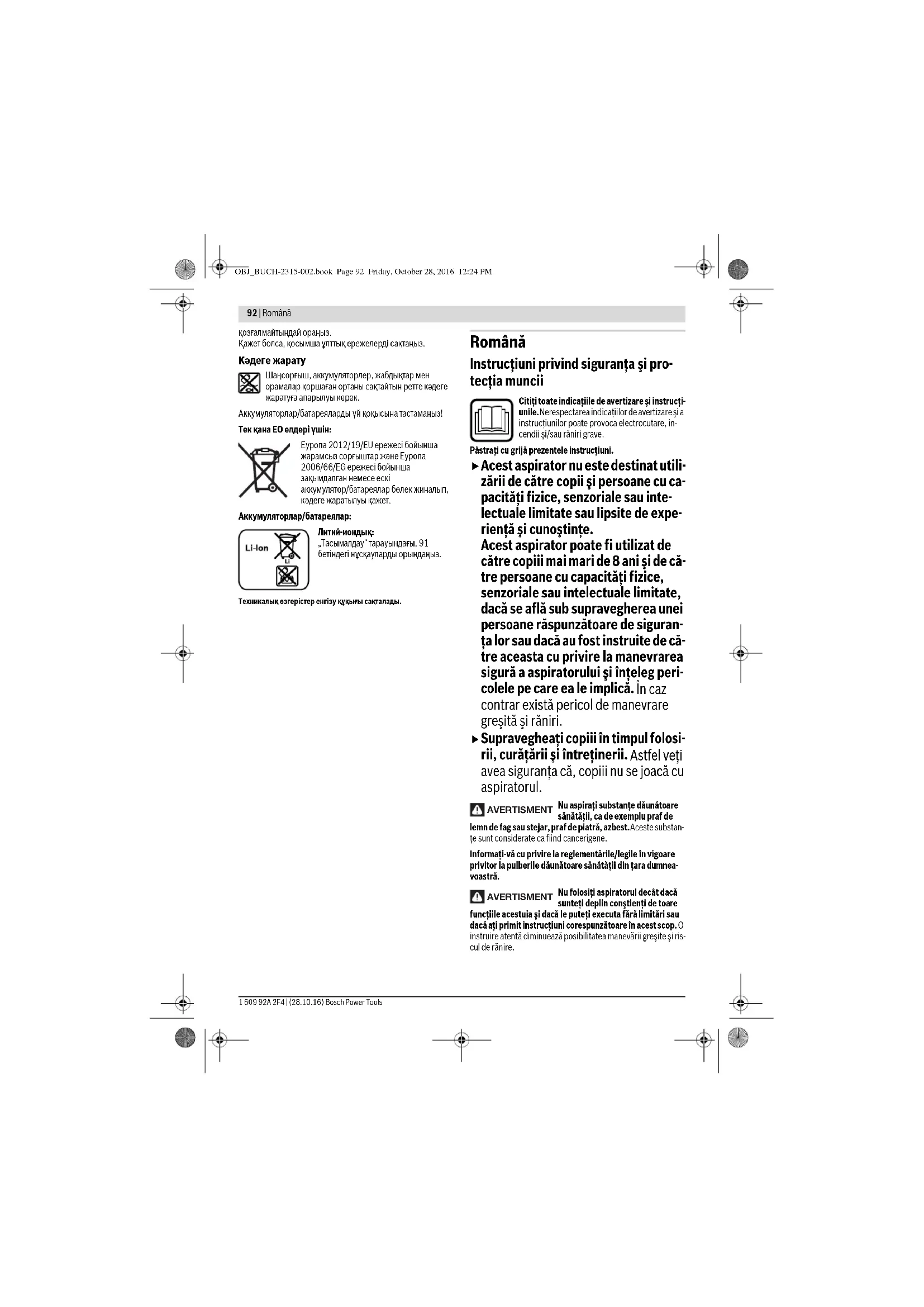 asigură o putere de aspirare optimă. Dacă, după aceasta, nu se revine la capacitatea de aspirare inţi- ală, aspiratorul trebuie dus la centrul de service şi asistenţă teh- nică post-vânzări. Asistenţă clienţi şi consultanţă privind utilizarea Serviciul de asistenţă clienţi vă răspunde la întrebări privind re- pararea şi întreţinerea produsului dumneavoastră cât şi piesele de schimb. Găsiţi desenele de ansamblu şi informaţii privind pie- sele de schimb şi la: www.bosch-pt.com OBJ_BUCH-2315-002.book Page 95 Friday, October 28, 2016 12:24 PM96 | Български 1 609 92A 2F4 | (28.10.16) Bosch Power Tools Echipa de consultanţă Bosch vă răspunde cu plăcere la întrebări privind produsele noastre şi accesoriile acestora. În caz de reclamaţii şi comenzi de piese de schimb vă rugăm să indicaţi neapărat numărul de identificare compus din 10 cifre, conform plăcuţei indicatoare a tipului produsului. România Robert Bosch SRL Centru de service Bosch Str. Horia Măcelariu Nr. 30–34 013937 Bucureşti Tel. service scule electrice: (021) 4057540 Fax: (021) 4057566 E-Mail: infoBSC@ro.bosch.com Tel. consultanţă clienţi: (021) 4057500 Fax: (021) 2331313 E-Mail: infoBSC@ro.bosch.com www.bosch-romania.ro Transport Acumulatorii Li-Ion integraţi respectă cerinţele legislaţiei privind transportul mărfurilor periculoase. Acumulatorii pot fi transpor- taţi rutier fără restricţii de către utilizator. În cazul transportului de către terţi (de exemplu: transport aeri- an sau prin firmă de expediţii) trebuie respectate cerinţe speci- ale privind ambalarea şi marcarea. În această situaţie, la pregăti- rea expedierii trebuie consultat un expert în transportul mărfuri- lor periculoase. Expediaţi acumulatorii numai în cazul în care carcasa acestora este intactă. Acoperiţi cu bandă de lipit contactele deschise şi ambalaţi astfel acumulatorul încât să nu se poată deplasa în inte- riorul ambalajului. Vă rugăm să respectaţi eventualele norme naţionale suplimenta- re. Eliminare Acumulatorii, accesoriile şi ambalajele trebuie direcţio- nate către o staţie de reciclare ecologică. Nu aruncaţi aspiratorul şi acumulatorii/bateriile în gunoiul mena- jer! Numai pentru ţărileUE: Conform Directivei Europene 2012/19/UE aspiratoarele scoase din uz şi, conform Direc- tivei Europene 2006/66/CE, acumulato- rii/bateriile defecte sau consumate trebuie colectate separat şi direcţionate către o staţie de reciclare ecologică. Acumulatori/baterii: Li-Ion: Vă rugăm să respectaţi indicaţiile de la paragraful „Transport“, pagina 96. Sub rezerva modificărilor.