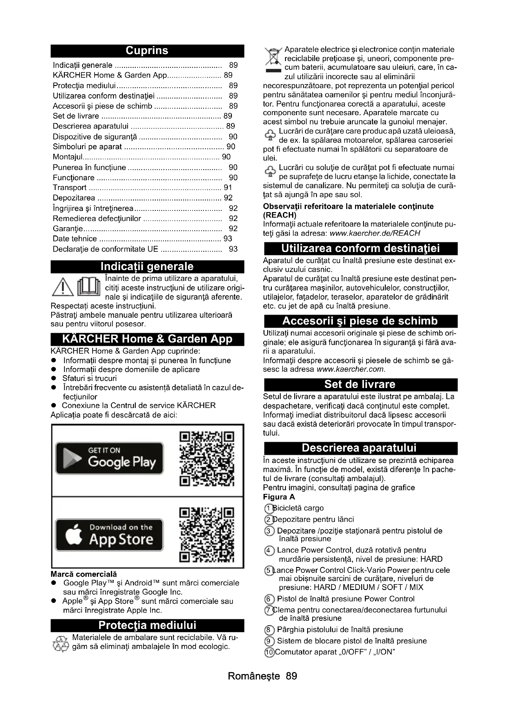 dB(A) 90 Chairman of the Board of Management Director Regulatory Affairs & Certification H. Jenner S. ReiserRomâneşte 89 Cuprins Indicații generale Înainte de prima utilizare a aparatului, citiţi aceste instrucţiuni de utilizare origi- nale şi indicaţiile de siguranţă aferente. Respectați aceste instrucțiuni. Păstraţi ambele manuale pentru utilizarea ulterioară sau pentru viitorul posesor. KÄRCHER Home & Garden App KÄRCHER Home & Garden App cuprinde: Informații despre montaj și punerea în funcțiune Informații despre domeniile de aplicare Sfaturi si trucuri Întrebări frecvente cu asistență detaliată în cazul de- fecțiunilor Conexiune la Centrul de service KÄRCHER Aplicația poate fi descărcată de aici: Marcă comercială Google Play™ şi Android™ sunt mărci comerciale sau mărci înregistrate Google Inc. Apple