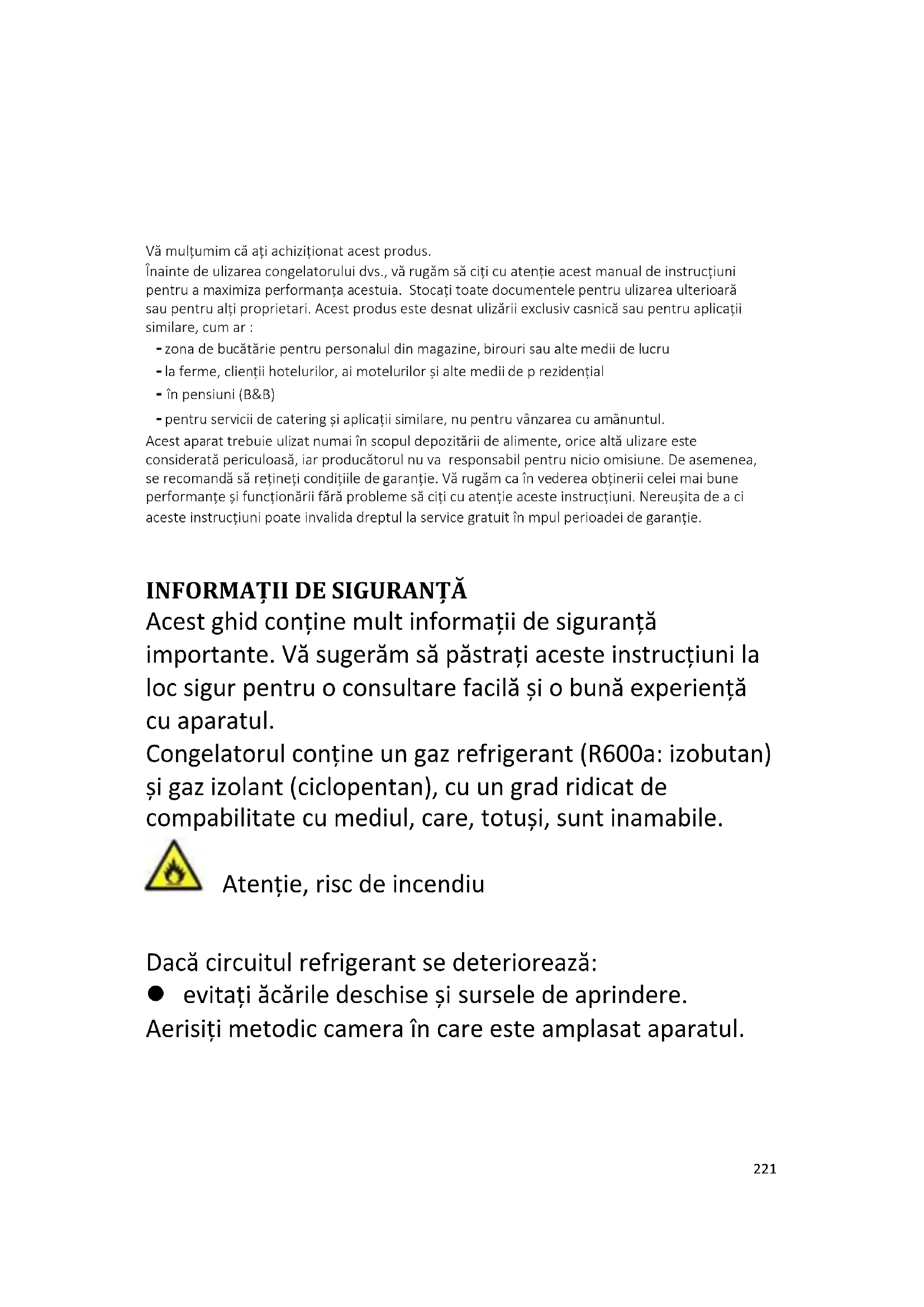 Acest ghid conține mult informații de siguranță importante. Vă sugerăm să păstrați aceste instrucțiuni la loc sigur pentru o consultare facilă și o bună experiență cu aparatul. Congelatorul conține un gaz refrigerant (R600a: izobutan) și gaz izolant (ciclopentan), cu un grad ridicat de compatibilitate cu mediul, care, totuși, sunt inflamabile. Atenție, risc de incendiu Dacă circuitul refrigerant se deteriorează: evitați flăcările deschise și sursele de aprindere. Aerisiți metodic camera în care este amplasat aparatul. Timp de funcționare procentual: 18℃:Timp de funcționare 11 min, oprire 20 min222 AVERTISMENT! Trebuie să fiți atenți în timp ce curățați/transportați aparatul pentru a evita atingerea anselor metalice ale condensatorului din spatele aparatului, întrucât vă puteți vătăma degetele și mâinile sau deteriora produsul. Acest aparat nu este conceput pentru suprapunerea cu alt aparat. Nu încercați să vă așezați sau să stați în picioare pe aparat, întrucât nu este conceput pentru o astfel de utilizare. Vă puteți răni sau deteriora aparatul. Asigurați-vă că cablul de alimentare nu este prins sub aparat în timpul și după transportarea/deplasarea aparatului, pentru a evita tăierea sau deteriorarea acestuia. Atunci când poziționați aparatul, aveți grijă să nu deteriorați podeaua, țevile, vopseaua de pe pereți etc. Nu mutați aparatul prin tragerea capacului sau a mânerului. Nu lăsați copiii să se joace cu aparatul sau cu comenzile. Compania noastră refuză să accepte orice responsabilitate în cazul în care instrucțiunile nu sunt respectate. Nu instalați aparatul în locuri umede, uleioase sau pline de praf, nu îl expuneți la lumina directă și la apă. Nu instalați aparatul în apropierea caloriferelor sau a materialelor inflamabile. Dacă există o cădere de tensiune, nu deschideți capacul. Alimentele congelate nu ar trebui să fie223 afectate dacă întreruperea durează mai puțin de 20 de ore. Dacă întreruperea este mai lungă, atunci alimentele trebuie verificate și consumate imediat sau gătite și apoi congelate. Dacă descoperiți că capacul lăzii frigorifice este greu de deschis chiar după ce l-ați închis, nu vă faceți griji. Aceasta se datorează diferenței de presiune care va egaliza și va lăsa capacul să fie deschis normal după câteva minute. Nu conectați aparatul la alimentarea cu curent până când nu ați îndepărtat toate ambalajele și protecțiile de transport. Lăsați-l să stea timp de cel puțin 4 ore înainte de a- l porni pentru a permite uleiului din compresor să se așeze dacă este transportat orizontal. Acest congelator trebuie utilizat numai în scopul prevăzut (adică, depozitare și congelarea alimentelor comestibile). Nu depozitați medicamente sau materiale de cercetare în Răcitoarele de vin. Atunci când se vor depozita materiale care necesită un control strict al temperaturilor de depozitare, este posibil ca acesta să se deterioreze sau poate surveni o reacție necontrolată care poate cauza riscuri. Înainte de a efectua orice operațiune, deconectați cablul de alimentare de la priză. La livrare, verificați pentru a vă asigura că produsul nu este deteriorat și că toate piesele și accesoriile sunt în stare perfectă.224 Dacă se observă o scurgere în sistemul de refrigerare, nu atingeți priza de perete și nu utilizați flăcări deschise. Deschideți fereastra și lăsați să intre aerul în cameră. Apoi apelați un centru de service pentru a solicita reparații. Nu utilizați prelungitoare sau adaptoare. Nu trageți excesiv sau nu îndoiți cablul de alimentare cu mâinile ude. Nu deteriorați priza și/sau cablul de alimentare; aceasta poate determina electrocutarea sau incendiul. Dacă este deteriorat cablul de alimentare, acesta trebuie înlocuit de către producător, de inginerii săi de service sau de ingineri calificați similar pentru a evita pericolul. Nu amplasați sau nu depozitați materiale inflamabile și extrem de volatile, cum ar fi eter, petrol, LPG, gaz propan, tuburi cu aerosoli, adezivi, alcool pur etc. Aceste materiale pot cauza o explozie. Nu utilizați sau nu depozitați sprayuri inflamabile, cum ar fi spray cu vopsea, în apropierea Răcitoarelor de vin. Aceasta poate cauza o explozie sau un incendiu. Nu amplasați obiecte și/sau recipiente umplute cu apă deasupra aparatului. Nu recomandăm utilizarea prelungitoarelor și a adaptoarelor multidirecționale. Nu eliminați aparatul într-un foc. Aveți grijă să nu225 deteriorați circuitele/țevile de răcire ale aparatului în timpul transportului și al utilizării. În cazul deteriorării, nu expuneți aparatul la foc, potențiale surse de aprindere și aerisiți imediat camera unde este amplasat aparatul. Sistemul de refrigerare poziționat în spatele și în interiorul Răcitoarelor de vin conțin agent refrigerant. Prin urmare, evitați deteriorarea tuburilor. Nu utilizați aparate electrice în interiorul compartimentelor de depozitare a alimentelor ale aparatului decât dacă acestea sunt de tipul recomandat de către producător. Nu deteriorați circuitul refrigerant. Nu utilizați dispozitive mecanice sau alte mijloace de a accelera procesul de decongelare, diferite de cele recomandate de producător. Nu utilizați aparate electrice în interiorul compartimentelor de depozitare a alimentelor decât dacă acestea sunt de tipul recomandat de către producător. Nu atingeți elementele de răcire interne, în special dacă aveți mâinile ude, deoarece vă puteți arde sau răni. Mențineți fantele de aerisire ale carcasei aparatului sau încorporate în structură fără obstrucțiuni. Nu utilizați obiecte cu vârf sau ascuțite, cum ar fi cuțitele sau furculițele pentru a îndepărta stratul226 de congelat. Nu utilizați niciodată uscătoare de păr, încălzitoare electrice sau alte astfel de aparate electrice pentru decongelare. 