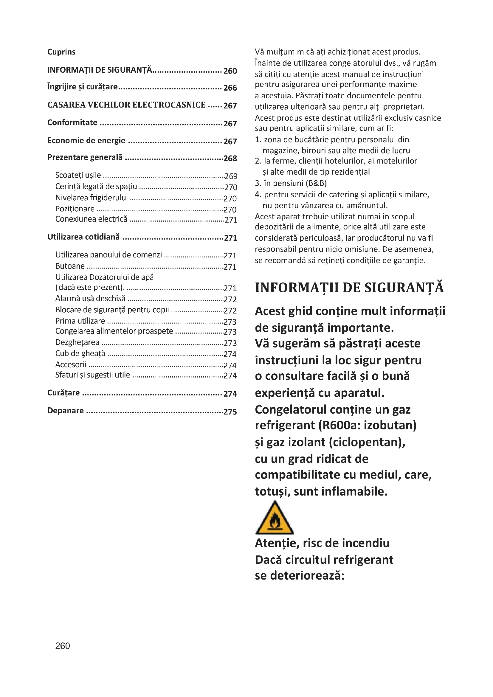 Acest ghid conține mult informații de siguranță importante. Vă sugerăm să păstrați aceste instrucțiuni la loc sigur pentru o consultare facilă și o bună experiență cu aparatul. Congelatorul conține un gaz refrigerant (R600a: izobutan) și gaz izolant (ciclopentan), cu un grad ridicat de compatibilitate cu mediul, care, totuși, sunt inflamabile. Atenție, risc de incendiu Dacă circuitul refrigerant se deteriorează: