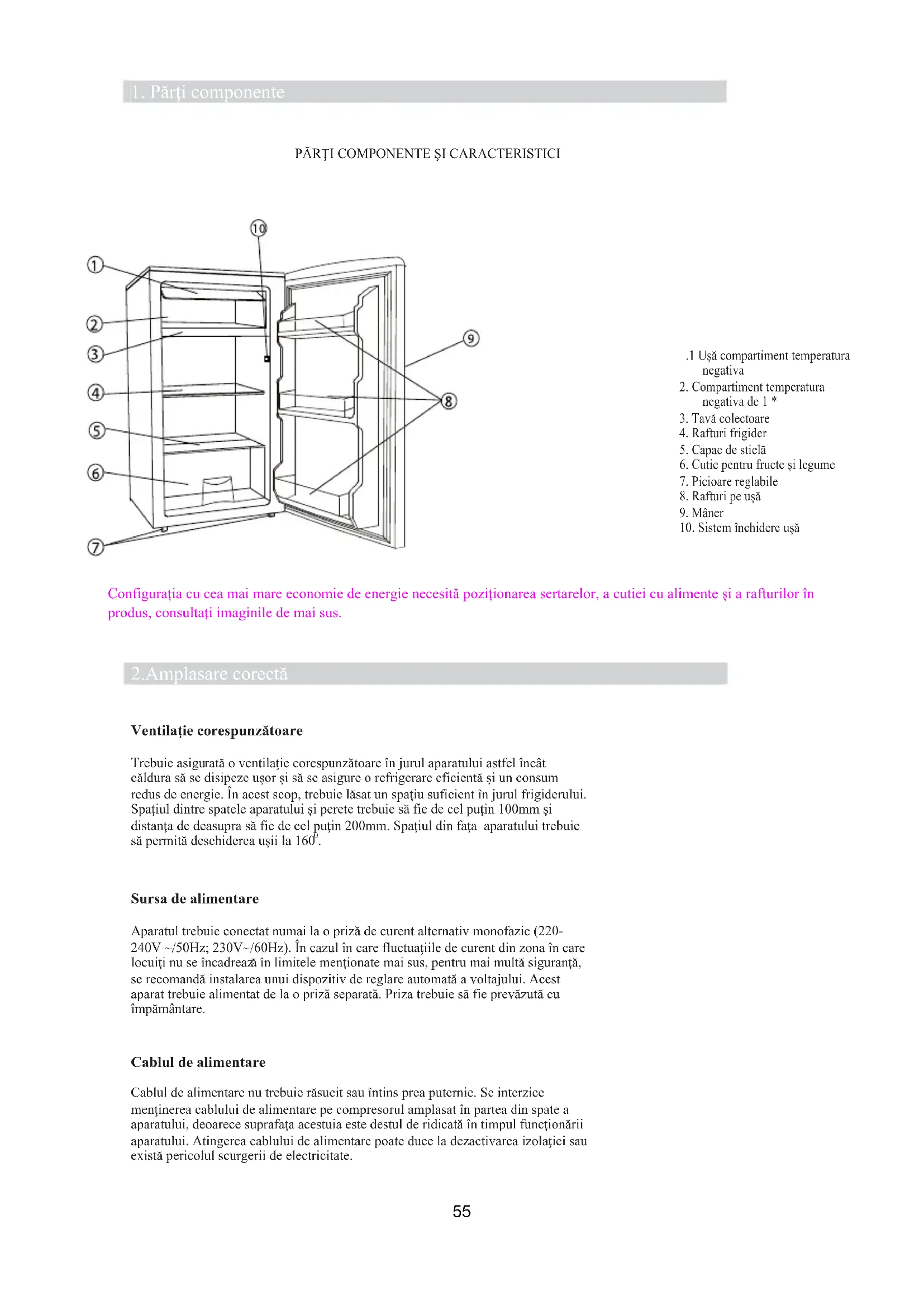 - în ceea ce privește un aparat frigorific de sine-stătător: „acest aparat frigorific nu este destinat a fi utilizat ca aparat încorporat”;541. Pri componente PRI COMPONENTE I CARACTERISTICI .1 U compartiment temperatura negativa 2. Compartiment temperatura negativa de 1 * 3. Tav colectoare 4. Rafturi frigider 5. Capac de sticl 6. Cutie pentru fructe i legume7. Picioare reglabile 8. Rafturi pe u 9. Mâner10. Sistem închidere u 2.Amplasare corect Ventilaie corespunztoare Trebuie asigurat o ventilaie corespunztoare în jurul aparatului astfel încât cldura s se disipeze uor i s se asigure o refrigerare eficient i un consum redus de energie. În acest scop, trebuie lsat un spaiu suficient în jurul frigiderului. Spaiul dintre spatele aparatului i perete trebuie s fie de cel puin 100mm i distana de deasupra s fie de cel puin 200mm. Spaiul din faa aparatului trebuie s permit deschiderea uii la 160