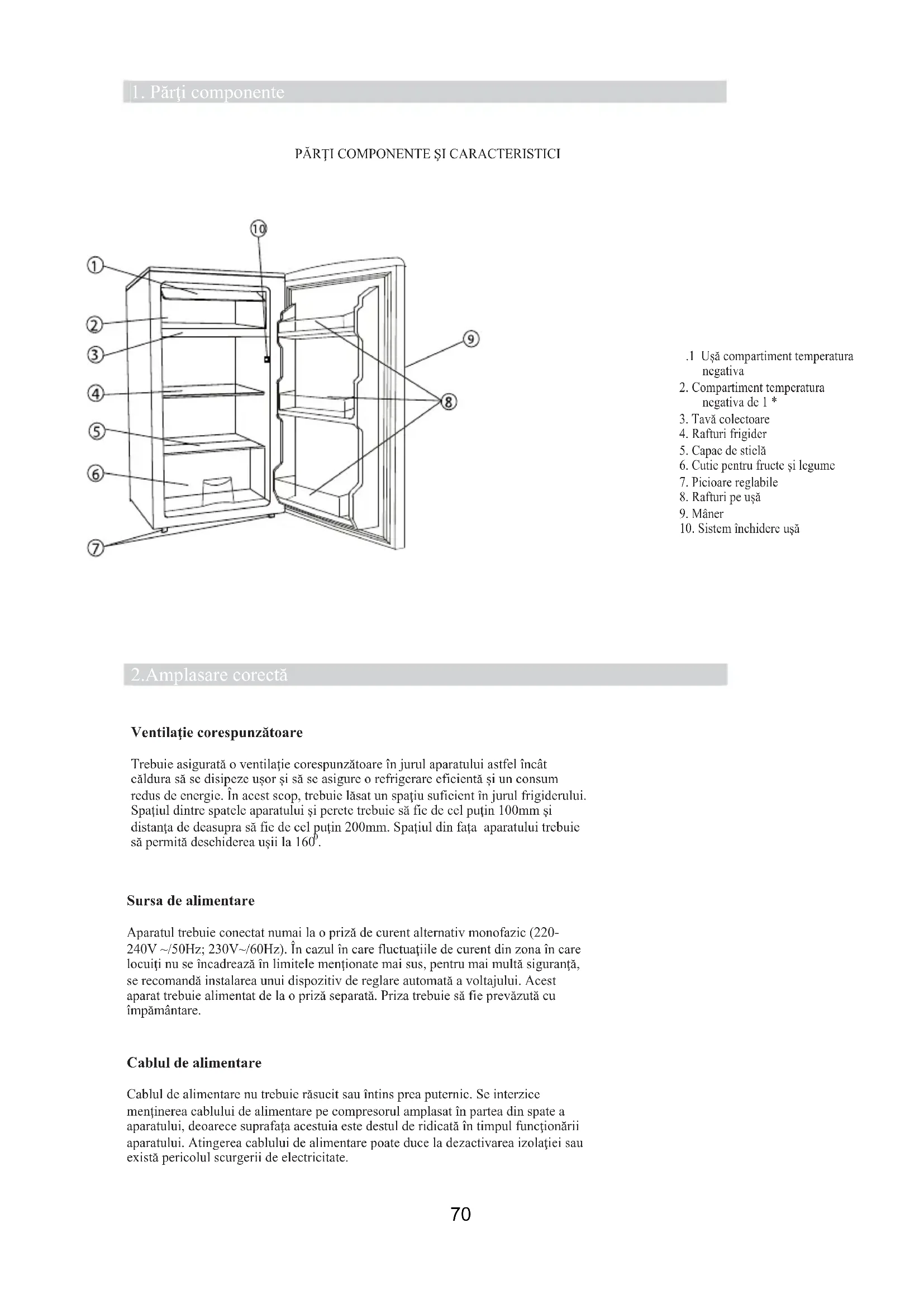 57585962636566ROMANIAN Vă mulțumim că aţi cumpărat acest produs. Înainte de a utiliza frigiderul, citiți cu atenție acest manual de instrucțiuni pentru a obține o performanță maximă. Păstrați toate documentele pentru o utilizare ulterioară sau pentru alți proprietari ai produsului. Acest produs este destinat exclusiv uzului casnic sau unor aplicații similare, cum ar fi: - zona de bucătărie pentru angajații unui magazin, birou sau altor medii de lucru; - în ferme, de către clienții hotelurilor, motelurilor sau altor medii de tip rezidențial; - la unități de cazare cu mic dejun inclus (bed and breakfast -B&B) - Pentru servicii de catering și aplicații similare și nu pentru vânzarea cu amănuntul. Aparatul trebuie utilizat doar pentru a depozita alimente și orice altă utilizare este considerată periculoasă, iar producătorul nu va fi răspunzător pentru nicio omisiune. De asemenea se recomandă să citiți condițiile privind garanția. Frigiderul conține un gaz de răcire (R600a: izobutan) și un gaz izolant (ciclopentan), care nu afectează în niciun fel mediul dar care sunt inflamabile. Vă recomandăm să respectați următoarele reguli pentru a evita situațiile care vă pot pune în pericol: Înainte de a efectua orice operație, scoateți cablul de alimentare din priza de curent. x Sistemul de răcire amplasat în spatele și în interiorul aparatului conține un agent de răcire. Prin urmare, evitați deteriorarea țevilor. x Dacă se observă o scurgere în sistemul de răcire, nu atingeți priza de perete și nu folosiți flacără deschisă. Deschideţi fereastra și lăsați aerul curat să pătrundă în încăpere. Apoi apelați un centru de service pentru a solicita repararea aparatului. x Nu folosiți cuțite sau alte obiecte ascuțite pentru a îndepărta gheața formată. Acestea pot deteriora circuitul de răcire, iar scurgerea acestuia poate duce la apariția unui incendiu sau vă poate afecta ochii. x Nu instalați aparatul în locuri cu umezeală, grăsimi sau praf și nu îl expuneți la razele directe ale soarelui sau la apă. x Nu instalați aparatul în apropierea radiatoarelor sau materialelor inflamabile. x Nu folosiţi prelungitoare sau adaptoare. x Nu trageţi excesiv de cablul de alimentare, nu îl îndoiți și nu atingeți ștecherul cu mâinile ude. x Nu deteriorați ștecherul și/sau cablul de alimentare, deoarece astfel se pot produce electrocutări sau incendii. x Se recomandă să mențineți ștecherul curat; orice reziduuri excesive de praf de pe acesta pot conduce la apariția unui incendiu. x Nu utilizați dispozitive mecanice sau alte echipamente pentru a grăbi procesul de dezghețare. 67x Evitați sub orice formă utilizarea flăcării deschise sau a echipamentelor electrice, cum ar fi radiatoare, aparate de curățat cu aburi, lumânări, lămpi cu petrol și altele pentru a grăbi etapa de dezghețare. x Nu utilizați și nu depozitați sprayuri inflamabile, cum ar fi sprayurile cu vopsea, în apropierea aparatului, deoarece ar putea produce o explozie sau un incendiu. x Nu utilizați aparatură electrocasnică în interiorul compartimentelor de depozitare a alimentelor, cu excepția cazului când aparțin categoriei recomandate de către producător. x Nu așezați și nu depozitați materiale inflamabile sau foarte volatile, ca de exemplu eter, benzină, GPL, gaz propan, recipiente pentru pulverizare cu aerosoli, adezivi, alcool pur etc. Aceste materiale pot produce o explozie. x Nu depozitați medicamente sau materiale de cercetare în aparatul electrocasnic. Atunci când trebuie depozitat un material care necesită un control strict al temperaturii de depozitare, este posibil ca acesta să se deterioreze sau să aibă loc o reacție necontrolată care să implice riscuri. x Nu obstrucționați orificiile de ventilație din carcasa aparatului sau din structura incorporabilă. x Nu așezați obiecte și/sau recipiente umplute cu apă pe partea superioară a aparatului. x Nu efectuați reparații asupra acestui aparat electrocasnic. Toate intervențiile trebuie efectuate doar de către personal calificat. x Acest aparat poate fi folosit de copii cu vârste de peste 8 ani și de persoane cu abilităţi fizice, senzoriale sau mentale sau lipsite de experienţă și cunoștinţe doar dacă sunt supravegheate sau instruite corespunzător cu privire la utilizarea în siguranţă a aparatului și dacă înţeleg pericolele aferente. x Este interzis copiilor să se joace cu acest aparat. Curăţarea și întreţinerea efectuate de către utilizator nu se vor face de către copii fără a fi supravegheaţi 68691. Pri componente PRI COMPONENTE I CARACTERISTICI .1 U compartiment temperatura negativa 2. Compartiment temperatura negativa de 1 * 3. Tav colectoare 4. Rafturi frigider 5. Capac de sticl 6. Cutie pentru fructe i legume 7. Picioare reglabile 8. Rafturi pe u 9. Mâner 10. Sistem închidere u