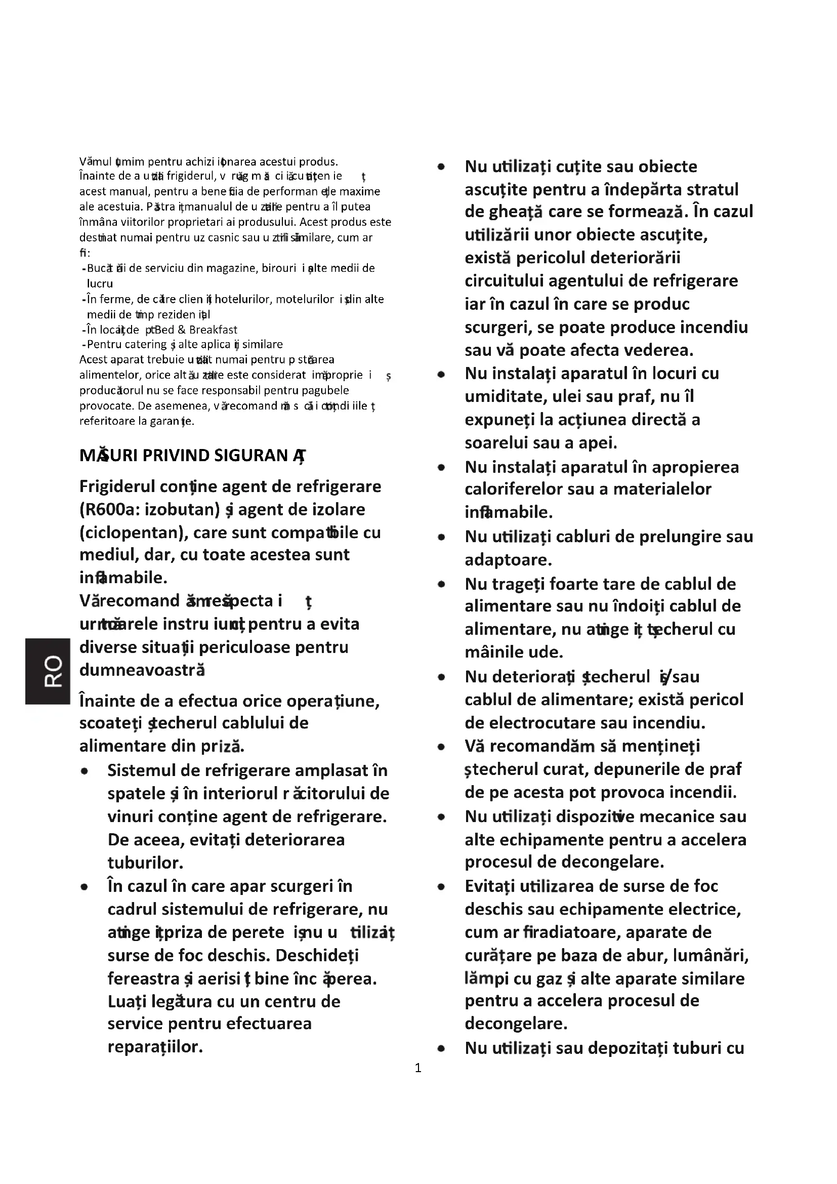 Frigiderul con ine agent de refrigerare (R600a: izobutan) i agent de izolare (ciclopentan), care sunt compa bile cu mediul, dar, cu toate acestea sunt in amabile. V recomand s respecta i ur toarele instru iuni pentru a evita diverse situa ii periculoase pentru dumneavoastr : Înainte de a efectua orice opera iune, scoate i techerul cablului de alimentare din pr . Sistemul de refrigerare amplasat în spatele i în interiorul r citorului de vinuri con ine agent de refrigerare. De aceea, evita i deteriorarea tuburilor. În cazul în care apar scurgeri în cadrul sistemului de refrigerare, nu a nge i priza de perete i nu u i surse de foc deschis. Deschide i fereastra i aerisi i bine înc perea. Lua i leg tura cu un centru de service pentru efectuarea repara iilor. Nu u i cu ite sau obiecte ascu ite pentru a îndep rta stratul de ghea care se forme . În cazul u rii unor obiecte ascu ite, exist pericolul deterior rii circuitului agentului de refrigerare iar în cazul în care se produc scurgeri, se poate produce incendiu sau v poate afecta vederea. Nu instala i aparatul în locuri cu umiditate, ulei sau praf, nu îl expune i la a iunea direct a soarelui sau a apei. Nu instala i aparatul în apropierea caloriferelor sau a materialelor in amabile. Nu u i cabluri de prelungire sau adaptoare. Nu trage i foarte tare de cablul de alimentare sau nu îndoi i cablul de alimentare, nu a nge i techerul cu mâinile ude. Nu deteriora i techerul i/sau cablul de alimentare; exist pericol de electrocutare sau incendiu. V recomand s men ine i techerul curat, depunerile de praf de pe acesta pot provoca incendii. Nu u i dispozi ve mecanice sau alte echipamente pentru a accelera procesul de decongelare. Evita i u rea de surse de foc deschis sau echipamente electrice, cum ar radiatoare, aparate de cur are pe baza de abur, lumân ri, pi cu gaz i alte aparate similare pentru a accelera procesul de decongelare. Nu u i sau depozita i tuburi cu2 spray in bile, cu ar tuburi pentru pictur , în apropierea r citorului de vinuri. Pericol de explozie sau incendiu. Nu u i aparate electrice în interiorul co par entelor pentru depozitarea entelor, altele decât cele reco ndate de c tre produc tor. Nu plasa i sau nu depozita i teriale in bile sau foarte vola e cu ar eter, pertrol, GPL, gaz propan, recipiente cu aerosoli sub presiune, produse adezine, alcool pur etc. Aceste teriale reprezint pericol de explozie. Nu depozita i edic ente sau teste de laborator în r citorul de vinuri. Dac terialul respec v necesit un control strict al te peraturii de depozitare, este posibil s se deterioreze sau s se produc o rea ie necontrolat , ceea ce reprezint un risc. Fantele de ven ie ale aparatului i cele ale obilierului în care este incorporat aparatul nu trebuie blocate. Nu a eza i obiecte i/sau recipiente u plute cu ap pe partea de sus a aparatului. Nu încerca i s repara i neavoastr aparatul. Orice interven ie trebuie efectuat de c tre personalul de la centrele de service autorizate. Acest aparat poate u zat de c tre copii cu vârsta re de 8 ani i de c tre persoane cu dizabilit i zice, senzoriale sau entale sau care nu cunosc odul de u re al acestuia nu sub stricta supraveghere a unui adult responsabil pentru siguran a acestora i nu dup ce li s-au explicat care sunt toate pericolele care decurg din u rea acestuia. Nu per te i copiilor s se joace cu aparatul sau s efectueze opera iuni de cur are sau între inere a acestuia. Copiii cu vârsta cuprins între 3 i 8 ani pot înc rca sau desc rca acest aparat. AVERTIZARE! Cablul de entare nu trebuie s e blocat sau deteriorat atunci când a eza i aparatul în pozi ie. AVERTIZARE! Nu plasa i ai ulte prize portabile sau surse de entare portabile în partea din spate a aparatului. Pentru a evita cont narea produselor entare, respecta i ur toarele instru iuni. Deschiderea u ii pentru perioade lungi de p poate duce la o cre tere se ni ca v a te peraturii în co par entele aparatului. Cur a i periodic suprafe ele care pot intra în contact cu produsele entare i siste ele de drenaj accesibile. Cur a i rezervoarele de ap , dac nu au fost u te p de 48 de ore; sp i siste ul de entare cu ap conectat la o surs de a3 dac nu s-a tras ap p de 5 zile. P stra i carnea crud i pe tele în recipiente adecvate în frigider, as el încât s nu intre în contact sau s picure pe alte produse entare. Co par entele pentru ente congelate cu dou stele (dac sunt reprezentate în aparat) sunt potrivite pentru depozitarea entelor pre-congelate, depozitarea sau fabricarea înghe atei i pentru fabricarea cuburilor de ghea . Co par entele cu una, dou i trei stele (dac sunt reprezentate în aparat) nu sunt potrivite pentru înghe area entelor proaspete. Dac aparatul r âne gol p îndelungat, opri i al entarea, dezghe a i-l, cur a i-l, usca i-l i sa i u a deschis pentru a piedica for rea ucegaiului în aparat. AVERTIZARE! În pul u rii, repara iilor i e in rii aparatului, v rug s acorda i aten ie s bolului de pe partea stâng , care se a pe spatele aparatului (panoul din spate sau co presorul). Este vorba de un si bol de aver re privind pericolul de incendiu. Conductele de r cire i co presorul con in teriale in a bile. ine i departe de sursele de foc în pul u rii, repara iilor i e n rii.