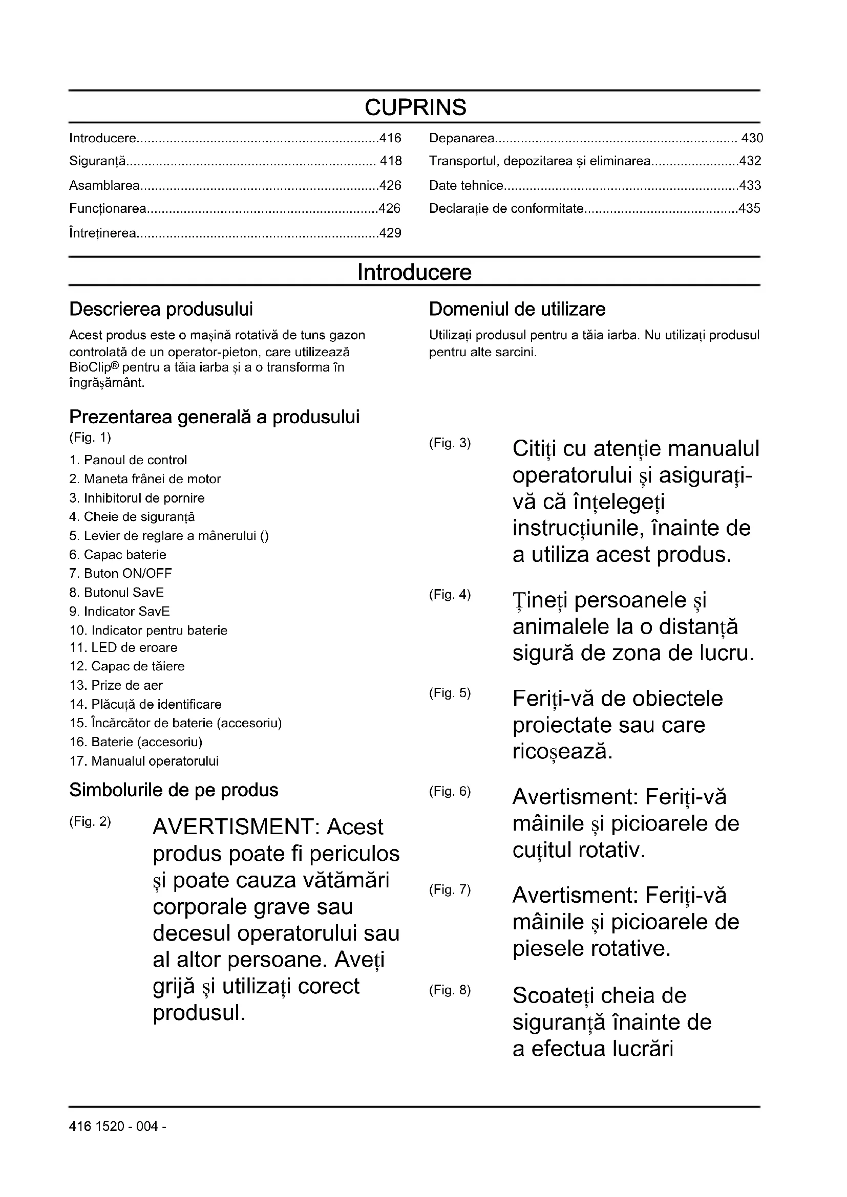 Simbolurile de pe produs (Fig. 2) AVERTISMENT: Acest produs poate fi periculos și poate cauza vătămări corporale grave sau decesul operatorului sau al altor persoane. Aveți grijă și utilizați corect produsul. (Fig. 3) Citiți cu atenție manualul operatorului și asigurați- vă că înțelegeți instrucțiunile, înainte de a utiliza acest produs. (Fig. 4) Țineți persoanele și animalele la o distanță sigură de zona de lucru. (Fig. 5) Feriți-vă de obiectele proiectate sau care ricoșează. (Fig. 6) Avertisment: Feriți-vă mâinile și picioarele de cuțitul rotativ. (Fig. 7) Avertisment: Feriți-vă mâinile și picioarele de piesele rotative. (Fig. 8) Scoateți cheia de siguranță înainte de a efectua lucrări 416 1520 - 004 -de reparații sau de întreținere. (Fig. 9) Marcaj privind mediul înconjurător.Produsul și ambalajul produsului nu pot fi tratate ca deșeuri menajere. Reciclați-l la o unitate de eliminare autorizată pentru echipamente electrice și electronice. (Fig. 10) Produsul este conform cu directivele CE aplicabile. (Fig. 11) Acest produs este în conformitate cu reglementările aplicabile din Regatul Unit. (Fig. 12) Produsul este conform cu directivele Uniunii Vamale Euro-Asiatice aplicabile. (Fig. 13) Produsul este conform cu directivele UkrSEPRO aplicabile. (Fig. 14) Produsul este conform cu directivele RCM aplicabile. Se aplică numai pentru AU/NZ (Fig. 15) Etichetă privind emisiile de zgomot în mediu, conform directivelor și reglementărilor din UE și Regatul Unit și legislației din New South Wales „Regulamentul privind măsurile de protecție a mediului (controlul zgomotului) din 2017”. Nivelul de putere sonoră garantat al produsului este specificat în Date tehnice la pagina 433