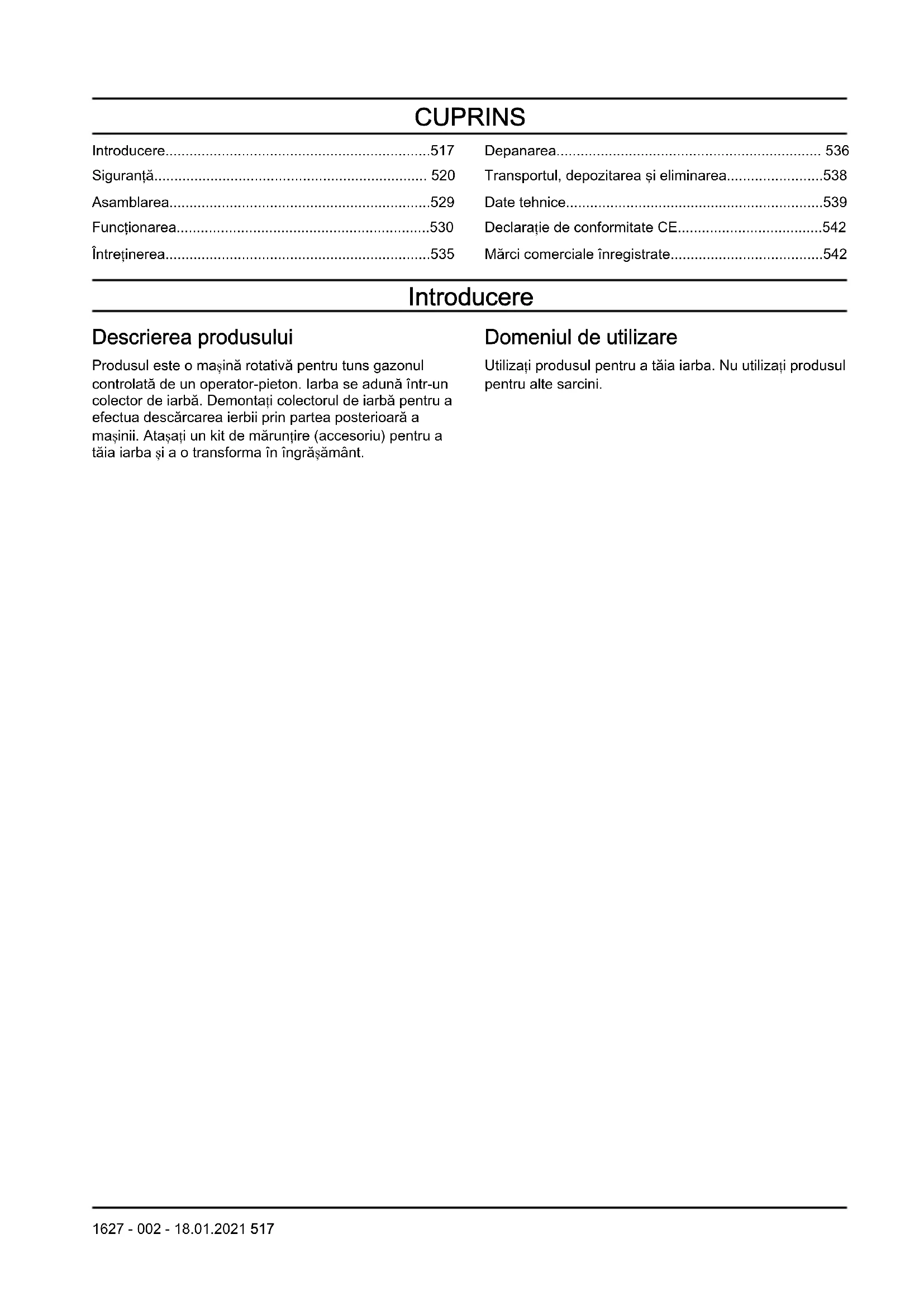 - Mărci comerciale înregistrate Introducere Descrierea produsului Produsul este o mașină rotativă pentru tuns gazonul controlată de un operator-pieton. Iarba se adună într-un colector de iarbă. Demontați colectorul de iarbă pentru a efectua descărcarea ierbii prin partea posterioară a mașinii. Atașați un kit de mărunțire (accesoriu) pentru a tăia iarba și a o transforma în îngrășământ. Domeniul de utilizare Utilizați produsul pentru a tăia iarba. Nu utilizați produsul pentru alte sarcini. 1627 - 002 - 18.01.2021 517Prezentarea generală a produsului p. 542