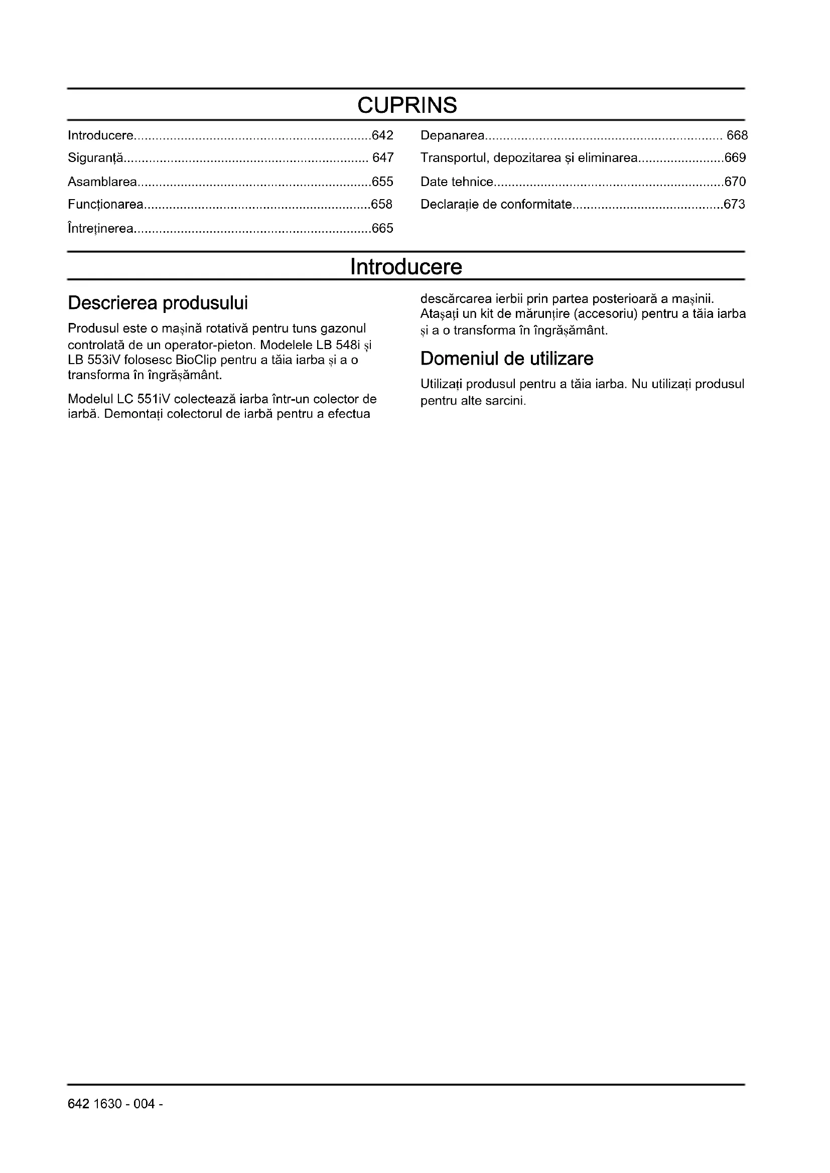 - Declarație de conformitate Introducere Descrierea produsului Produsul este o mașină rotativă pentru tuns gazonul controlată de un operator-pieton. Modelele LB 548i și LB553iV folosesc BioClip pentru a tăia iarba și a o transforma în îngrășământ. Modelul LC551iV colectează iarba într-un colector de iarbă. Demontați colectorul de iarbă pentru a efectua descărcarea ierbii prin partea posterioară a mașinii. Atașați un kit de mărunțire (accesoriu) pentru a tăia iarba și a o transforma în îngrășământ. Domeniul de utilizare Utilizați produsul pentru a tăia iarba. Nu utilizați produsul pentru alte sarcini. 642 1630 - 004 -Prezentare generală a produsului (LB548i, LC551iV) LB 548i LC 551iV p. 673