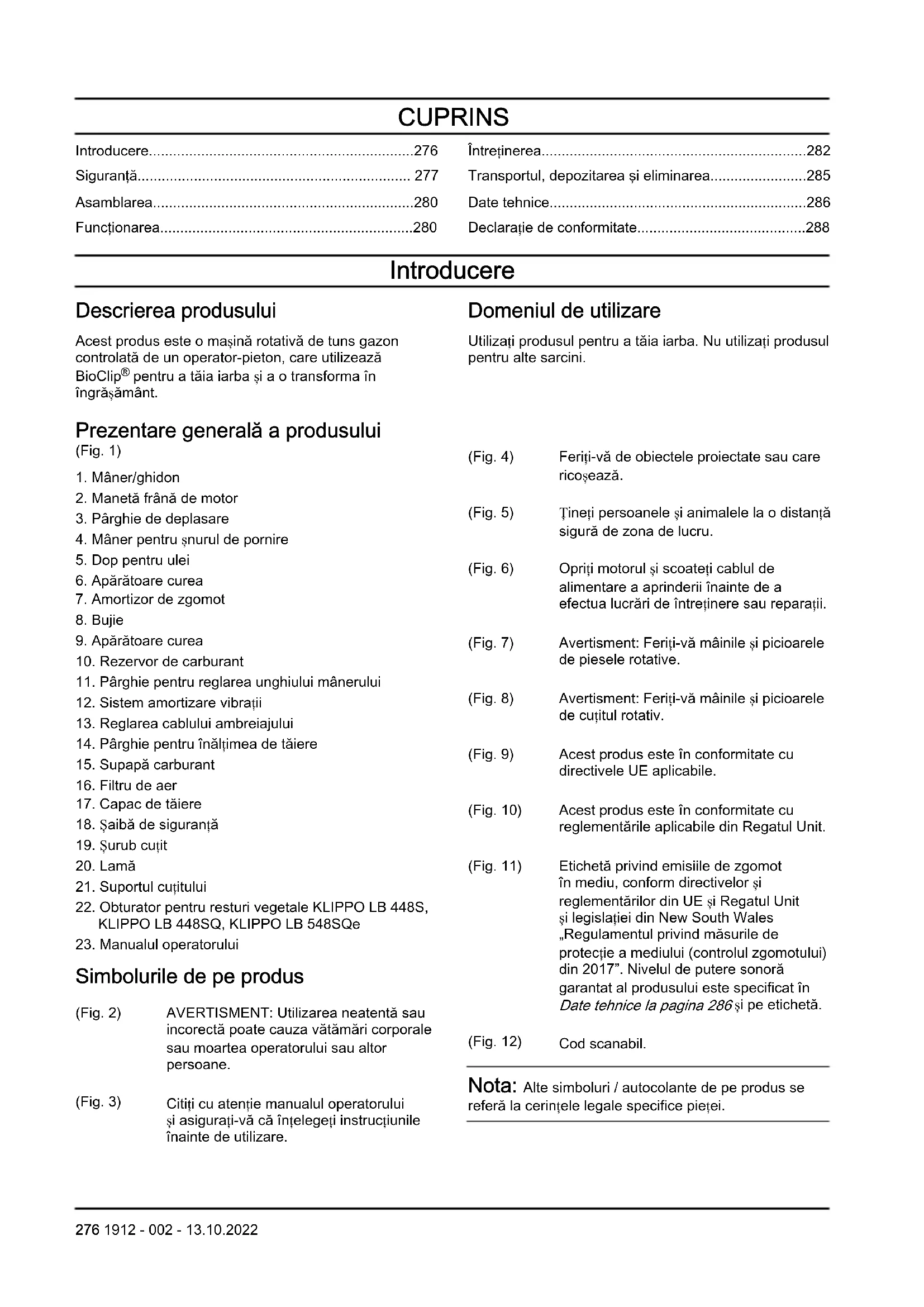 Simbolurile de pe produs (Fig. 2) AVERTISMENT: Utilizarea neatentă sau incorectă poate cauza vătămări corporale sau moartea operatorului sau altor persoane. (Fig. 3) Citiți cu atenție manualul operatorului și asigurați-vă că înțelegeți instrucțiunile înainte de utilizare. (Fig. 4) Feriți-vă de obiectele proiectate sau care ricoșează. (Fig. 5) Țineți persoanele și animalele la o distanță sigură de zona de lucru. (Fig. 6) Opriți motorul și scoateți cablul de alimentare a aprinderii înainte de a efectua lucrări de întreținere sau reparații. (Fig. 7) Avertisment: Feriți-vă mâinile și picioarele de piesele rotative. (Fig. 8) Avertisment: Feriți-vă mâinile și picioarele de cuțitul rotativ. (Fig. 9) Acest produs este în conformitate cu directivele UE aplicabile. (Fig. 10) Acest produs este în conformitate cu reglementările aplicabile din Regatul Unit. (Fig. 11) Etichetă privind emisiile de zgomot în mediu, conform directivelor și reglementărilor din UE și Regatul Unit și legislației din New South Wales „Regulamentul privind măsurile de protecție a mediului (controlul zgomotului) din 2017”. Nivelul de putere sonoră garantat al produsului este specificat în Date tehnice la pagina 286 și pe etichetă. (Fig. 12) Cod scanabil. Nota: Alte simboluri / autocolante de pe produs se referă la cerințele legale specifice pieței. 276 1912 - 002 - 13.10.2022Autocolant pe produs, numai pentru Australia și Noua Zeelandă (Fig. 13) Feriți-vă mâinile și picioarele de cuțitul rotativ. Emisiile de Euro V AVERTISMENT: În urma modificării neautorizate a motorului, este anulată aprobarea de tip UE pentru acest produs. Răspunderea pentru produs Conform prevederilor legislației privind răspunderea pentru produs, nu ne asumăm răspunderea pentru daunele cauzate de produsul nostru dacă: