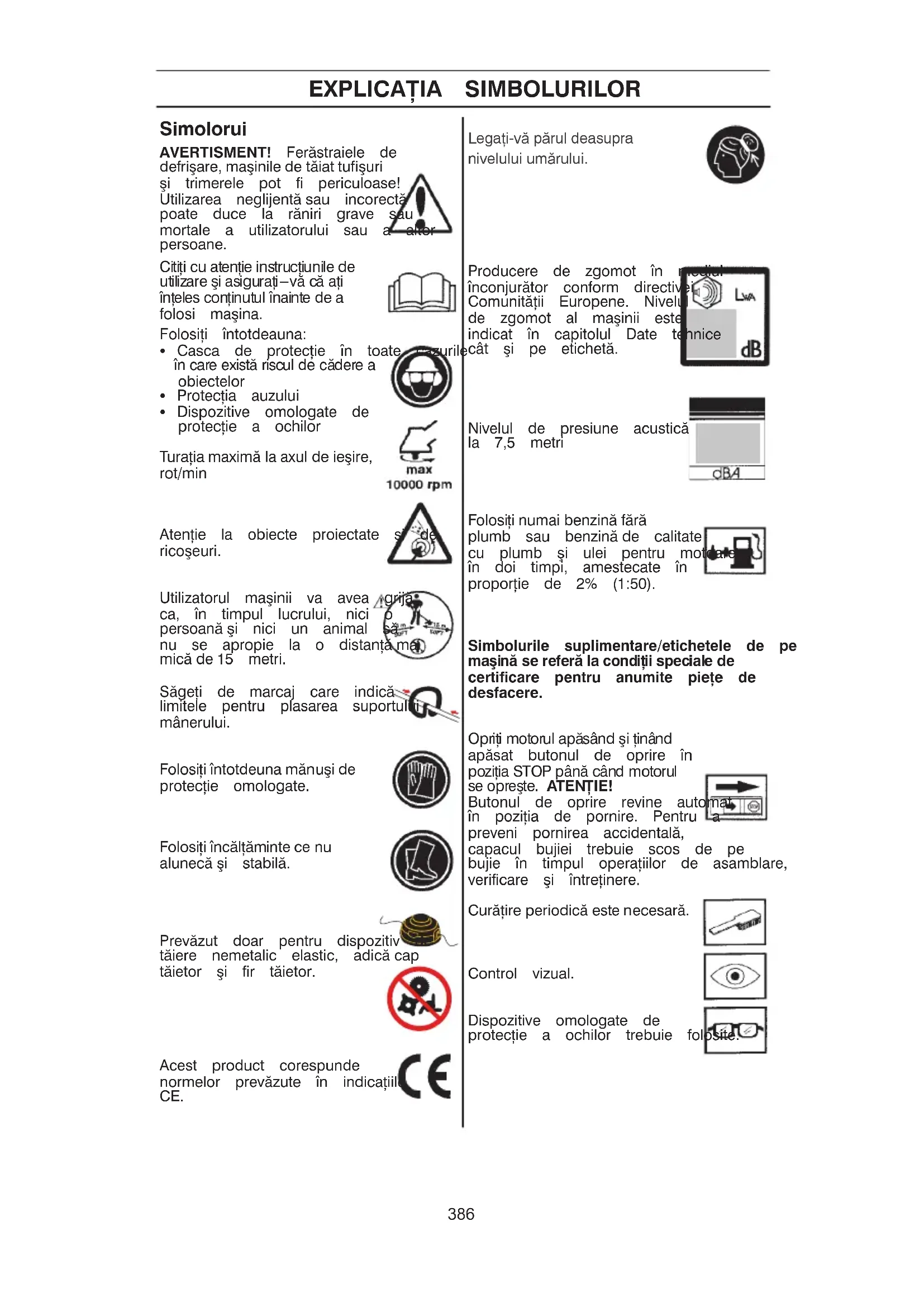 Mŷnuǧi se vor purta atunci când este necesar, spre exemplu la asamblarea dispozitivului de tŷiere. Echipament personal de protecƤia muncii AVERTISMENT! FiƤi întotdeau- na atent la semnale de alarmŷ sau strigŷte atunci când folosiƤi prote- cƤia auzului. ÎndepŷrtaƤi întotdeauna protecƤia auzului imediat ce aƤi oprit motorul. Important IMPORTANT! Maǧina este proiectatŷ numai pentru scurtarea ierbii. Singurele accesorii la care puteƤi folosi unitatea de motor ca ǧi o sursŷ de energie sunt acele dispozitive de tŷiere recomandate de noi în capitolul Date tehnice. Nu folosiƤi niciodatŷ maǧina dacŷ sunteƤi obosit, dacŷ aƤi bŷut alcool, sau dacŷ aƤi luat medicamente care vŷ influenƤeazŷ vederea, judecata, sau coordonarea miǧcŷrilor. PurtaƤi echipament individual de protcƤie. A se vedea instrucƤiunile de la paragraful Echipamentul individual de protecƤie. Nu folosiƤi niciodatŷ o maǧinŷ care a fost modificatŷ ǧi nu mai corespunde cunstrucƤiei originale. Nu folosiƤi niciodatŷ o maǧinŷ defectŷ. EfectuaƤi operaƤiile regulate de verificare, întreƤinere ǧi service descrise în acest manual. Unele operaƤii de întreƤinere ǧi service trebuiesc fŷcute de specialiǧti cu experienƤŷ ǧi calificaƤi. A se vedea instrucƤiu- nile de la paragraful ÎntreƤinere. Toate capacele ǧi protecƤiile trebuie sŷ fie montate înainte de pornire. ControlaƤi ca capacul aprinderii ǧi cablul aprinderii sŷ nu fie defecte. Existŷ risc pentru ǧoc electric. Utilizatorul maǧinii va avea grijŷ ca nici o persoanŷ sau animal sŷ nu se apropie mai mult de 15 metri de zona de lucru, în timpul lucrului. Atunci când mai multe persoane lucreazŷ pe aceiaǧi suprafaƤŷ de lucru se va avea grijŷ ca distanƤa de siguranƤŷ sŷ fie de cel puƤin de douŷ ori lungimea copacului care se va doborî, dar minim 15 metri. AVERTISMENT! Nu permiteƤi niciodatŷ copiilor sŷ utilizeze maǧina sau sŷ se afle în apropierea ei. Deoarece maǧina este prevŷzutŷ cu buton de oprire cu arc ǧi poate fi pornitŷ trŷgând cu vitezŷ ǧi forƤŷ mici de mânerului demarorului, în unele situaƤii chiar ǧi copiii mici pot dezvol- ta forƤa suficientŷ pentru a morni maǧina. Acest lucru poate avea ca rezultat vŷtŷmŷri corporale grave. De aceea, scoateƤi capacul bujiei atunci când maǧina nu este supravegheatŷ îndeaproape. AVERTISMENT! În timpul funcƤionŷrii, acest aparat produce un câmp electromagnetic. În anumite împrejurŷri, acest câmp poate interfera cu implanturile medicale active sau pasive. Pentru a reduce pericolul de rŷniri grave sau fatale, recomandŷm persoane- lor cu implanturi medicale sŷ consulte medicul ǧi producŷtorul de implanturi medicale înainte de a acƤiona aparatul. 389MŸSURI GENERALE DE PROTECƥIA MUNCII CIZME FolosiƤi încŷlƤŷminte ce nu alunecŷ ǧi stabilŷ.