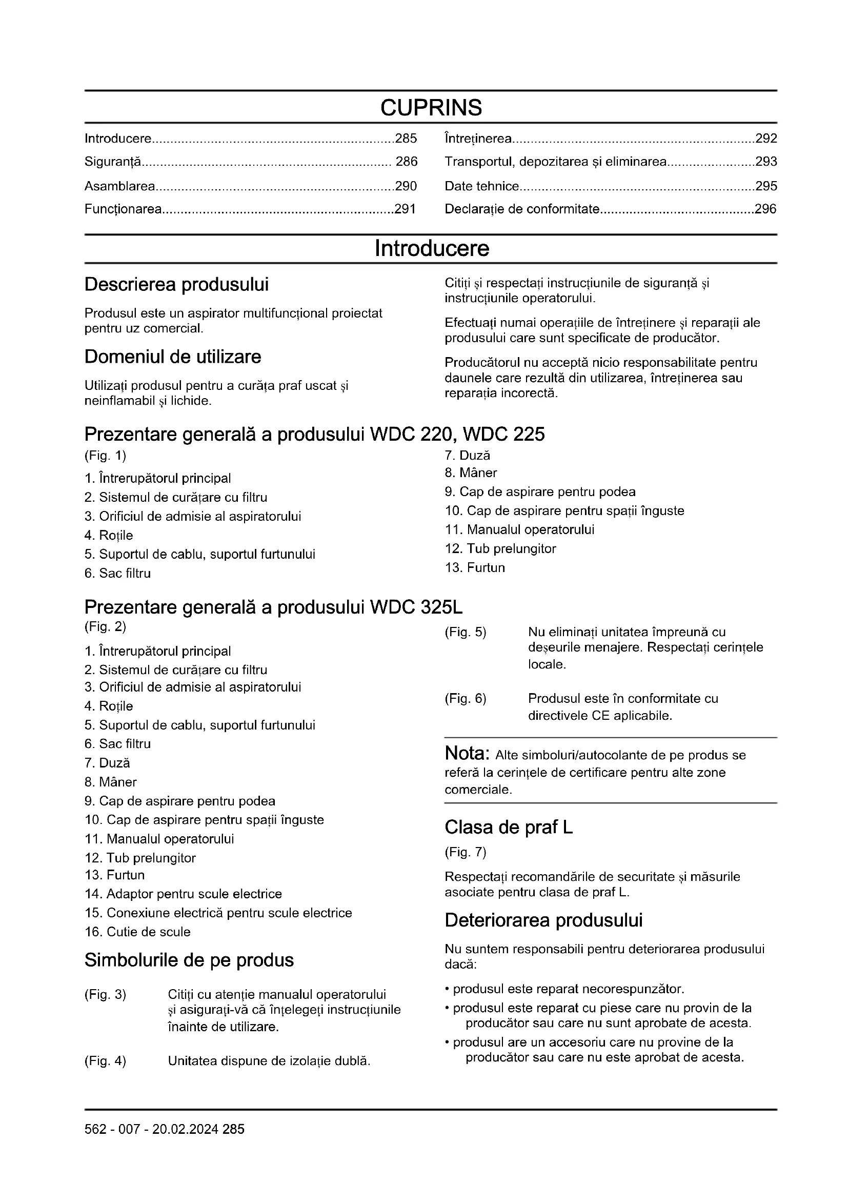 - Declarație de conformitate Introducere Descrierea produsului Produsul este un aspirator multifuncțional proiectat pentru uz comercial. Domeniul de utilizare Utilizați produsul pentru a curăța praf uscat și neinflamabil și lichide. Citiți și respectați instrucțiunile de siguranță și instrucțiunile operatorului. Efectuați numai operațiile de întreținere și reparații ale produsului care sunt specificate de producător. Producătorul nu acceptă nicio responsabilitate pentru daunele care rezultă din utilizarea, întreținerea sau reparația incorectă. Prezentare generală a produsului WDC 220, WDC 225 (Fig. 1) p. 296