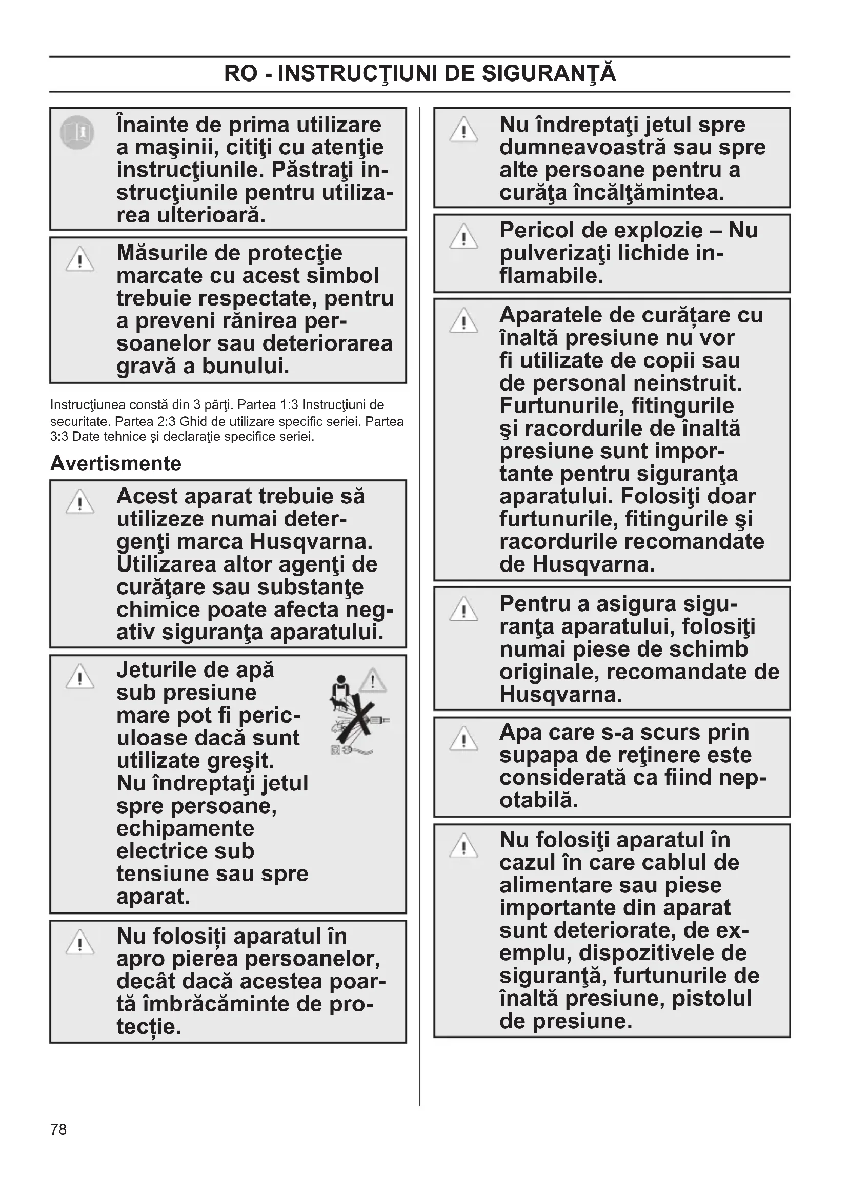 Înainte de prima utilizare a maşinii, citiţi cu atenţie instrucţiunile. Păstraţi in- strucţiunile pentru utiliza- rea ulterioară. Măsurile de protecţie marcate cu acest simbol trebuie respectate, pentru a preveni rănirea per- soanelor sau deteriorarea gravă a bunului. Instrucţiunea constă din 3 părţi. Partea 1:3 Instrucţiuni de securitate. Partea 2:3 Ghid de utilizare specic seriei. Partea 3:3 Date tehnice şi declaraţie specice seriei. Avertismente Acest aparat trebuie să utilizeze numai deter- genţi marca Husqvarna. Utilizarea altor agenţi de curăţare sau substanţe chimice poate afecta neg- ativ siguranţa aparatului. Jeturile de apă sub presiune mare pot peric- uloase dacă sunt utilizate greşit. Nu îndreptaţi jetul spre persoane, echipamente electrice sub tensiune sau spre aparat. Nu folosiți aparatul în apro pierea persoanelor, decât dacă acestea poar- tă îmbrăcăminte de pro- tecție. Nu îndreptaţi jetul spre dumneavoastră sau spre alte persoane pentru a curăţa încălţămintea. Pericol de explozie – Nu pulverizaţi lichide in- amabile. Aparatele de curățare cu înaltă presiune nu vor utilizate de copii sau de personal neinstruit. Furtunurile, tingurile şi racordurile de înaltă presiune sunt impor- tante pentru siguranţa aparatului. Folosiţi doar furtunurile, tingurile şi racordurile recomandate de Husqvarna. Pentru a asigura sigu- ranţa aparatului, folosiţi numai piese de schimb originale, recomandate de Husqvarna. Apa care s-a scurs prin supapa de reţinere este considerată ca ind nep- otabilă. Nu folosiţi aparatul în cazul în care cablul de alimentare sau piese importante din aparat sunt deteriorate, de ex- emplu, dispozitivele de siguranţă, furtunurile de înaltă presiune, pistolul de presiune. OM 1-3 Safety FINAL rev 1 draft.indd 78 2017-06-14 14:00:0079