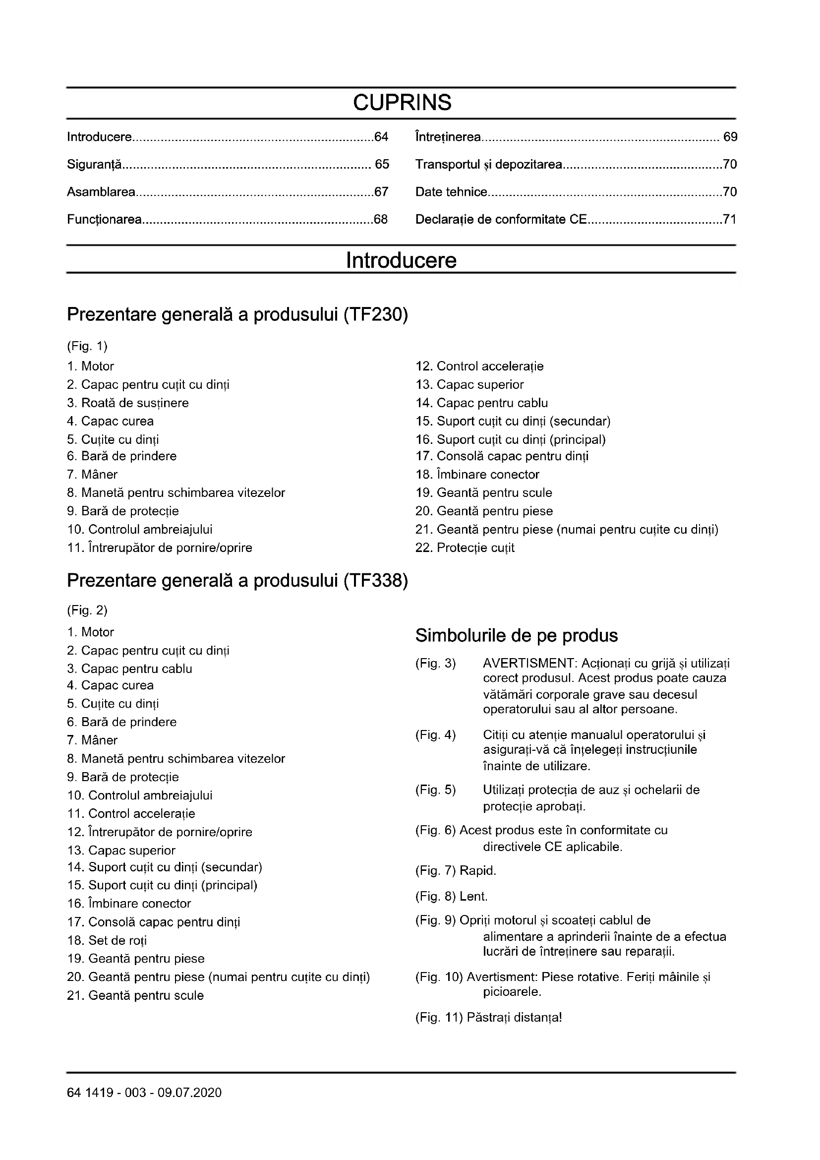 - Ne rezervăm dreptul de a modifica specificațiile și designurile fără notificare prealabilă, în vederea implementării de îmbunătățiri. Rețineți că informațiile din acest manual nu pot constitui o bază pentru niciun fel de acțiune în justiție. Pentru reparații, utilizați numai piese originale. Garanția este nevalidă dacă nu se utilizează piese originale. 1419 - 003 - 09.07.2020 65Instrucțiuni de siguranță pentru utilizare AVERTISMENT: Înainte de a utiliza produsul, citiți și înțelegeți instrucțiunile de avertizare de mai jos.
