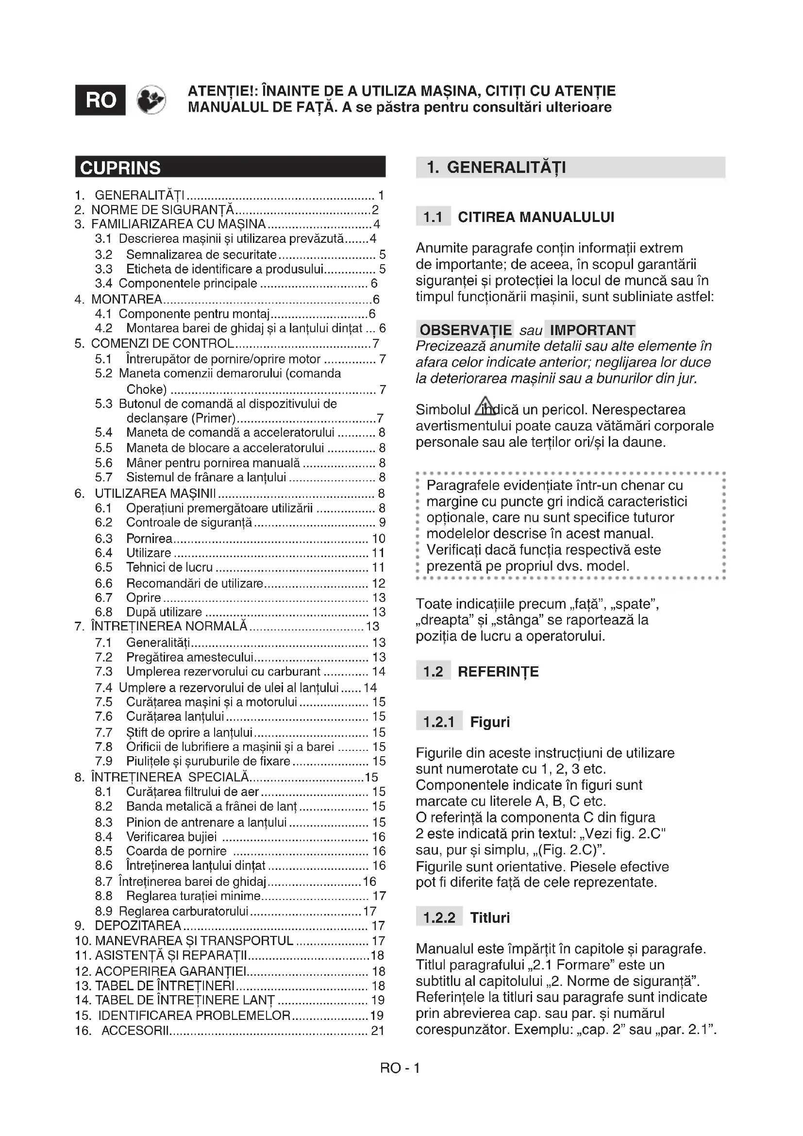 În „Tabelul pentru o asociere corectă bară-lanţ” sunt enumerate toate asocierile posibile dintre bară și lanţ, cele care se pot aplica pe ecare model de mașină în parte ind marcate cu simbolul „”. În același tabel mai sunt redate și datele caracteristice ale lanţurilor și barelor omologate pentru ecare model de mașină. Pentru piese de schimb, utilizați doar barele și lanțurile citate în tabel. Utilizarea combinațiilor neaprobate poate cauza vătămări corporale grave și deteriorarea mașinii. Având în vedere faptul că alegerea, aplicarea și utilizarea barei și a lanțului sunt acțiuni efectuate voluntar de către utilizator, acesta își asumă implicit și răspunderea pentru daunele de orice natură care decurg din aceste acțiuni. În caz de neclarități sau de necunoaștere a specicității ecărei bare sau lanț în parte, trebuie să vă contactați revânzătorul sau un centru de grădinărit specializat.RU - 1