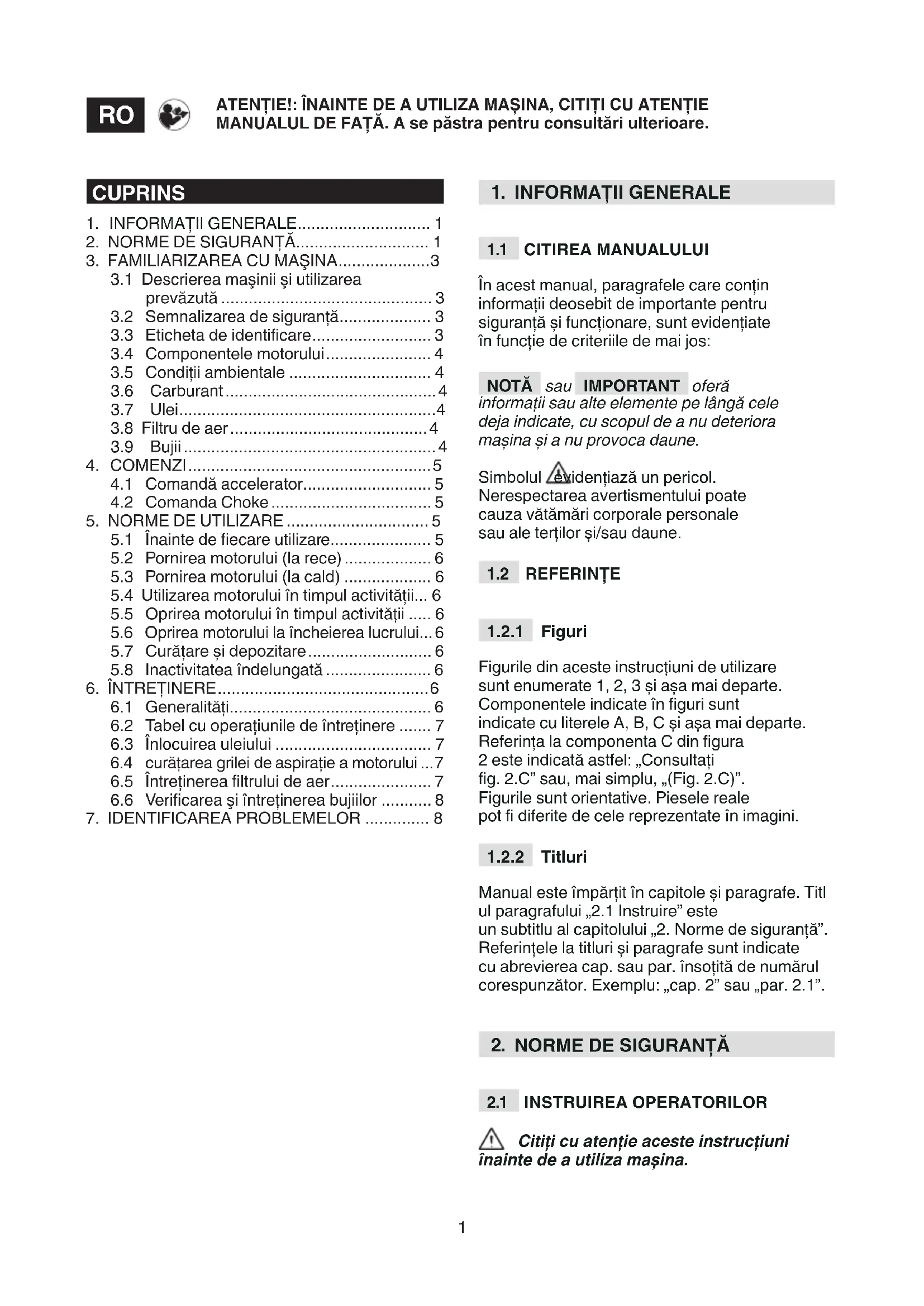 Această maşină este dotată cu motor cu combustie. Motorul este un element ale cărui performanțe, funcționare corectă și durată sunt condiționate de mulți factori, unii externi și unii legați în mod direct de calitatea produselor utilizate și de regularitatea cu care se efectuează operațiunile de întreținere. În continuare sunt prezentate informații suplimentare care au scopul de a asigura utilizarea corectă a mașinii. Orice altă utilizare poate periculoasă și poate provoca daune persoanelor și/sau bunurilor. IMPORTANT Utilizarea necorespunzătoare a mașinii atrage cu sine anularea garanției și declinarea oricărei responsabilități din partea Fabricantului, utilizatorul trebuind să suporte consecințele pentru daunele sau vătămarea personală ori a terților.