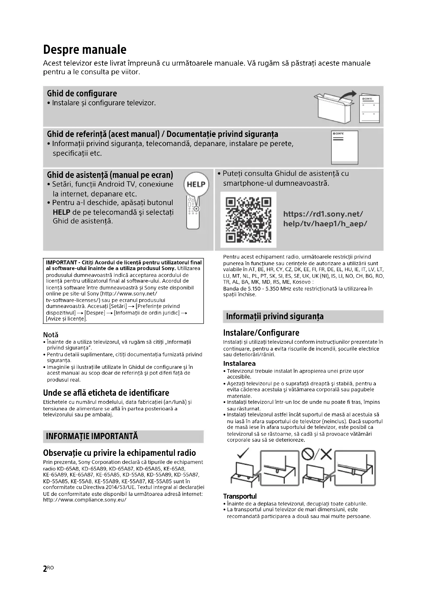 Observaţie cu privire la echipamentul radio Prin prezenta, Sony Corporation declară că tipurile de echipament radio KD-65A8, KD-65A89, KD-65A87, KD-65A85, KE-65A8, KE-65A89, KE-65A87, KE-65A85, KD-55A8, KD-55A89, KD-55A87, KD-55A85, KE-55A8, KE-55A89, KE-55A87, KE-55A85 sunt în conformitate cu Directiva 2014/53/UE. Textul integral al declarației UE de conformitate este disponibil la următoarea adresă internet: http://www.compliance.sony.eu/Pentru acest echipament radio, următoarele restricţii privind punerea în funcţiune sau cerinţele de autorizare a utilizării sunt valabile în AT, BE, HR, CY, CZ, DK, EE, FI, FR, DE, EL, HU, IE, IT, LV, LT, LU, MT, NL, PL, PT, SK, SI, ES, SE, UK, UK (NI), IS, LI, NO, CH, BG, RO, TR, AL, BA, MK, MD, RS, ME, Kosovo :Banda de 5.150 - 5.350 MHz este restricţionată la utilizarea în spaţii închise. Informaţii privind siguranţa Instalare/Configurare Instalaţi și utilizaţi televizorul conform instrucţiunilor prezentate în continuare, pentru a evita riscurile de incendii, șocurile electrice sau deteriorări/răniri. Instalarea