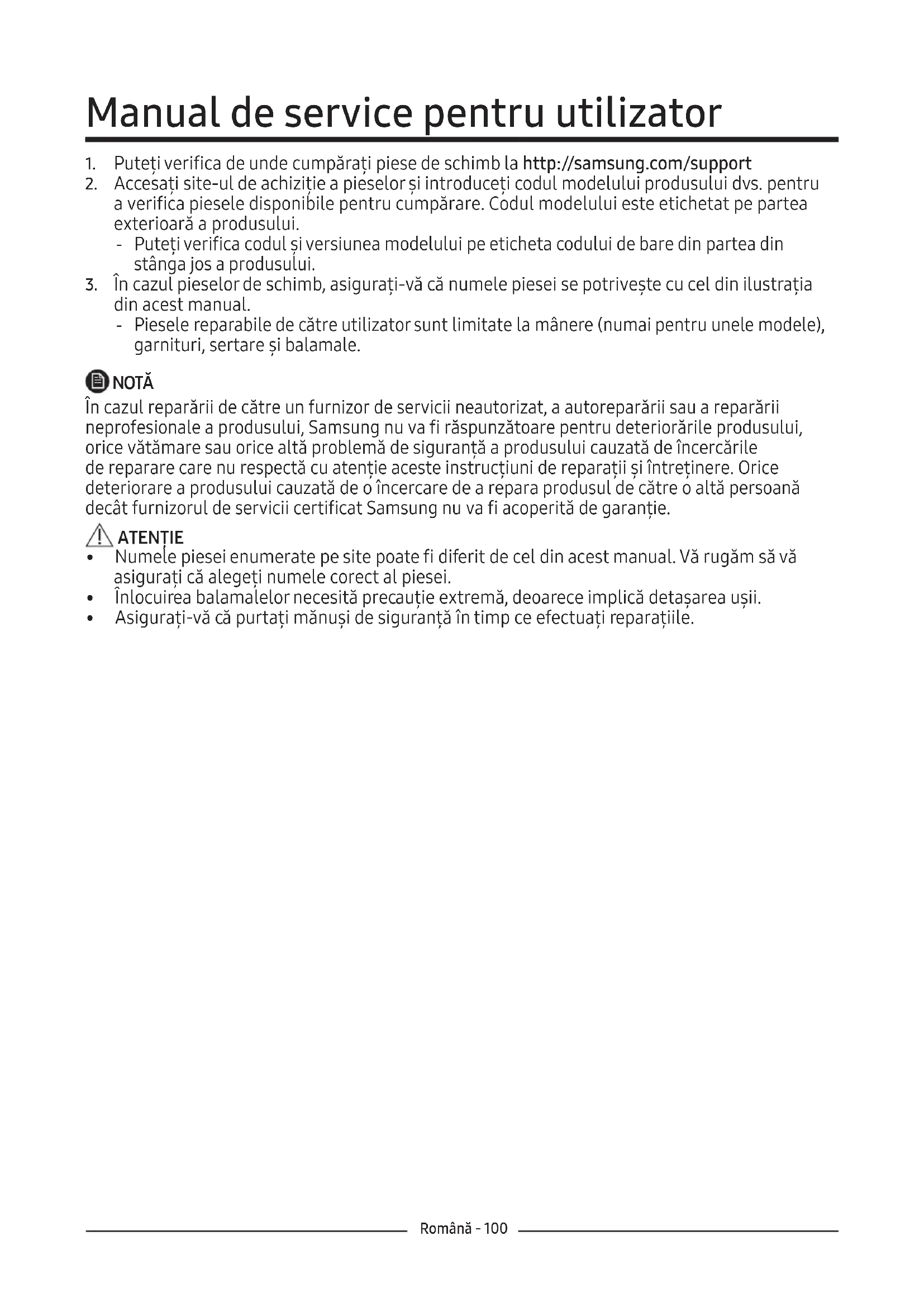 din acest manual. ‐ Piesele reparabile de către utilizator sunt limitate la mânere (numai pentru unele modele), garnituri, sertare și balamale. NOTĂ În cazul reparării de către un furnizor de servicii neautorizat, a autoreparării sau a reparării neprofesionale a produsului, Samsung nu va fi răspunzătoare pentru deteriorările produsului, orice vătămare sau orice altă problemă de siguranță a produsului cauzată de încercările de reparare care nu respectă cu atenție aceste instrucțiuni de reparații și întreținere. Orice deteriorare a produsului cauzată de o încercare de a repara produsul de către o altă persoană decât furnizorul de servicii certificat Samsung nu va fi acoperită de garanție. ATENȚIE