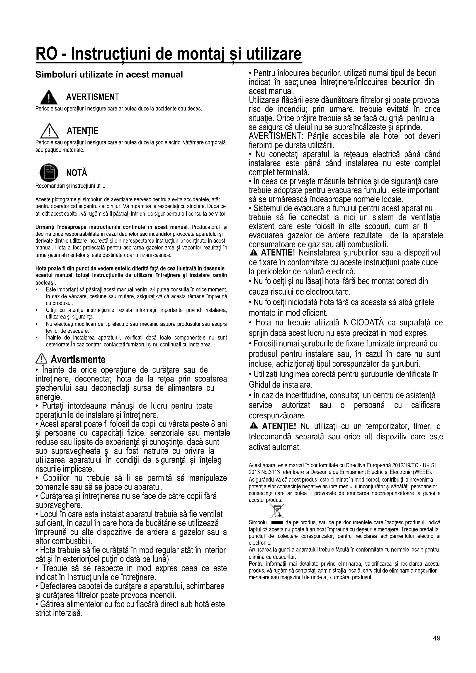 NOTĂ Recomandări și instrucțiuni utile Aceste pictograme şi simboluri de avertizare servesc pentru a evita accidentele, atât pentru operator cât și pentru cei din jur. Vă rugăm să le respectați cu strictețe. După ce ați citit acest capitol, vă rugăm să îl păstraţi într-un loc sigur pentru a-l consulta pe viitor. Urmăriţi îndeaproape instrucţiunile conţinute în acest manual. Producătorul îşi declină orice responsabilitate în cazul daunelor sau incendiilor provocate aparatului şi derivate dintr-o utilizare incorectă şi din nerespectarea instrucţiunilor conţinute în acest manual. Hota a fost proiectată pentru aspirarea gazelor arse şi vaporilor rezultaţi în urma gătirii alimentelor şi este destinată doar utilizării casnice. Hota poate fi din punct de vedere estetic diferită faţă de cea ilustrată în desenele acestui manual, totuşi instrucţiunile de utilizare, întreţinere şi instalare rămân aceleaşi.