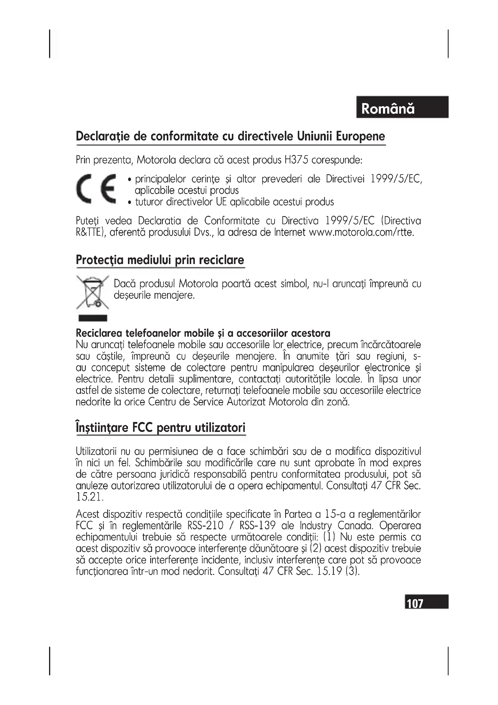 - tuturor directivelor UE aplicabile acestui produs Puteţi vedea Declaratia de Conformitate cu Directiva 1999/5/EC (Directiva R&TTE), aferentă produsului Dvs., la adresa de Internet www.motorola.com/rtte. Protecţia mediului prin reciclare Dacă produsul Motorola poartă acest simbol, nu-l aruncaţi împreună cu deşeurile menajere. Reciclarea telefoanelor mobile şi a accesoriilor acestora Nu aruncaţi telefoanele mobile sau accesoriile lor electrice, precum încărcătoarele sau căştile, împreună cu deşeurile menajere. În anumite ţări sau regiuni, s- au conceput sisteme de colectare pentru manipularea deşeurilor electronice şi electrice. Pentru detalii suplimentare, contactaţi autorităţile locale. În lipsa unor astfel de sisteme de colectare, returnaţi telefoanele mobile sau accesoriile electrice nedorite la orice Centru de Service Autorizat Motorola din zonă. Înştiinţare FCC pentru utilizatori Utilizatorii nu au permisiunea de a face schimbări sau de a modifica dispozitivul în nici un fel. Schimbările sau modificările care nu sunt aprobate în mod expres de către persoana juridică responsabilă pentru conformitatea produsului, pot să anuleze autorizarea utilizatorului de a opera echipamentul. Consultaţi 47 CFR Sec.