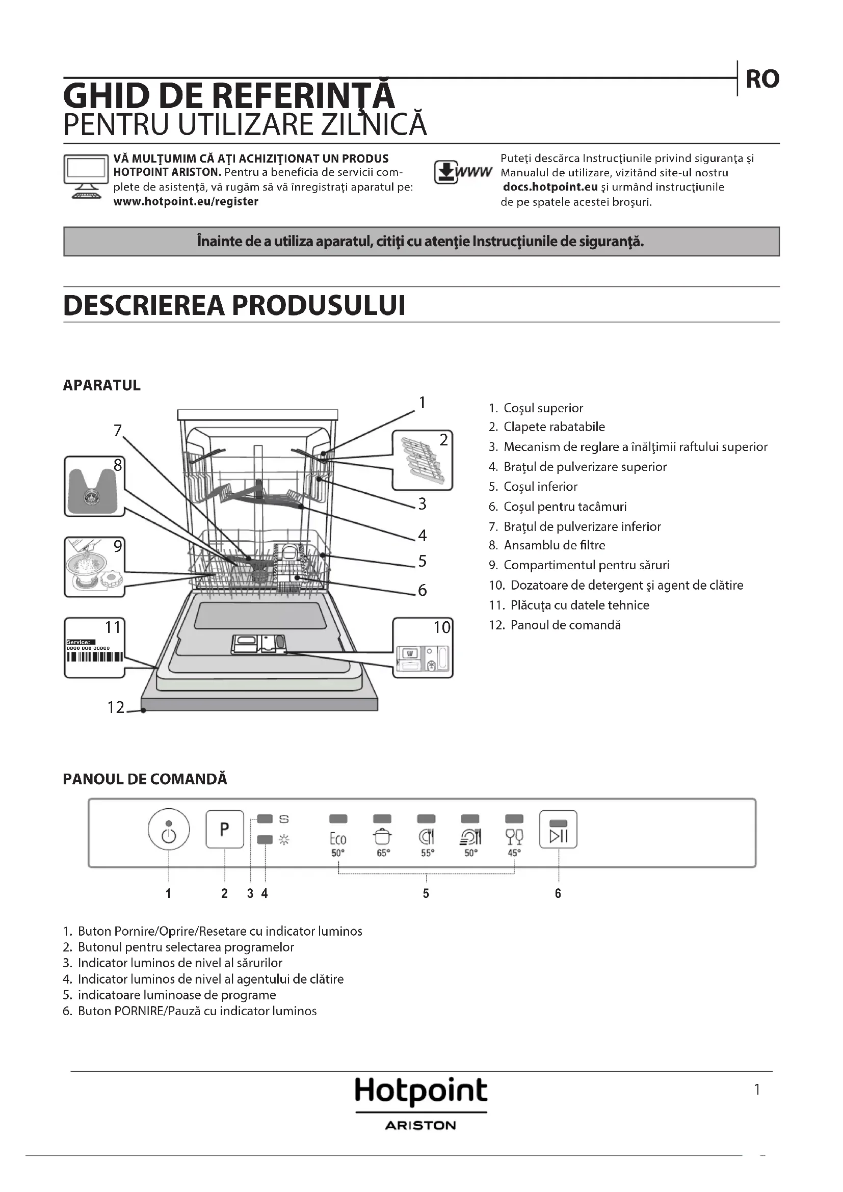 VĂ MULŢUMIM CĂ AŢI ACHIZIŢIONAT UN PRODUS HOTPOINT ARISTON. Pentru a beneficia de servicii com-plete de asistenţă, vă rugăm să vă înregistraţi aparatul pe: www.hotpoint.eu/registerPuteţi descărca Instrucţiunile privind siguranţa şi Manualul de utilizare, vizitând site-ul nostru docs.hotpoint.eu şi urmând instrucţiunile de pe spatele acestei broşuri.1. Buton Pornire/Oprire/Resetare cu indicator luminos2. Butonul pentru selectarea programelor3. Indicator luminos de nivel al sărurilor4. Indicator luminos de nivel al agentului de clătire5. indicatoare luminoase de programe6. Buton PORNIRE/Pauză cu indicator luminos1. Coşul superior2. Clapete rabatabile3. Mecanism de reglare a înălţimii raftului superior4. Braţul de pulverizare superior5. Coşul inferior6. Coşul pentru tacâmuri7. Braţul de pulverizare inferior8. Ansamblu de ltre9. Compartimentul pentru săruri10. Dozatoare de detergent şi agent de clătire11. Plăcuţa cu datele tehnice12. Panoul de comandă0000 000 00000 Service: