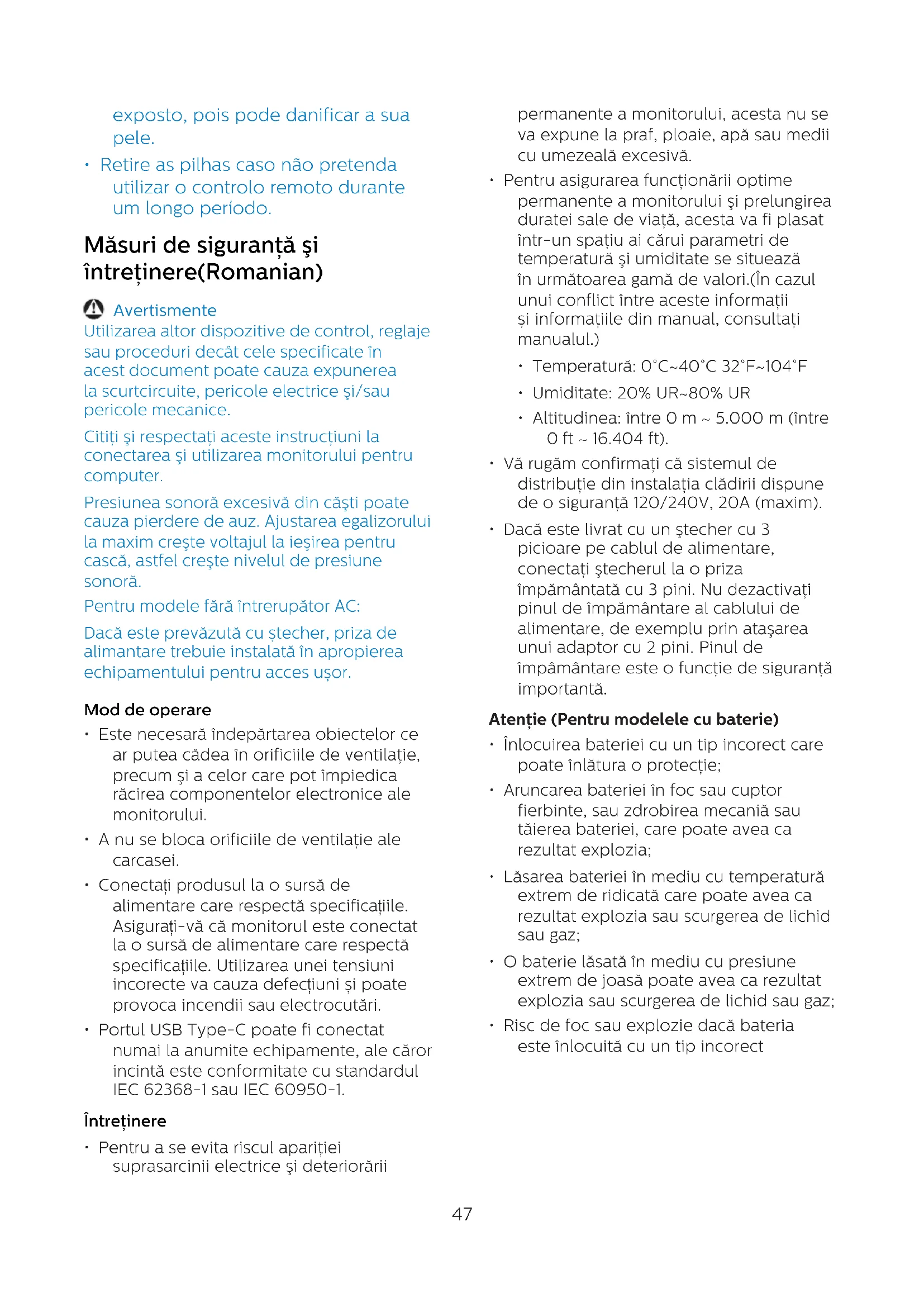 - Retire as pilhas caso não pretenda utilizar o controlo remoto durante um longo período. Măsuri de siguranţă şi întreţinere(Romanian) Avertismente Utilizarea altor dispozitive de control, reglaje sau proceduri decât cele specificate în acest document poate cauza expunerea la scurtcircuite, pericole electrice şi/sau pericole mecanice. Citiţi şi respectaţi aceste instrucţiuni la conectarea şi utilizarea monitorului pentru computer. Presiunea sonoră excesivă din căşti poate cauza pierdere de auz. Ajustarea egalizorului la maxim creşte voltajul la ieşirea pentru cască, astfel creşte nivelul de presiune sonoră. Pentru modele fără întrerupător AC: Dacă este prevăzută cu ștecher, priza de alimantare trebuie instalată în apropierea echipamentului pentru acces ușor. Mod de operare