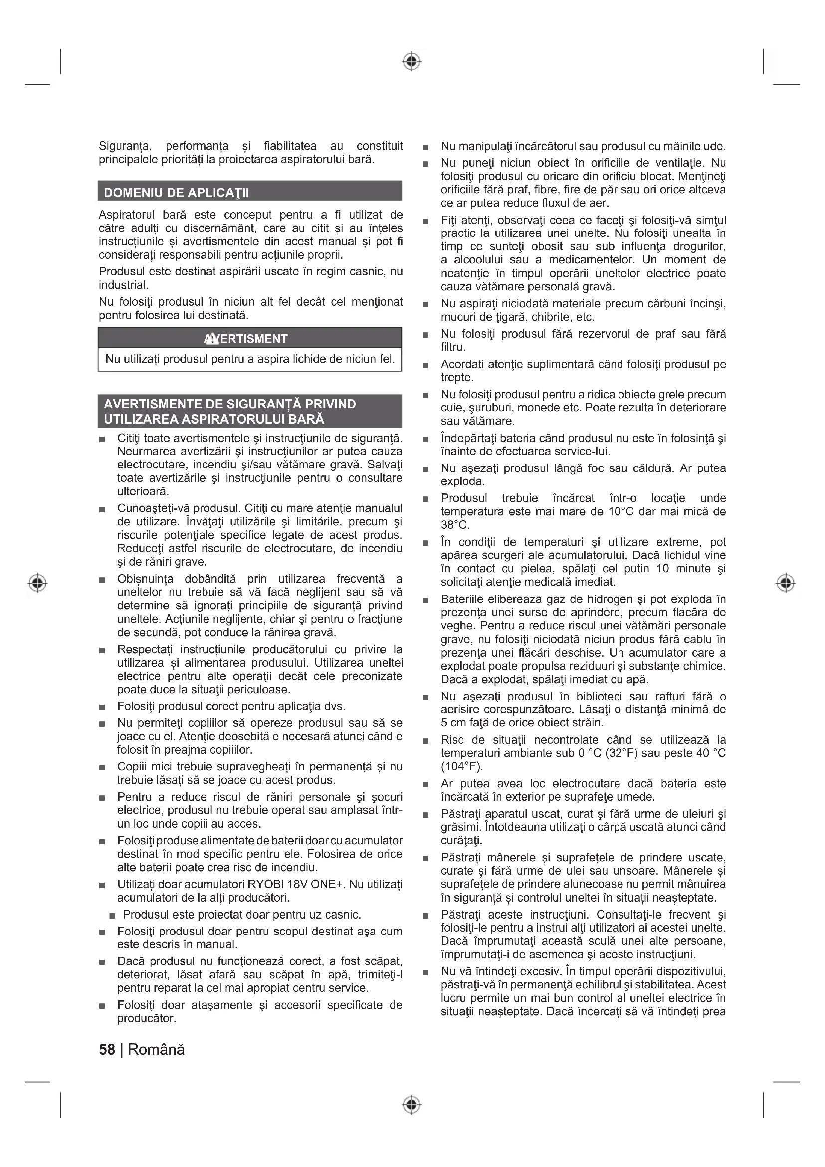 Aspiratorul bară este conceput pentru a fi utilizat de către adulți cu discernământ, care au citit și au înțeles instrucțiunile și avertismentele din acest manual și pot fi considerați responsabili pentru acțiunile proprii. Produsul este destinat aspirării uscate în regim casnic, nu industrial. Nu folosiţi produsul în niciun alt fel decât cel menţionat pentru folosirea lui destinată. AVERTISMENT Nu utilizați produsul pentru a aspira lichide de niciun fel.