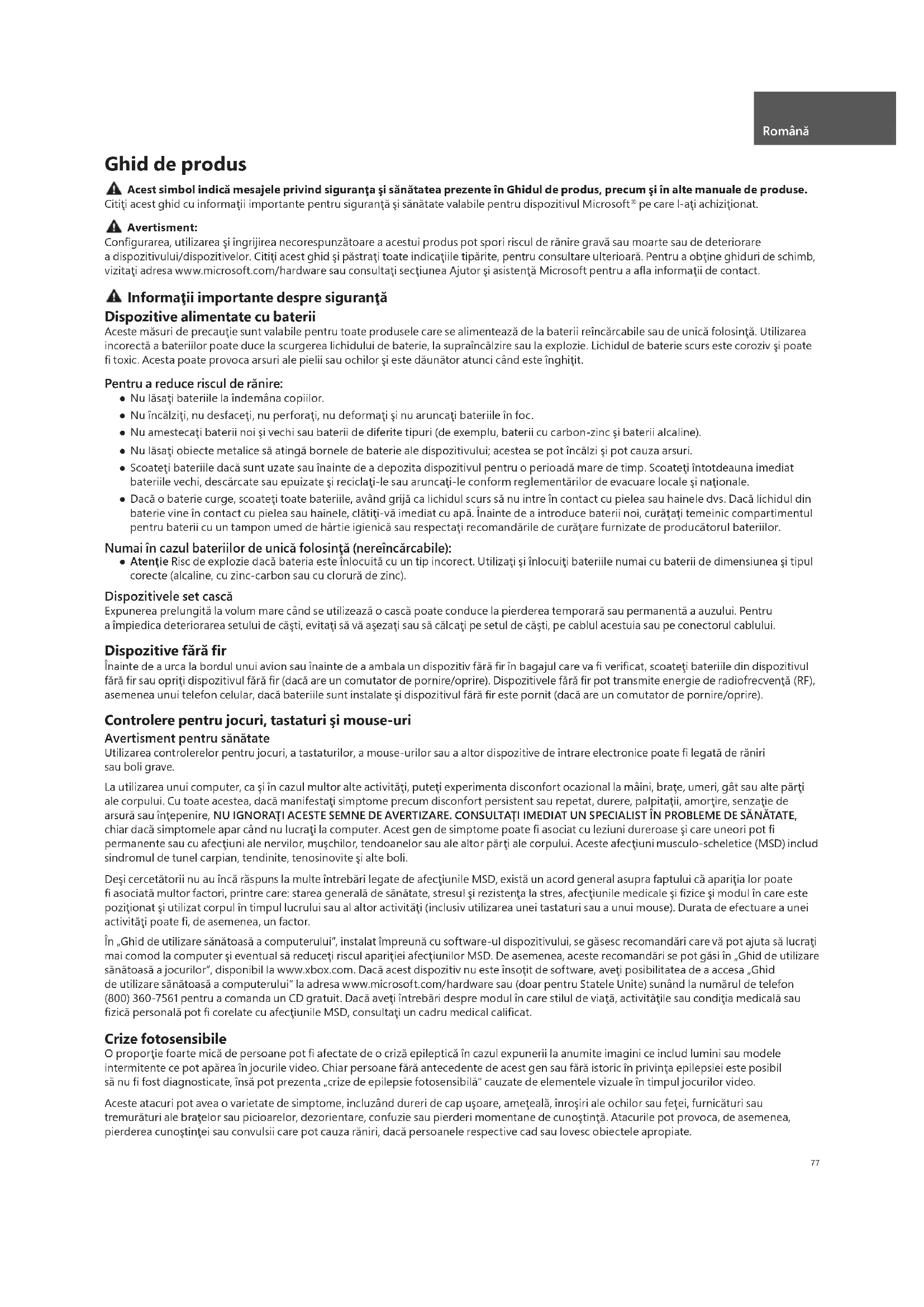 pe care l-aţi achiziţionat. Avertisment: Confi gurarea, utilizarea şi îngrijirea necorespunzătoare a acestui produs pot spori riscul de rănire gravă sau moarte sau de deteriorare a dispozitivului/dispozitivelor. Citiţi acest ghid şi păstraţi toate indicaţiile tipărite, pentru consultare ulterioară. Pentru a obţine ghiduri de schimb, vizitaţi adresa www.microsoft.com/hardware sau consultaţi secţiunea Ajutor şi asistenţă Microsoft pentru a afl a informaţii de contact. Informaţii importante despre siguranţă Dispozitive alimentate cu baterii Aceste măsuri de precauţie sunt valabile pentru toate produsele care se alimentează de la baterii reîncărcabile sau de unică folosinţă. Utilizarea incorectă a bateriilor poate duce la scurgerea lichidului de baterie, la supraîncălzire sau la explozie. Lichidul de baterie scurs este coroziv şi poate fi toxic. Acesta poate provoca arsuri ale pielii sau ochilor şi este dăunător atunci când este înghiţit. Pentru a reduce riscul de rănire: ● Nu lăsaţi bateriile la îndemâna copiilor. ● Nu încălziţi, nu desfaceţi, nu perforaţi, nu deformaţi şi nu aruncaţi bateriile în foc. ● Nu amestecaţi baterii noi şi vechi sau baterii de diferite tipuri (de exemplu, baterii cu carbon-zinc şi baterii alcaline). ● Nu lăsaţi obiecte metalice să atingă bornele de baterie ale dispozitivului; acestea se pot încălzi şi pot cauza arsuri. ● Scoateţi bateriile dacă sunt uzate sau înainte de a depozita dispozitivul pentru o perioadă mare de timp. Scoateţi întotdeauna imediat bateriile vechi, descărcate sau epuizate şi reciclaţi-le sau aruncaţi-le conform reglementărilor de evacuare locale şi naţionale. ● Dacă o baterie curge, scoateţi toate bateriile, având grijă ca lichidul scurs să nu intre în contact cu pielea sau hainele dvs. Dacă lichidul din baterie vine în contact cu pielea sau hainele, clătiţi-vă imediat cu apă. Înainte de a introduce baterii noi, curăţaţi temeinic compartimentul pentru baterii cu un tampon umed de hârtie igienică sau respectaţi recomandările de curăţare furnizate de producătorul bateriilor. Numai în cazul bateriilor de unică folosinţă (nereîncărcabile): ● Atenţie Risc de explozie dacă bateria este înlocuită cu un tip incorect. Utilizaţi şi înlocuiţi bateriile numai cu baterii de dimensiunea şi tipul corecte (alcaline, cu zinc-carbon sau cu clorură de zinc). Dispozitivele set cască Expunerea prelungită la volum mare când se utilizează o cască poate conduce la pierderea temporară sau permanentă a auzului. Pentru a împiedica deteriorarea setului de căşti, evitaţi să vă aşezaţi sau să călcaţi pe setul de căşti, pe cablul acestuia sau pe conectorul cablului. Dispozitive fără fi r Înainte de a urca la bordul unui avion sau înainte de a ambala un dispozitiv fără fi r în bagajul care va fi verifi cat, scoateţi bateriile din dispozitivul fără fi r sau opriţi dispozitivul fără fi r (dacă are un comutator de pornire/oprire). Dispozitivele fără fi r pot transmite energie de radiofrecvenţă (RF), asemenea unui telefon celular, dacă bateriile sunt instalate şi dispozitivul fără fi r este pornit (dacă are un comutator de pornire/oprire). Controlere pentru jocuri, tastaturi şi mouse-uri Avertisment pentru sănătate Utilizarea controlerelor pentru jocuri, a tastaturilor, a mouse-urilor sau a altor dispozitive de intrare electronice poate fi legată de răniri sau boli grave. La utilizarea unui computer, ca şi în cazul multor alte activităţi, puteţi experimenta disconfort ocazional la mâini, braţe, umeri, gât sau alte părţi ale corpului. Cu toate acestea, dacă manifestaţi simptome precum disconfort persistent sau repetat, durere, palpitaţii, amorţire, senzaţie de arsură sau înţepenire, NU IGNORAŢI ACESTE SEMNE DE AVERTIZARE. CONSULTAŢI IMEDIAT UN SPECIALIST ÎN PROBLEME DE SĂNĂTATE, chiar dacă simptomele apar când nu lucraţi la computer. Acest gen de simptome poate fi asociat cu leziuni dureroase şi care uneori pot fi permanente sau cu afecţiuni ale nervilor, muşchilor, tendoanelor sau ale altor părţi ale corpului. Aceste afecţiuni musculo-scheletice (MSD) includ sindromul de tunel carpian, tendinite, tenosinovite şi alte boli. Deşi cercetătorii nu au încă răspuns la multe întrebări legate de afecţiunile MSD, există un acord general asupra faptului că apariţia lor poate fi asociată multor factori, printre care: starea generală de sănătate, stresul şi rezistenţa la stres, afecţiunile medicale şi fi zice şi modul în care este poziţionat şi utilizat corpul în timpul lucrului sau al altor activităţi (inclusiv utilizarea unei tastaturi sau a unui mouse). Durata de efectuare a unei activităţi poate fi , de asemenea, un factor. În „Ghid de utilizare sănătoasă a computerului”, instalat împreună cu software-ul dispozitivului, se găsesc recomandări care vă pot ajuta să lucraţi mai comod la computer şi eventual să reduceţi riscul apariţiei afecţiunilor MSD. De asemenea, aceste recomandări se pot găsi în „Ghid de utilizare sănătoasă a jocurilor”, disponibil la www.xbox.com. Dacă acest dispozitiv nu este însoţit de software, aveţi posibilitatea de a accesa „Ghid de utilizare sănătoasă a computerului” la adresa www.microsoft.com/hardware sau (doar pentru Statele Unite) sunând la numărul de telefon (800) 360-7561 pentru a comanda un CD gratuit. Dacă aveţi întrebări despre modul în care stilul de viaţă, activităţile sau condiţia medicală sau fi zică personală pot fi corelate cu afecţiunile MSD, consultaţi un cadru medical califi cat. Crize fotosensibile O proporţie foarte mică de persoane pot fi afectate de o criză epileptică în cazul expunerii la anumite imagini ce includ lumini sau modele intermitente ce pot apărea în jocurile video. Chiar persoane fără antecedente de acest gen sau fără isto