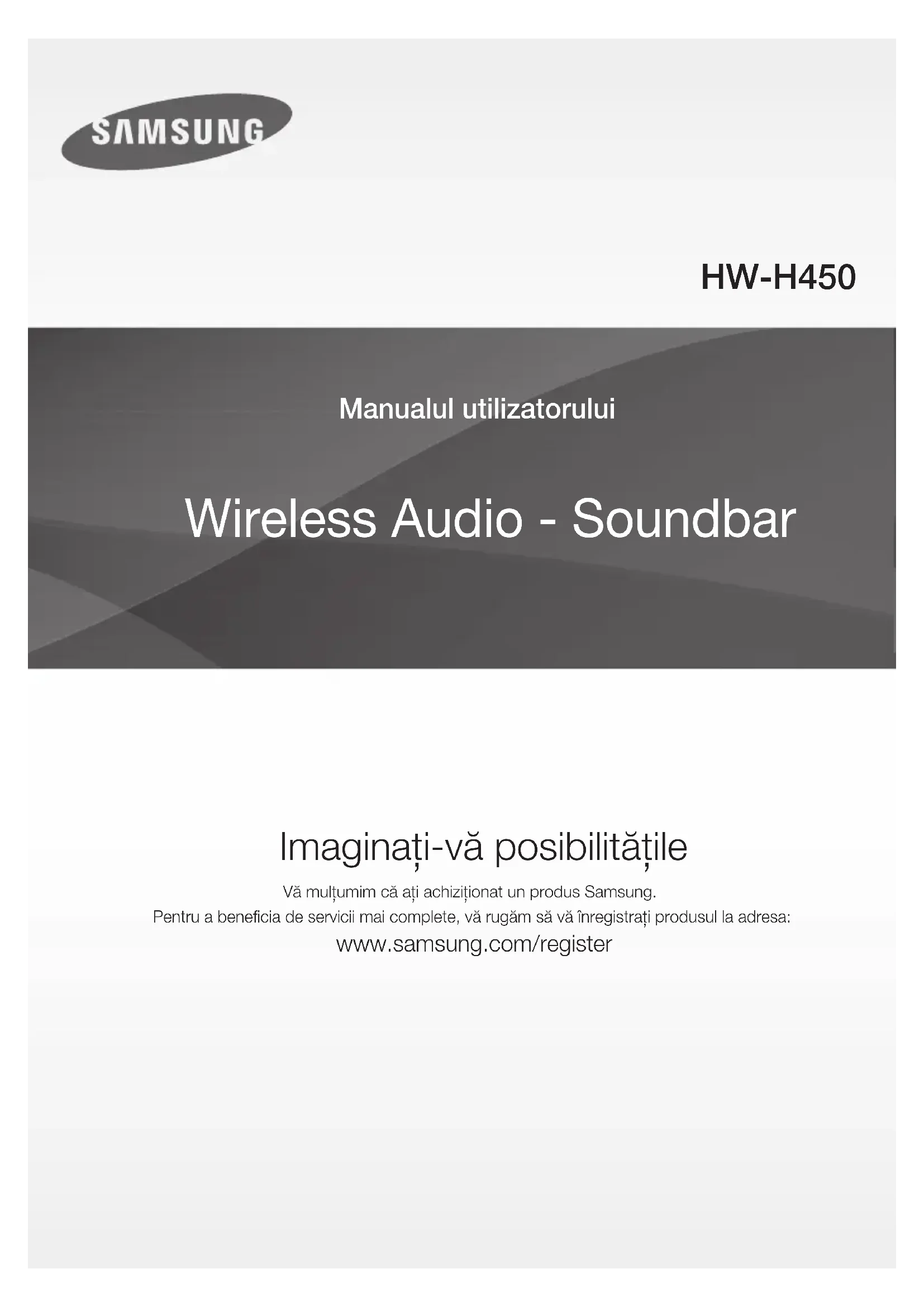 ESTONIA 800-7267 www.samsung.com/ee/support HW-H450_EUR_GRE_141027.indd 25HW-H450_EUR_GRE_141027.indd 25 2014-10-27 4:05:092014-10-27 4:05:09Wireless Audio - Soundbar Imaginaţi-vă posibilităţile Vă mulţumim că aţi achiziţionat un produs Samsung. Pentru a beneficia de servicii mai complete, vă rugăm să vă înregistraţi produsul la adresa: www.samsung.com/register Manualul utilizatorului HW-H450 HW-H450_EUR_ROM_141027.indd 1HW-H450_EUR_ROM_141027.indd 1 2014-10-27 4:01:122014-10-27 4:01:122 CARACTERISTICI CARACTERISTICI TV SoundConnect TV SoundConnect vă permite să ascultaţi şi să controlaţi sunetul de la televizor pe sistemul Soundbar, prin Bluetooth. HDMI HDMI transmite simultan semnale video şi audio şi oferă o imagine mai clară. Unitatea dispune şi de funcţia ARC, care vă permite să ascultaţi sunetul de la televizor printr-un cablu HDMI pe sistemul Soundbar. Această funcţie este disponibilă numai când conectaţi unitatea la un televizor compatibil cu ARC. 3D SOUND Caracteristica de sunet 3D SOUND adaugă adâncime şi spaţiozitate experienţei dvs. de ascultare. Subwoofer Wireless Modulul wireless Samsung elimină cablurile dintre unitatea principală şi subwoofer. Subwooferul este conectat la un modul wireless compact, care comunică cu unitatea principală. Modul Special Sound (Sunet special) Puteţi selecta dintre 5 moduri de sunet - MUSIC (MUZICĂ) / VOICE (VOCE) / SPORTS (SPORT) / CINEMA / STANDARD (Sunet Original), în funcţie de tipul de conţinut pe care doriţi să îl audiaţi. Telecomandă multifuncţională Puteţi utiliza telecomanda pentru controlul diverselor operaţiuni prin simpla apăsare a unui buton. Suport pentru USB Host Puteţi să conectaţi dispozitive USB externe (MP3 playere, memorii flash USB etc.) şi să redaţi fişierele de pe acestea cu ajutorul funcţiei USB HOST a sistemului Soundbar. Funcţia Bluetooth Puteţi utiliza un dispozitiv Bluetooth conectat la sistemul Soundbar pentru a vă bucura de muzică stereo de înaltă calitate, fără cabluri! LICENŢĂ Fabricat sub licenţă Dolby Laboratories. Dolby şi simbolul dublu D sunt mărci comerciale înregistrate ale Dolby Laboratories. Pentru brevete DTS, accesaţi http://patents.dts.com. Fabricat sub licenţă DTS Licensing Limited. DTS-HD, Simbolul, & DTS-HD şi Simbolul sunt mărci comerciale înregistrate şi DTS 2.0 Channel este marcă comercială a DTS, Inc. © DTS, Inc. Toate drepturile rezervate. HDMI, High-Definition Multimedia Interface şi sigla HDMI sunt mărci comerciale sau mărci comerciale înregistrate ale HDMI Licensing LLC în Statele Unite ale Americii şi alte ţări. HW-H450_EUR_ROM_141027.indd 2HW-H450_EUR_ROM_141027.indd 2 2014-10-27 4:01:152014-10-27 4:01:153 ROM
