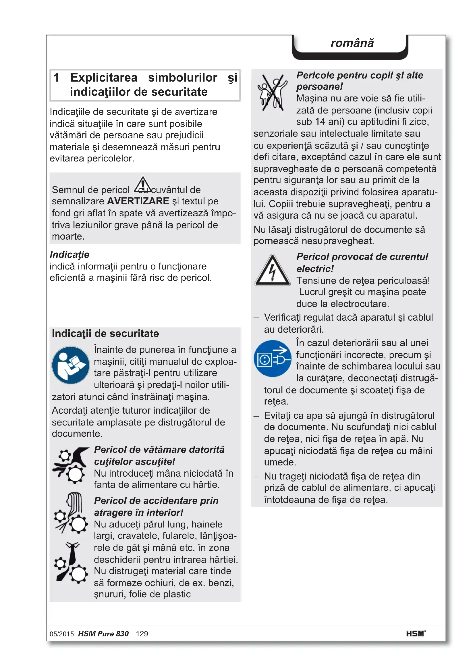 Súly 67,0 kg 72,0 kg Vágási sebesség 110 mm/s Munkaszélesség 330 mm Hálózati csatlakozás 230 V, 50 Hz 120 V, 60 Hz 220 V, 60 Hz Teljesítmény max. lapszámnál 2.100 W Üzemmód Folyamatos üzem Üzem közbeni környezeti feltételek: Hőmérséklet Relatív páratartalom Tenger feletti magasság -10 °C ... +25 °C max. 90 %, nem lecsapódó max. 2.000 m Méretek SZ x H x M (mm) 579 x 548 x 954 A gyűjtőtartály űrtartalma 150 l Zajszint (üresjárat / teljes terhelés) 60 - 62 dB(A) / 65 - 69 dB(A)05/2015 HSM Pure 830 129 română 1 Explicitarea simbolurilor şi indicaţiilor de securitate Indicaţiile de securitate şi de avertizare indică situaţiile în care sunt posibile vătămări de persoane sau prejudicii materiale şi desemnează măsuri pentru evitarea pericolelor. Indicaţie indică informaţii pentru o funcţionare efi cientă a maşinii fără risc de pericol. Semnul de pericol cu cuvântul de semnalizare AVERTIZARE şi textul pe fond gri afl at în spate vă avertizează împo- triva leziunilor grave până la pericol de moarte. Indicaţii de securitate Înainte de punerea în funcţiune a maşinii, citiţi manualul de exploa- tare păstraţi-l pentru utilizare ulterioară şi predaţi-l noilor utili- zatori atunci când înstrăinaţi maşina. Acordaţi atenţie tuturor indicaţiilor de securitate amplasate pe distrugătorul de documente. Pericol de vătămare datorită cuţitelor ascuţite! Nu introduceţi mâna niciodată în fanta de alimentare cu hârtie. Pericol de accidentare prin atragere în interior! Nu aduceţi părul lung, hainele largi, cravatele, fularele, lănţişoa- rele de gât şi mână etc. în zona deschiderii pentru intrarea hârtiei. Nu distrugeţi material care tinde să formeze ochiuri, de ex. benzi, şnururi, folie de plastic Pericole pentru copii şi alte persoane! Maşina nu are voie să fi e utili- zată de persoane (inclusiv copii sub 14 ani) cu aptitudini fi zice, senzoriale sau intelectuale limitate sau cu experienţă scăzută şi / sau cunoştinţe defi citare, exceptând cazul în care ele sunt supravegheate de o persoană competentă pentru siguranţa lor sau au primit de la aceasta dispoziţii privind folosirea aparatu- lui. Copiii trebuie supravegheaţi, pentru a vă asigura că nu se joacă cu aparatul. Nu lăsaţi distrugătorul de documente să pornească nesupravegheat. Pericol provocat de curentul electric! Tensiune de reţea periculoasă! Lucrul greşit cu maşina poate duce la electrocutare. – Verifi caţi regulat dacă aparatul şi cablul au deteriorări. În cazul deteriorării sau al unei funcţionări incorecte, precum şi înainte de schimbarea locului sau la curăţare, deconectaţi distrugă- torul de documente şi scoateţi fi şa de reţea. – Evitaţi ca apa să ajungă în distrugătorul de documente. Nu scufundaţi nici cablul de reţea, nici fi şa de reţea în apă. Nu apucaţi niciodată fi şa de reţea cu mâini umede. – Nu trageţi niciodată fi şa de reţea din priză de cablul de alimentare, ci apucaţi întotdeauna de fi şa de reţea.130 HSM Pure 830 05/2015 română 2 Utilizarea conform destina- ţiei, garanţia producătorului Perioada de garanţie acordată de produ- cător pentru distrugătorul de documente este de 2 ani. Pe toată durata de serviciu a aparatului este valabilă o garanţie pentru produs independentă de garanţia legală pentru axele de tăiere din oţel masiv ale distrugătoarelor de documente HSM (HSM Lifetime Warranty). Uzura, deteriorările pro- duse ca urmare a utilizării neconforme cu destinaţia, ca şi intervenţiile unei terţe părţi, nu fac obiectul garanţiei producătorului sau vânzătorului. HSM asigură livrarea pieselor de schimb până la 10 ani după încetarea producţiei acestui model. Distrugătorul de documente este destinat pentru fărâmiţarea hârtiei precum şi pentru cantităţi reduse de CD-uri/DVD-uri şi carduri de credit/clienţi. Aparatul solid de tăiat nu este sensibil la agrafele de caiet sau de birou. 3 Vedere generală Elementele de operare şi de afi şare Indicaţii Recipient plin Indicaţii Pregătit de funcţionare Butonul de inversare a sensului Indicaţii Aparat de tăiere blocat Uşă deschisă / Elementul de siguranţă apăsat Butonul de operare 1 Uşă 2 Indicaţii de securitate 3 Bariera fotoelectrică 4 Unitatea de operare şi de afi şare 5 Elementul de siguranţă 6 Plăcuţa de fabricaţie 7 Comutatorul de reţea 1 2 3 4 5 6 705/2015 HSM Pure 830 131 română 4 Punere în funcţiune AVERTIZARE Tensiune de reţea periculoasă! Lucrul greşit cu maşina poate duce la elec- trocutare. – Folosiţi aparatul numai în încăperi uscate. Nu îl utilizaţi niciodată în spaţii umede sau în ploaie. – Ţineţi aparatul, fi şa de reţea şi cablul de reţea departe de surse deschise de foc şi de suprafeţe fi erbinţi. Fantele de aerisire trebuie să fi e libere şi trebuie respectată o distanţă de min. 5 cm faţă de perete sau de mobilă. – Aveţi în vedere ca fi şa de reţea să fi e uşor accesibilă. – Înainte de introducerea fi şei, verifi caţi dacă tensiunea şi frecvenţ a reţelei dumneavoastră coincid cu datele de pe plăcuţa de fabricaţie. 5 Utilizarea