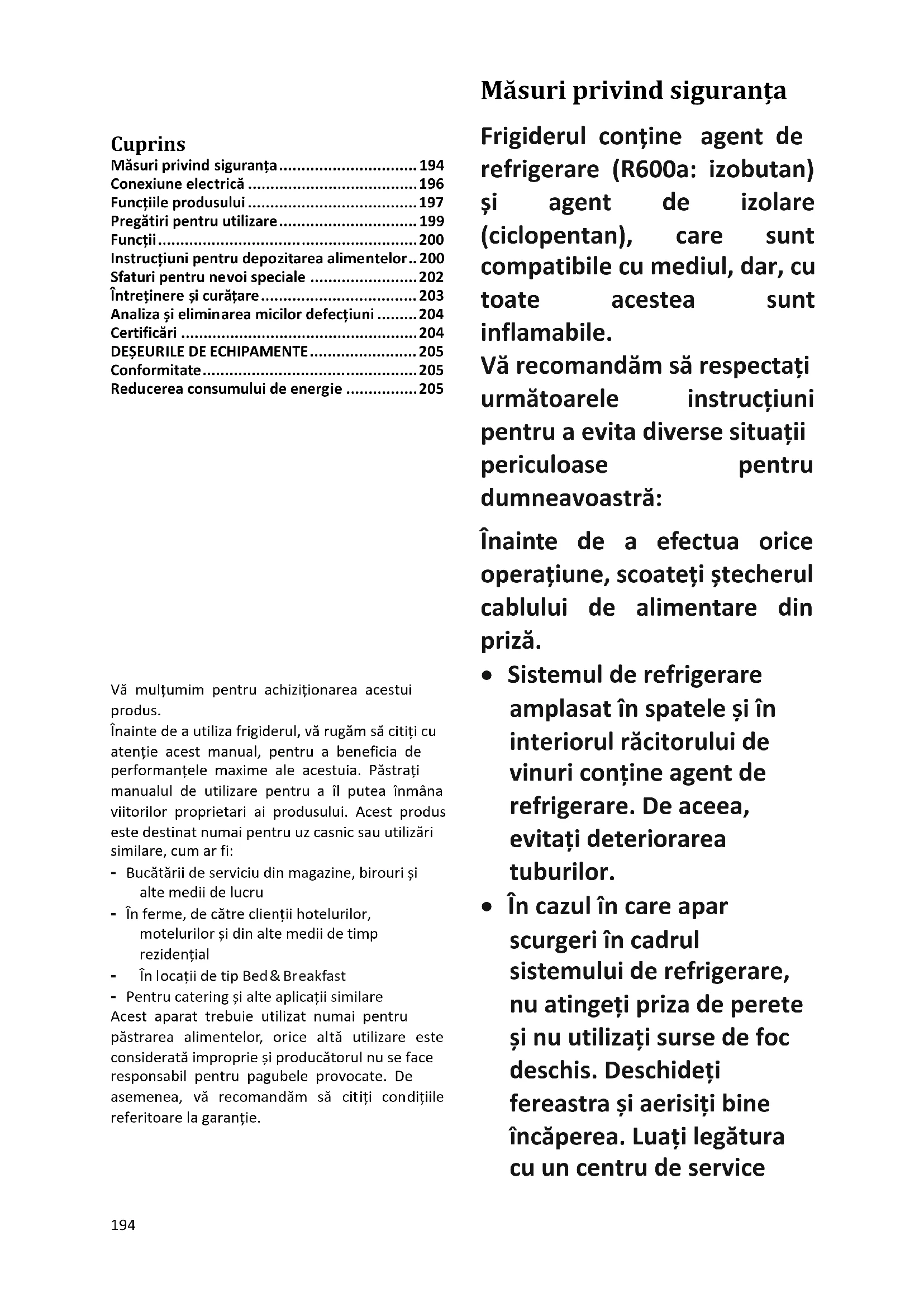 Vă mulțumim pentru achiziționarea acestui produs. Înainte de a utiliza frigiderul, vă rugăm să citiți cu atenție acest manual, pentru a beneficia de performanțele maxime ale acestuia. Păstrați manualul de utilizare pentru a îl putea înmâna viitorilor proprietari ai produsului. Acest produs este destinat numai pentru uz casnic sau utilizări similare, cum ar fi: - Bucătării de serviciu din magazine, birouri și alte medii de lucru - În ferme, de către clienții hotelurilor, motelurilor și din alte medii de timp rezidențial - În locații de tip Bed & Breakfast - Pentru catering și alte aplicații similare Acest aparat trebuie utilizat numai pentru păstrarea alimentelor, orice altă utilizare este considerată improprie și producătorul nu se face responsabil pentru pagubele provocate. De asemenea, vă recomandăm să citiți condițiile referitoare la garanție. Măsuri privind siguranța Frigiderul conține agent de refrigerare (R600a: izobutan) și agent de izolare (ciclopentan), care sunt compatibile cu mediul, dar, cu toate acestea sunt inflamabile. Vă recomandăm să respectați următoarele instrucțiuni pentru a evita diverse situații periculoase pentru dumneavoastră: Înainte de a efectua orice operațiune, scoateți ștecherul cablului de alimentare din priză.