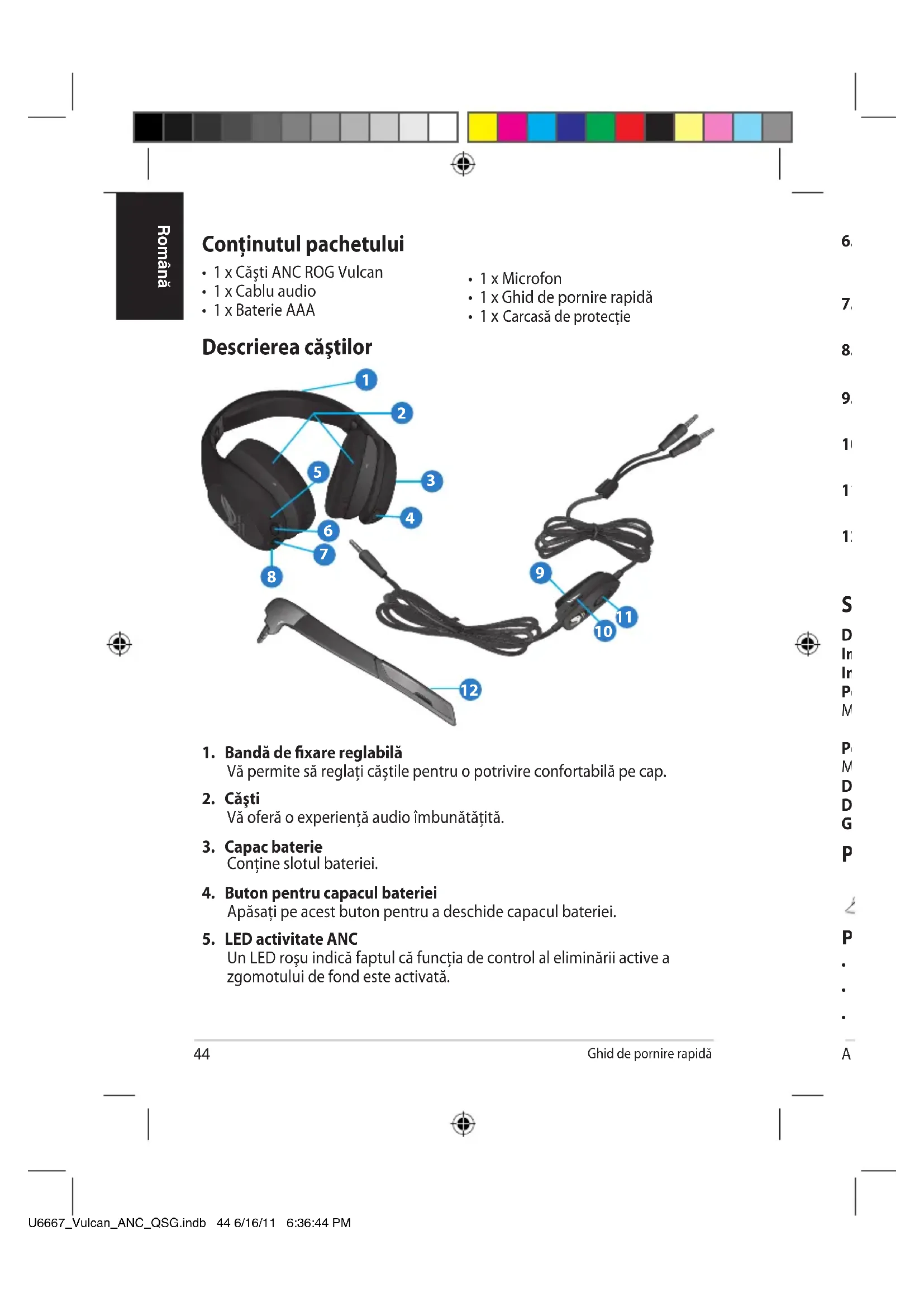 - Mutaţi controlul de volum pentru a mări/micşora volumul. Specicatii Driver: 40 mm Impedanţă: 32 de ohmi Interval frecvenţă: 10~20 Khz Performanţă ANC (Eliminare activă a zgomotului de fond): Maximum >15 dB Lăţime de bandă efectivă >600 MHz Performanţă PNC (Eliminare pasivă a zgomotului de fond): Maximum >30 dB Durata de viaţă a bateriei: Până la 40 de ore (cu o baterie AAA) Dimensiuni (mm): 206 mm x 196 mm x 80 mm (L x l x Î) Greutate: 325 g U6667_Vulcan_ANC_QSG.indb 44 6/16/11 6:36:44 PMGhid de pornire rapidă ASUS ROG Vulcan ANC 45 Română Descrierea căştilor