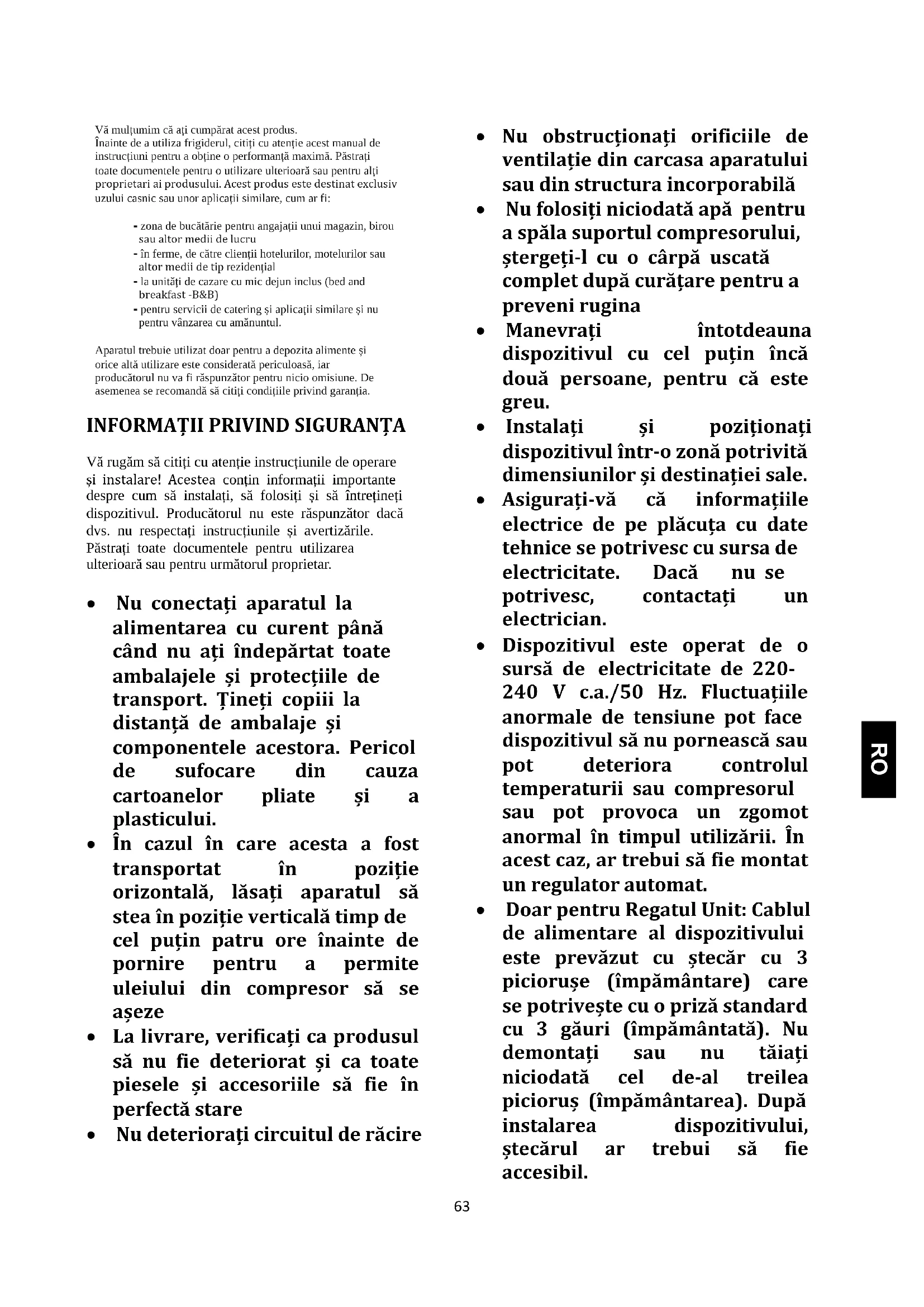 Vă rugăm să citiți cu atenție instrucțiunile de operare și instalare! Acestea conțin informații importante despre cum să instalați, să folosiți și să întrețineți dispozitivul. Producătorul nu este răspunzător dacă dvs. nu respectați instrucțiunile și avertizările. Păstrați toate documentele pentru utilizarea ulterioară sau pentru următorul proprietar. Nu conectați aparatul la alimentarea cu curent până când nu ați îndepărtat toate ambalajele și protecțiile de transport. Țineți copiii la distanță de ambalaje și componentele acestora. Pericol de sufocare din cauza cartoanelor pliate și a plasticului. În cazul în care acesta a fost transportat în poziție orizontală, lăsați aparatul să stea în poziție verticală timp de cel puțin patru ore înainte de pornire pentru a permite uleiului din compresor să se așeze La livrare, verificați ca produsul să nu fie deteriorat și ca toate piesele și accesoriile să fie în perfectă stare Nu deteriorați circuitul de răcire Nu obstrucționați orificiile de ventilație din carcasa aparatului sau din structura incorporabilă Nu folosiți niciodată apă pentru a spăla suportul compresorului, ștergeți-l cu o cârpă uscată complet după curățare pentru a preveni rugina Manevrați întotdeauna dispozitivul cu cel puțin încă două persoane, pentru că este greu. Instalați și poziționați dispozitivul într-o zonă potrivită dimensiunilor și destinației sale. Asigurați-vă că informațiile electrice de pe plăcuța cu date tehnice se potrivesc cu sursa de electricitate. Dacă nu se potrivesc, contactați un electrician. Dispozitivul este operat de o sursă de electricitate de 220- 240 V c.a./50 Hz. Fluctuațiile anormale de tensiune pot face dispozitivul să nu pornească sau pot deteriora controlul temperaturii sau compresorul sau pot provoca un zgomot anormal în timpul utilizării. În acest caz, ar trebui să fie montat un regulator automat. Doar pentru Regatul Unit: Cablul de alimentare al dispozitivului este prevăzut cu ștecăr cu 3 piciorușe (împământare) care se potrivește cu o priză standard cu 3 găuri (împământată). Nu demontați sau nu tăiați niciodată cel de-al treilea picioruș (împământarea). După instalarea dispozitivului, ștecărul ar trebui să fie accesibil.