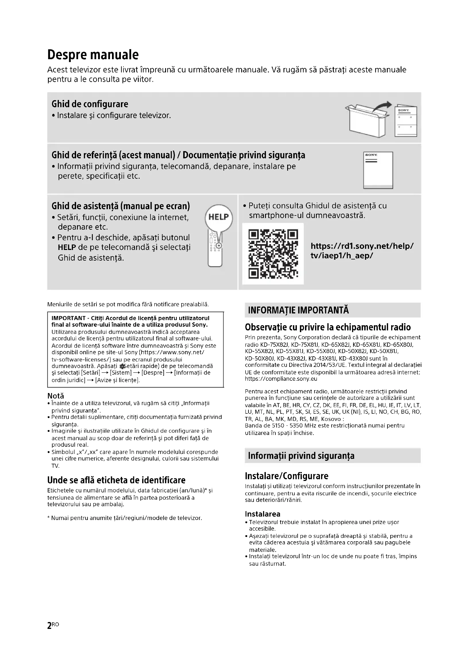 - Puteți consulta Ghidul de asistenţă cu smartphone-ul dumneavoastră. https://rd1.sony.net/help/ tv/iaep1/h_aep/ IMPORTANT - Citiți Acordul de licenţă pentru utilizatorul final al software-ului înainte de a utiliza produsul Sony. Utilizarea produsului dumneavoastră indică acceptarea acordului de licenţă pentru utilizatorul final al software-ului. Acordul de licență software între dumneavoastră și Sony este disponibil online pe site-ul Sony (https://www.sony.net/ tv-software-licenses/) sau pe ecranul produsului dumneavoastră. Apăsaţi (Setări rapide) de pe telecomandă şi selectaţi [Setări] [Sistem] [Despre] [Informații de ordin juridic] [Avize și licențe].