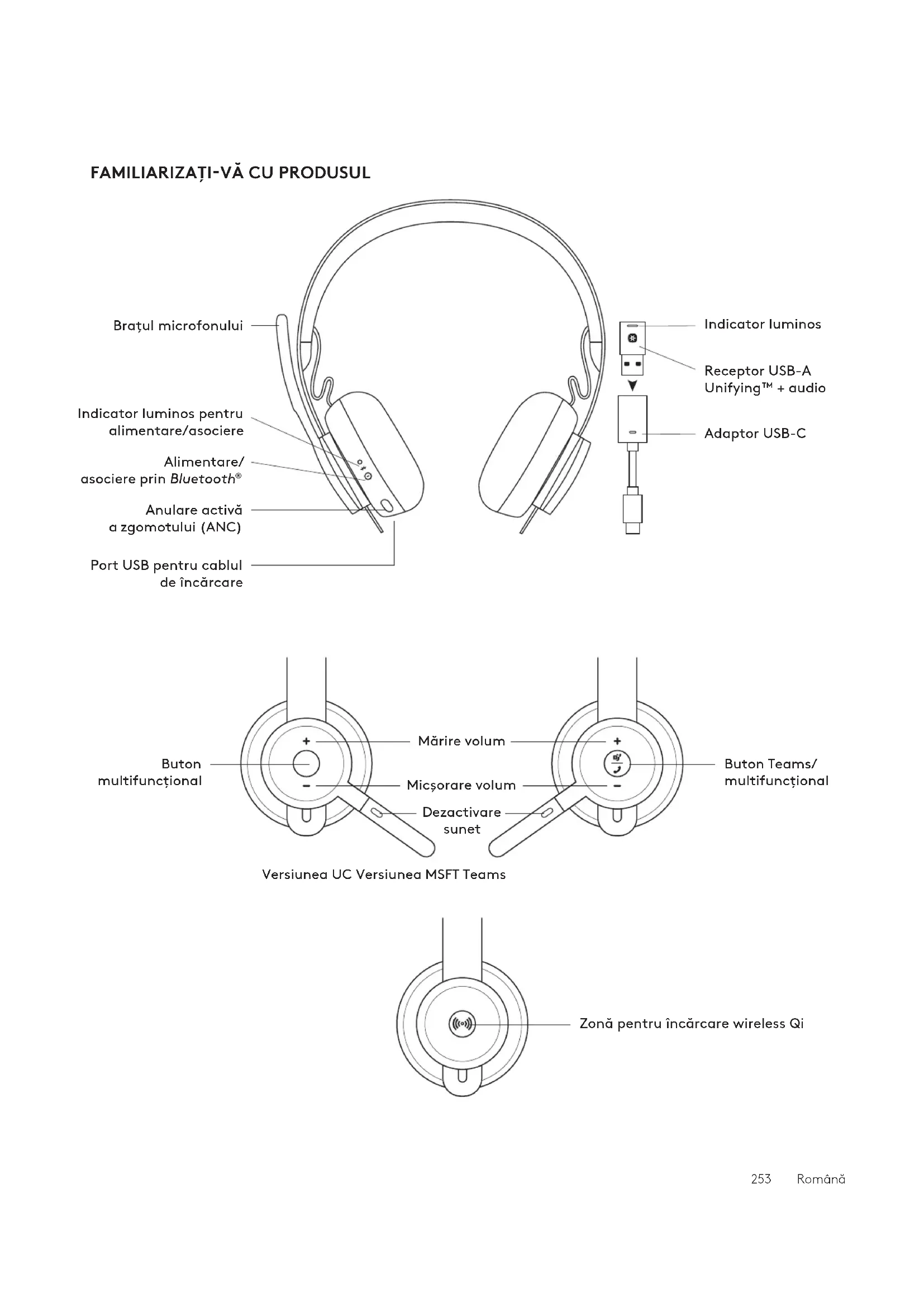Port USB pentru cablul de încărcare Adaptor USB-C Indicator luminos Receptor USB-A Unifying™ + audio Mărire volum Micşorare volum Dezactivare sunet Buton multifuncţional Buton Teams/ multifuncţional Zonă pentru încărcare wireless Qi Versiunea UC Versiunea MSFT Teams 253 RomânăUSB-A USB-C ADAPTER USB-A | USB-CZone Wireless 2 sec.