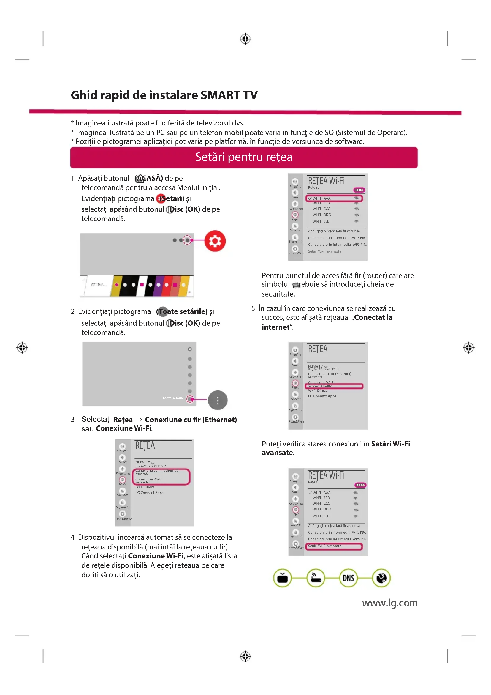 - Poziţiile pictogramei aplicaţiei pot varia pe platformă, în funcţie de versiunea de software. Ghid rapid de instalare SMART TV www.lg.comDepanarea problemelor de reţea 1 Apăsaţi butonul (ACASĂ) de pe telecomandă pentru a accesa Meniul iniţial. Evidenţiaţi pictograma (Setări) şi selectaţi apăsând butonul Disc (OK) de pe telecomandă. 2 Evidenţiaţi pictograma (Toate setările) şi selectaţi apăsând butonul Disc (OK) de pe telecomandă. Toate setările
