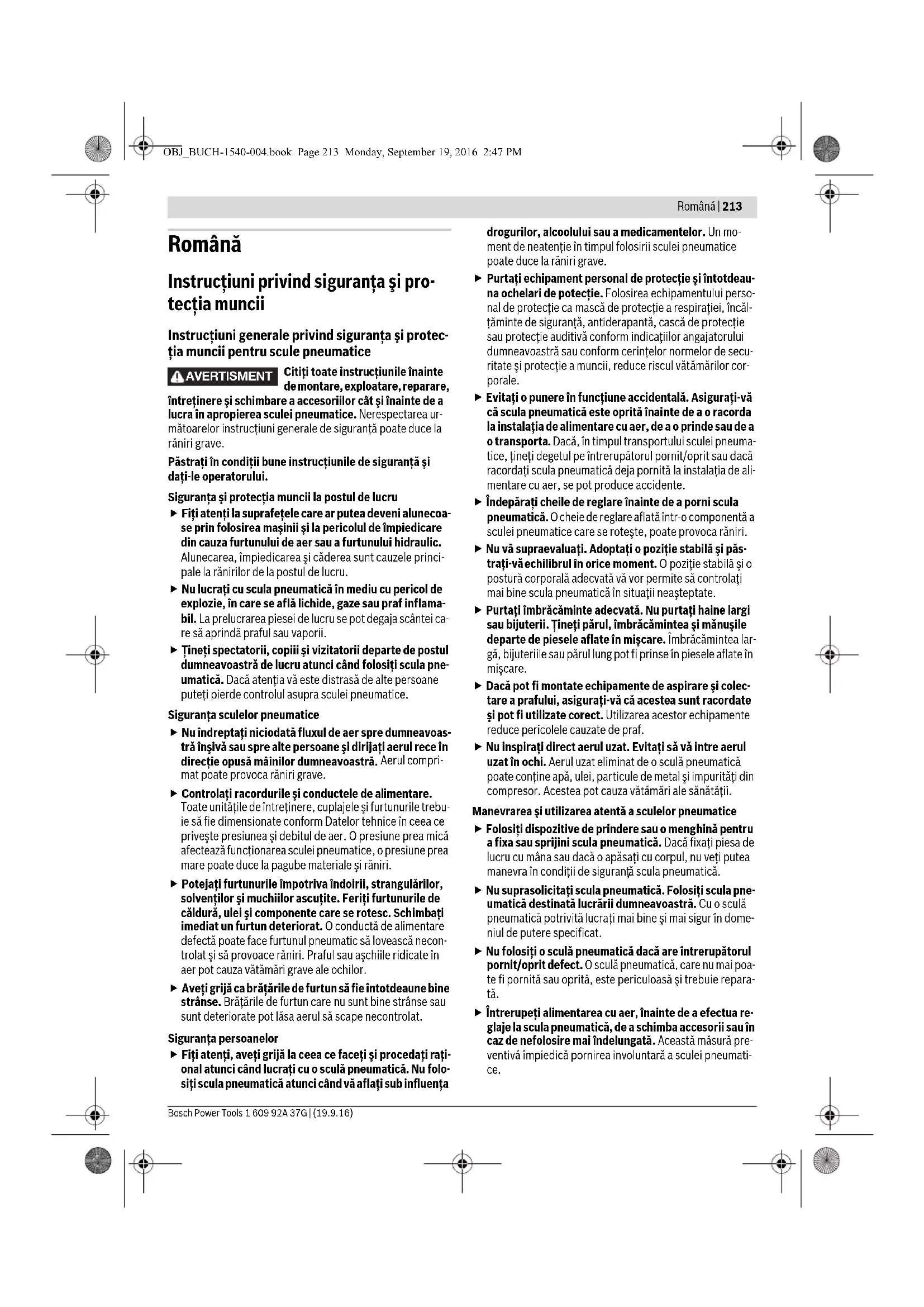 Техникалық өзгерістер енгізу құқығы сақталады. OBJ_BUCH-1540-004.book Page 212 Monday, September 19, 2016 2:47 PMRomână | 213 Bosch Power Tools 1 609 92A 37G | (19.9.16) Română Instrucţiuni privind siguranţa şi pro- tecţia muncii Instrucţiuni generale privind siguranţa şi protec- ţia muncii pentru scule pneumatice Citiţi toate instrucţiunile înainte de montare, exploatare, reparare, întreţinere şi schimbare a accesoriilor cât şi înainte de a lucra în apropierea sculei pneumatice. Nerespectarea ur- mătoarelor instrucţiuni generale de siguranţă poate duce la răniri grave. Păstraţi în condiţii bune instrucţiunile de siguranţă şi daţi-le operatorului. Siguranţa şi protecţia muncii la postul de lucru Fiţi atenţi la suprafeţele care ar putea deveni alunecoa- se prin folosirea maşinii şi la pericolul de împiedicare din cauza furtunului de aer sau a furtunului hidraulic. Alunecarea, împiedicarea şi căderea sunt cauzele princi- pale la rănirilor de la postul de lucru. Nu lucraţi cu scula pneumatică în mediu cu pericol de explozie, în care se află lichide, gaze sau praf inflama- bil. La prelucrarea piesei de lucru se pot degaja scântei ca- re să aprindă praful sau vaporii. Ţineţi spectatorii, copiii şi vizitatorii departe de postul dumneavoastră de lucru atunci când folosiţi scula pne- umatică. Dacă atenţia vă este distrasă de alte persoane puteţi pierde controlul asupra sculei pneumatice. Siguranţa sculelor pneumatice Nu îndreptaţi niciodată fluxul de aer spre dumneavoas- tră înşivă sau spre alte persoane şi dirijaţi aerul rece în direcţie opusă mâinilor dumneavoastră. Aerul compri- mat poate provoca răniri grave. Controlaţi racordurile şi conductele de alimentare. Toate unităţile de întreţinere, cuplajele şi furtunurile trebu- ie să fie dimensionate conform Datelor tehnice în ceea ce priveşte presiunea şi debitul de aer. O presiune prea mică afectează funcţionarea sculei pneumatice, o presiune prea mare poate duce la pagube materiale şi răniri. Potejaţi furtunurile împotriva îndoirii, strangulărilor, solvenţilor şi muchiilor ascuţite. Feriţi furtunurile de căldură, ulei şi componente care se rotesc. Schimbaţi imediat un furtun deteriorat. O conductă de alimentare defectă poate face furtunul pneumatic să lovească necon- trolat şi să provoace răniri. Praful sau aşchiile ridicate în aer pot cauza vătămări grave ale ochilor. Aveţi grijă ca brăţările de furtun să fie întotdeaune bine strânse. Brăţările de furtun care nu sunt bine strânse sau sunt deteriorate pot lăsa aerul să scape necontrolat. Siguranţa persoanelor Fiţi atenţi, aveţi grijă la ceea ce faceţi şi procedaţi raţi- onal atunci când lucraţi cu o sculă pneumatică. Nu folo- siţi scula pneumatică atunci când vă aflaţi sub influenţa drogurilor, alcoolului sau a medicamentelor. Un mo- ment de neatenţie în timpul folosirii sculei pneumatice poate duce la răniri grave.