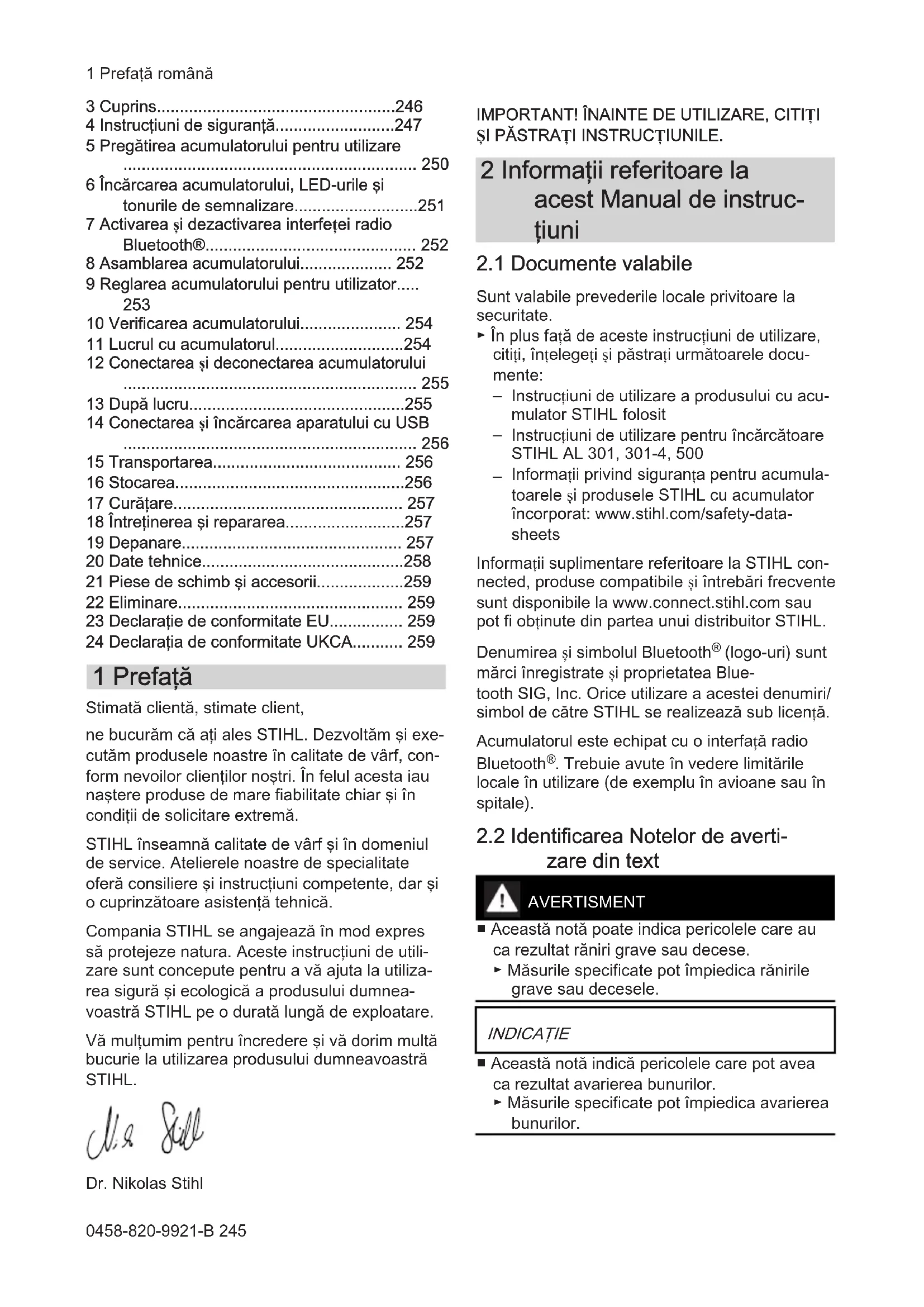 - 24 Declaraţia de conformitate UKCA 1 Prefaţă Stimată clientă, stimate client, ne bucurăm că aţi ales STIHL. Dezvoltăm şi exe‐ cutăm produsele noastre în calitate de vârf, con‐ form nevoilor clienţilor noştri. În felul acesta iau naştere produse de mare fiabilitate chiar şi în condiţii de solicitare extremă. STIHL înseamnă calitate de vârf şi în domeniul de service. Atelierele noastre de specialitate oferă consiliere şi instrucţiuni competente, dar şi o cuprinzătoare asistenţă tehnică. Compania STIHL se angajează în mod expres să protejeze natura. Aceste instrucţiuni de utili‐ zare sunt concepute pentru a vă ajuta la utiliza‐ rea sigură şi ecologică a produsului dumnea‐ voastră STIHL pe o durată lungă de exploatare. Vă mulţumim pentru încredere şi vă dorim multă bucurie la utilizarea produsului dumneavoastră STIHL. Dr. Nikolas Stihl p. 259
