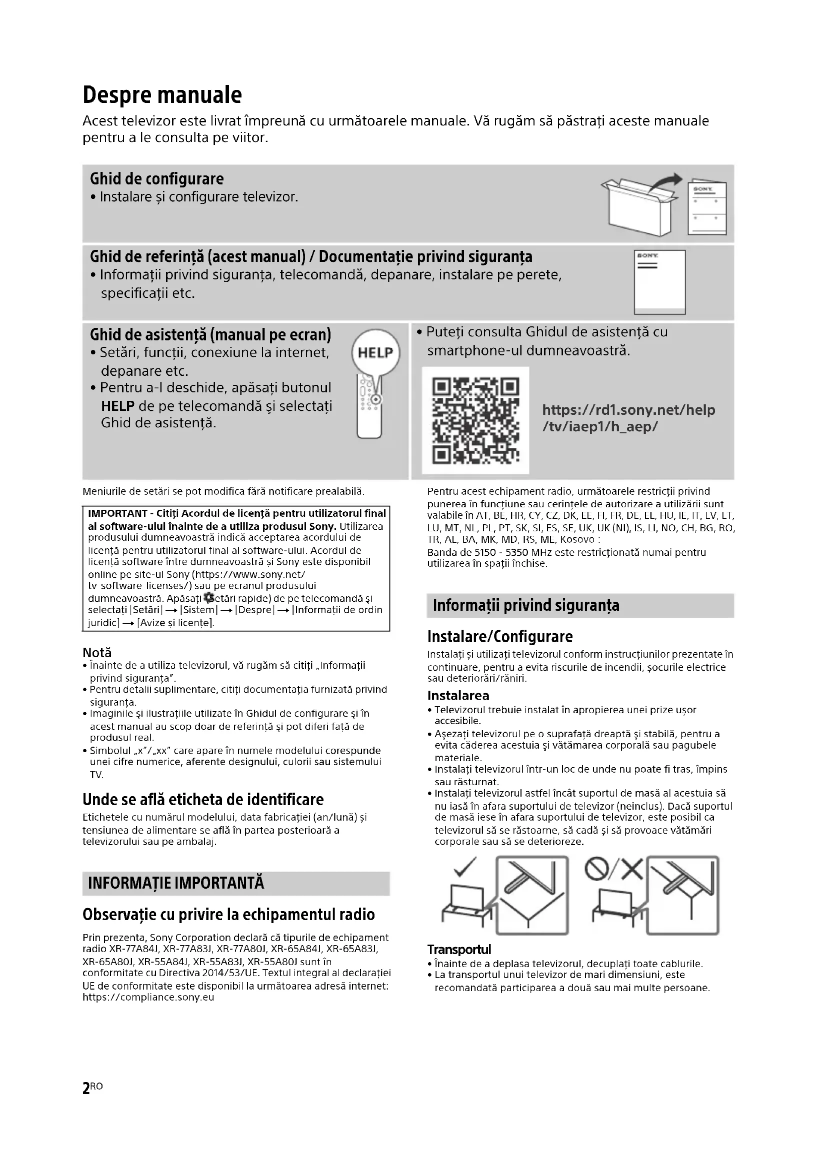 Observaţie cu privire la echipamentul radio Prin prezenta, Sony Corporation declară că tipurile de echipament radio XR-77A84J, XR-77A83J, XR-77A80J, XR-65A84J, XR-65A83J, XR-65A80J, XR-55A84J, XR-55A83J, XR-55A80J sunt în conformitate cu Directiva 2014/53/UE. Textul integral al declarației UE de conformitate este disponibil la următoarea adresă internet: https://compliance.sony.euPentru acest echipament radio, următoarele restricţii privind punerea în funcţiune sau cerinţele de autorizare a utilizării sunt valabile în AT, BE, HR, CY, CZ, DK, EE, FI, FR, DE, EL, HU, IE, IT, LV, LT, LU, MT, NL, PL, PT, SK, SI, ES, SE, UK, UK (NI), IS, LI, NO, CH, BG, RO, TR, AL, BA, MK, MD, RS, ME, Kosovo :Banda de 5150 - 5350 MHz este restricţionată numai pentru utilizarea în spaţii închise. Informaţii privind siguranţa Instalare/Configurare Instalaţi și utilizaţi televizorul conform instrucţiunilor prezentate în continuare, pentru a evita riscurile de incendii, șocurile electrice sau deteriorări/răniri. Instalarea