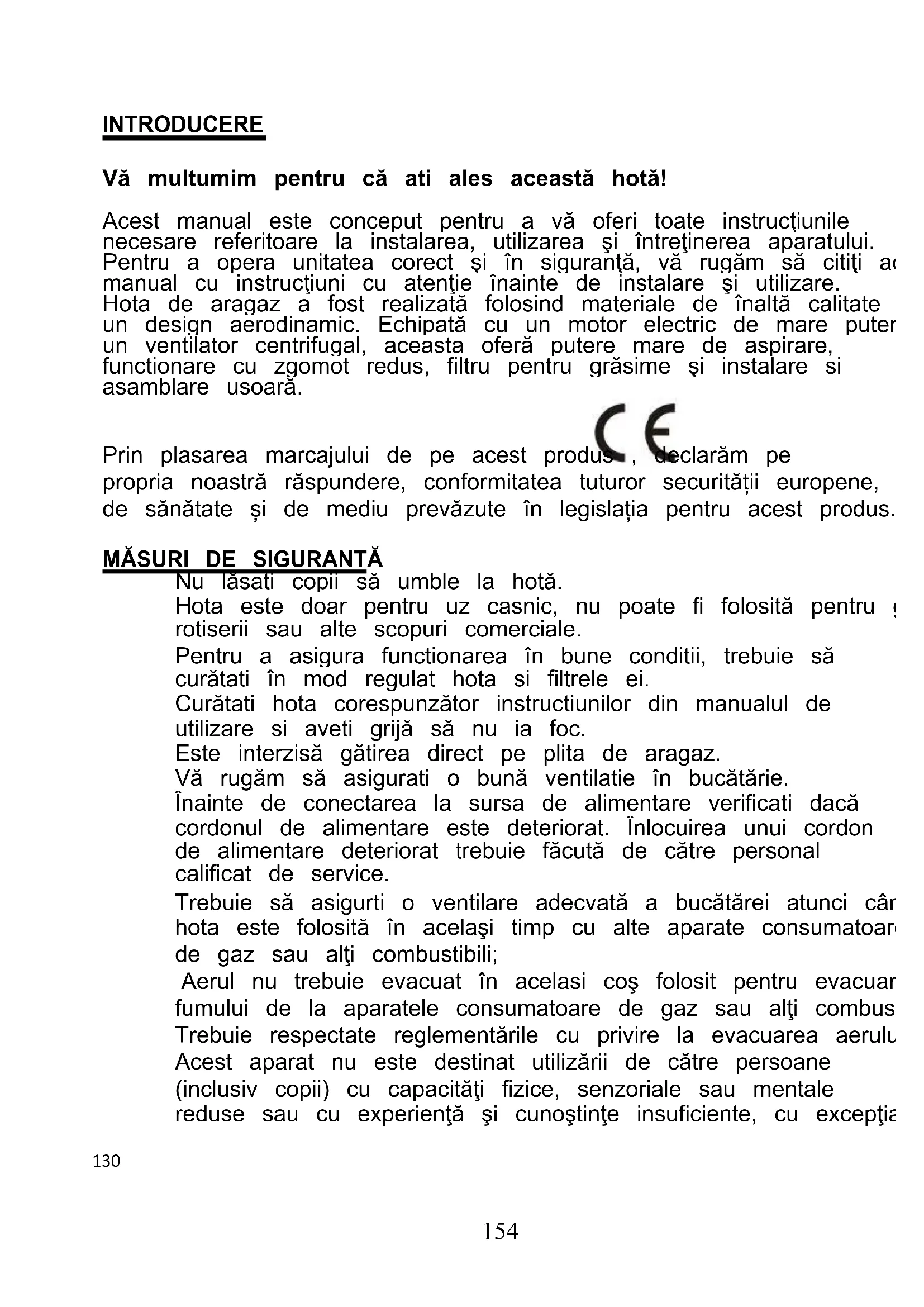 Nu lăsati copii să umble la hotă. Hota este doar pentru uz casnic, nu poate fi folosită pentru grătar, rotiserii sau alte scopuri comerciale. Pentru a asigura functionarea în bune conditii, trebuie să curătati în mod regulat hota si filtrele ei. Curătati hota corespunzător instructiunilor din manualul de utilizare si aveti grijă să nu ia foc. Este interzisă gătirea direct pe plita de aragaz. Vă rugăm să asigurati o bună ventilatie în bucătărie. Înainte de conectarea la sursa de alimentare verificati dacă cordonul de alimentare este deteriorat. Înlocuirea unui cordon de alimentare deteriorat trebuie făcută de către personal calificat de service. Trebuie să asigurti o ventilare adecvată a bucătărei atunci când hota este folosită în acelaşi timp cu alte aparate consumatoare de gaz sau alţi combustibili; Aerul nu trebuie evacuat în acelasi coş folosit pentru evacuarea fumului de la aparatele consumatoare de gaz sau alţi combustibili; Trebuie respectate reglementările cu privire la evacuarea aerului. Acest aparat nu este destinat utilizării de către persoane (inclusiv copii) cu capacităţi fizice, senzoriale sau mentale reduse sau cu experienţă şi cunoştinţe insuficiente, cu excepţia