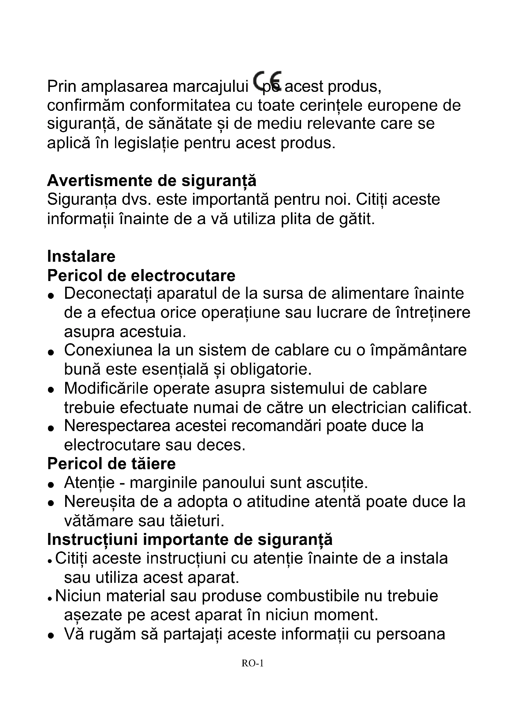 Upotrebljavajte lonce čiji je promjer iste veličine kao i odabrana zona.RO-1 Prin amplasarea marcajului pe acest produs, confirmăm conformitatea cu toate cerințele europene de siguranță, de sănătate și de mediu relevante care se aplică în legislație pentru acest produs. Avertismente de siguranță Siguranța dvs. este importantă pentru noi. Citiți aceste informații înainte de a vă utiliza plita de gătit. Instalare Pericol de electrocutare