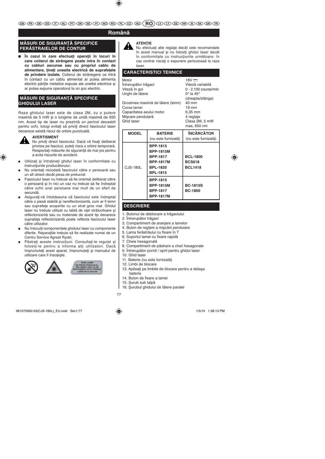 Utiliza i =i între ine i ghidul laser în conformitate cu instruc iunile produc torului. Nu orienta i niciodat fasciculul c tre o persoan sau un alt obiect decât piesa de prelucrat. Fasciculul laser nu trebuie s fie orientat deliberat c tre o persoan =i în nici un caz nu trebuie s fie îndreptat c tre ochii unei persoane mai mult de un sfert de secund . Asigura i-v întotdeauna c fasciculul este îndreptat c tre o pies stabil =i nereflectorizant , cum ar fi lemn sau suprafe e acoperite cu un strat gros mat. Ghidul laser nu trebuie utilizat cu tabl de o el str lucitoare =i reflectorizant sau cu materiale de acest tip deoarece suprafa a reflectorizant poate reflecta fasciculul laser c tre utilizator. Nu înlocui i componentele ghidului laser cu componente diferite. Repara iile trebuie s fie realizate numai de un Centru Service Agreat Ryobi. P stra i aceste instruc iuni. Consulta i-le regulat =i folosi i-le pentru a informa al i utilizatori. Dac împrumuta i acest aparat, împrumuta i =i manualul de utilizare care îl înso e=te. CJS-180L BATERIE (nu este furnizat ) BPP-1815 BPP-1815M BPP-1817 BPP-1817M BPL-1820 BPL-1815 BPP-1815 BPP-1815M BPP-1817 BPP-1817M 18V Vitez variabil