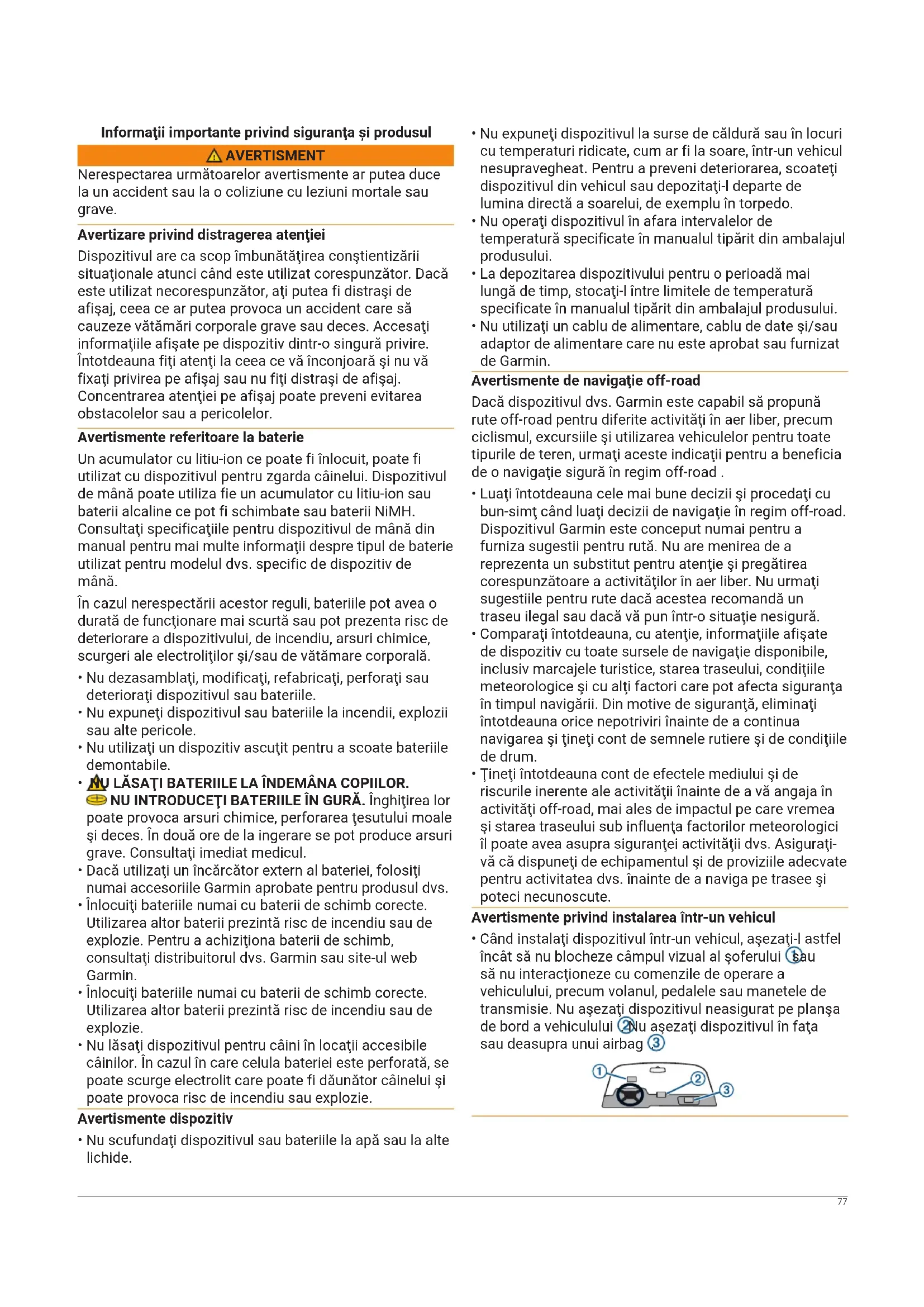 - Când instalaţi dispozitivul într-un vehicul, aşezaţi-l astfel încât să nu blocheze câmpul vizual al şoferului sau să nu interacţioneze cu comenzile de operare a vehiculului, precum volanul, pedalele sau manetele de transmisie. Nu aşezaţi dispozitivul neasigurat pe planşa de bord a vehiculului . Nu aşezaţi dispozitivul în faţa sau deasupra unui airbag . 77Avertismente privind navigaţia stradală Dacă dispozitivul dvs. Garmin acceptă hărţi rutiere şi sugerează rute care urmează drumuri, urmaţi aceste indicaţii pentru a beneficia de o navigaţie rutieră în condiţii de siguranţă.