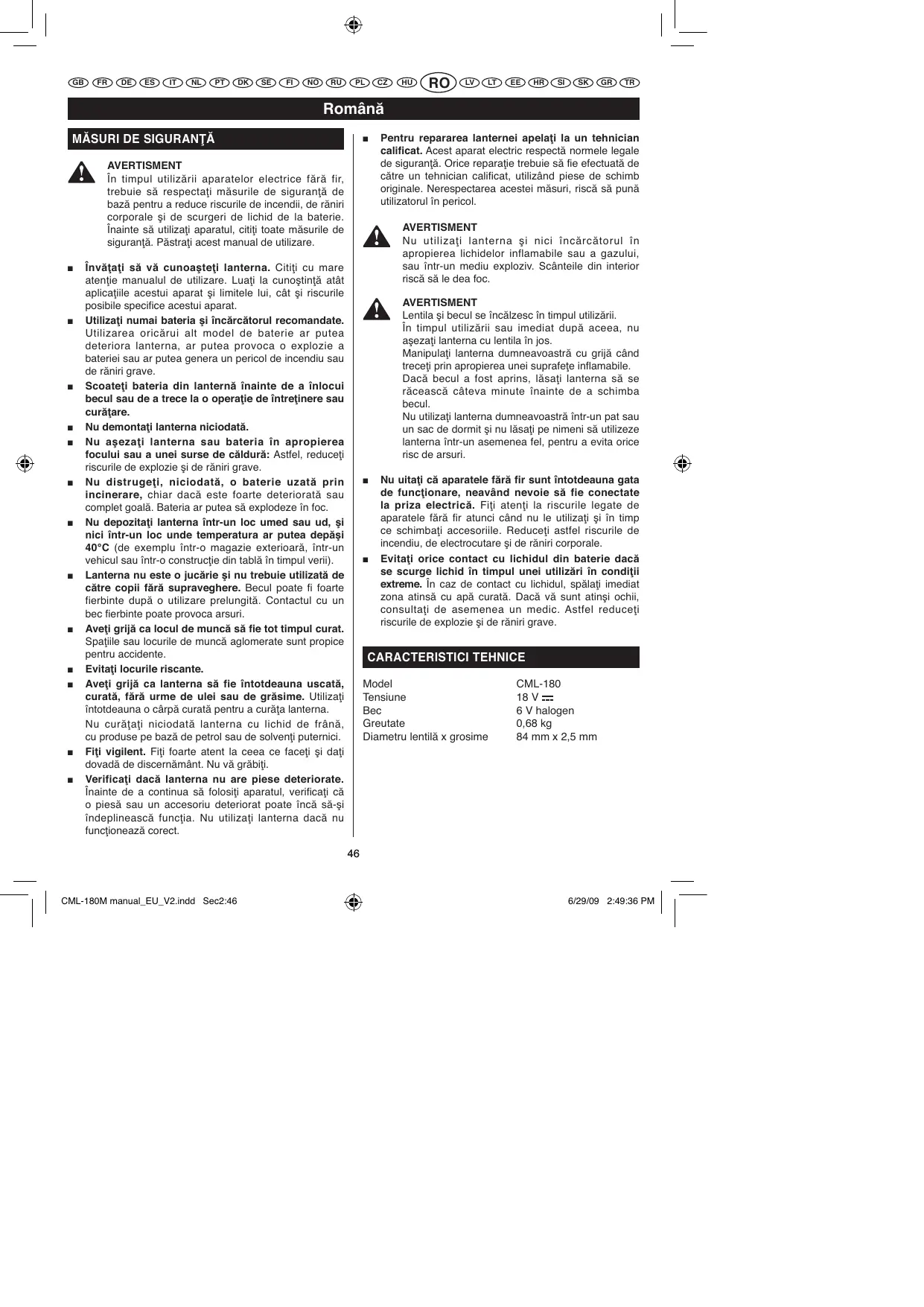 - Invāṭāti sā vā cunoastēti lanterna. Citti ci mu mare atentie manualul de utilizesc. Luati la cunostintā at aṭaplicathiile acestui aparat sī limitete lui, CAT sī riscurile posibile specifice acestui aparat.
