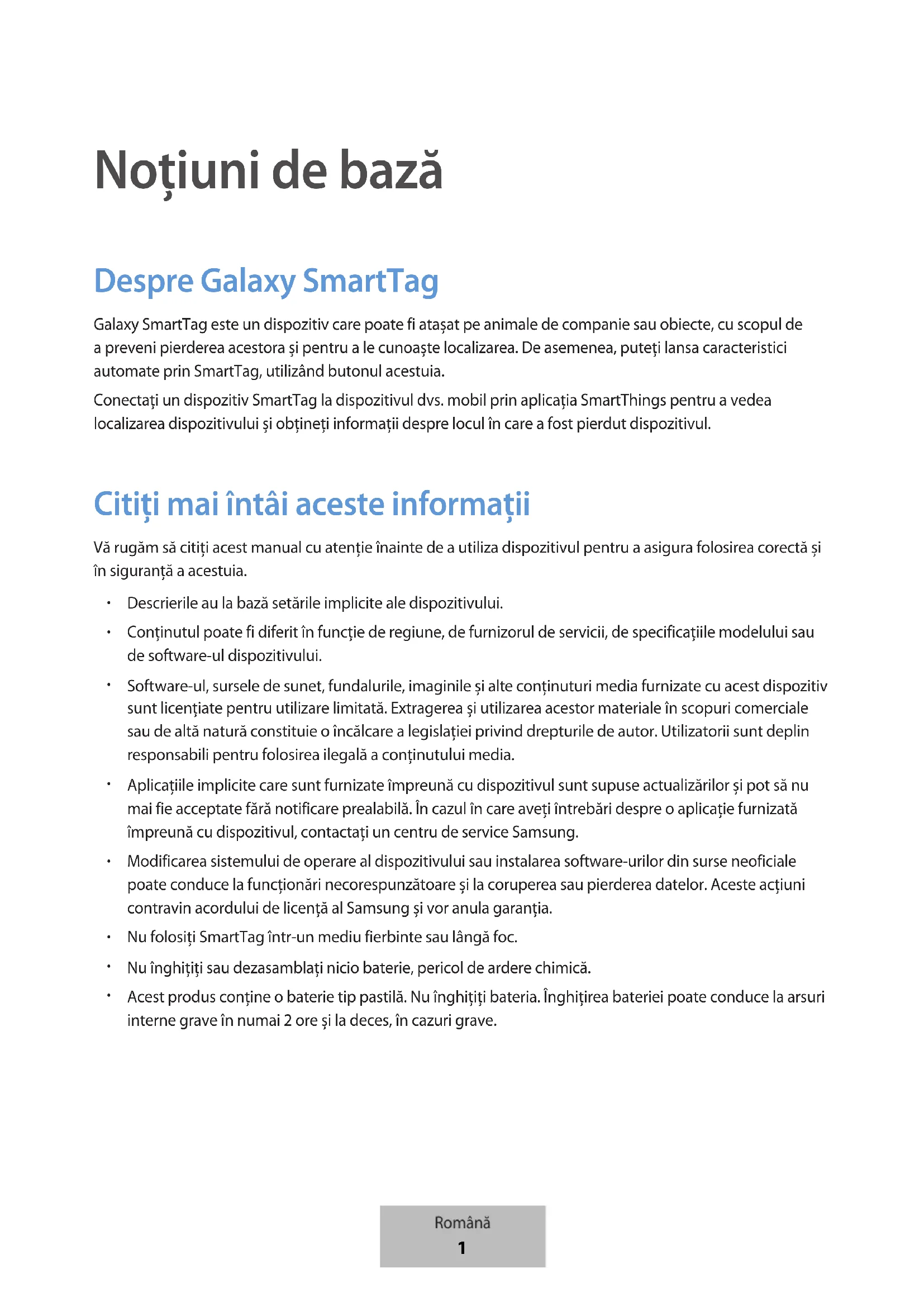 Noțiuni de bază Despre Galaxy SmartTag Galaxy SmartTag este un dispozitiv care poate fi atașat pe animale de companie sau obiecte, cu scopul de a preveni pierderea acestora și pentru a le cunoaște localizarea. De asemenea, puteți lansa caracteristici automate prin SmartTag, utilizând butonul acestuia. Conectați un dispozitiv SmartTag la dispozitivul dvs. mobil prin aplicația SmartThings pentru a vedea localizarea dispozitivului și obțineți informații despre locul în care a fost pierdut dispozitivul. Citiți mai întâi aceste informații Vă rugăm să citiţi acest manual cu atenţie înainte de a utiliza dispozitivul pentru a asigura folosirea corectă și în siguranță a acestuia.