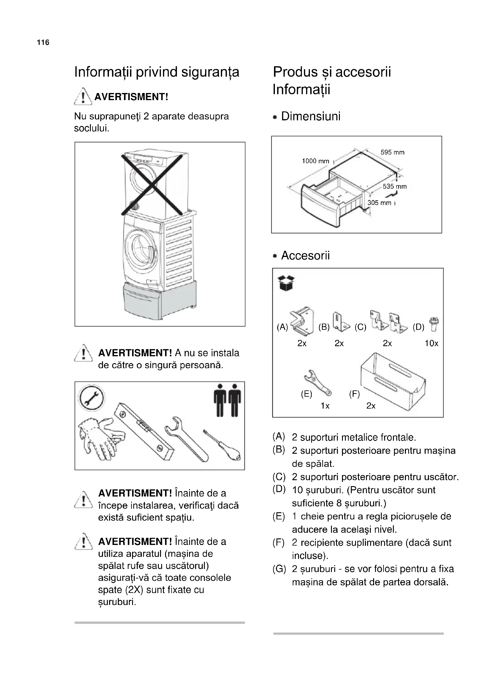 (A) (B) (C) (D) (E) (F) (G) 2 suporturi metalice frontale. 2 suporturi posterioare pentru mașina de spălat. 2 suporturi posterioare pentru uscător. 10 șuruburi. (Pentru uscător sunt suficiente 8 șuruburi.) cheie pentru a regla piciorușele de aducere la acelaşi nivel. recipiente suplimentare (dacă sunt incluse). 2 șuruburi - se vor folosi pentru a fixa mașina de spălat de partea dorsală.