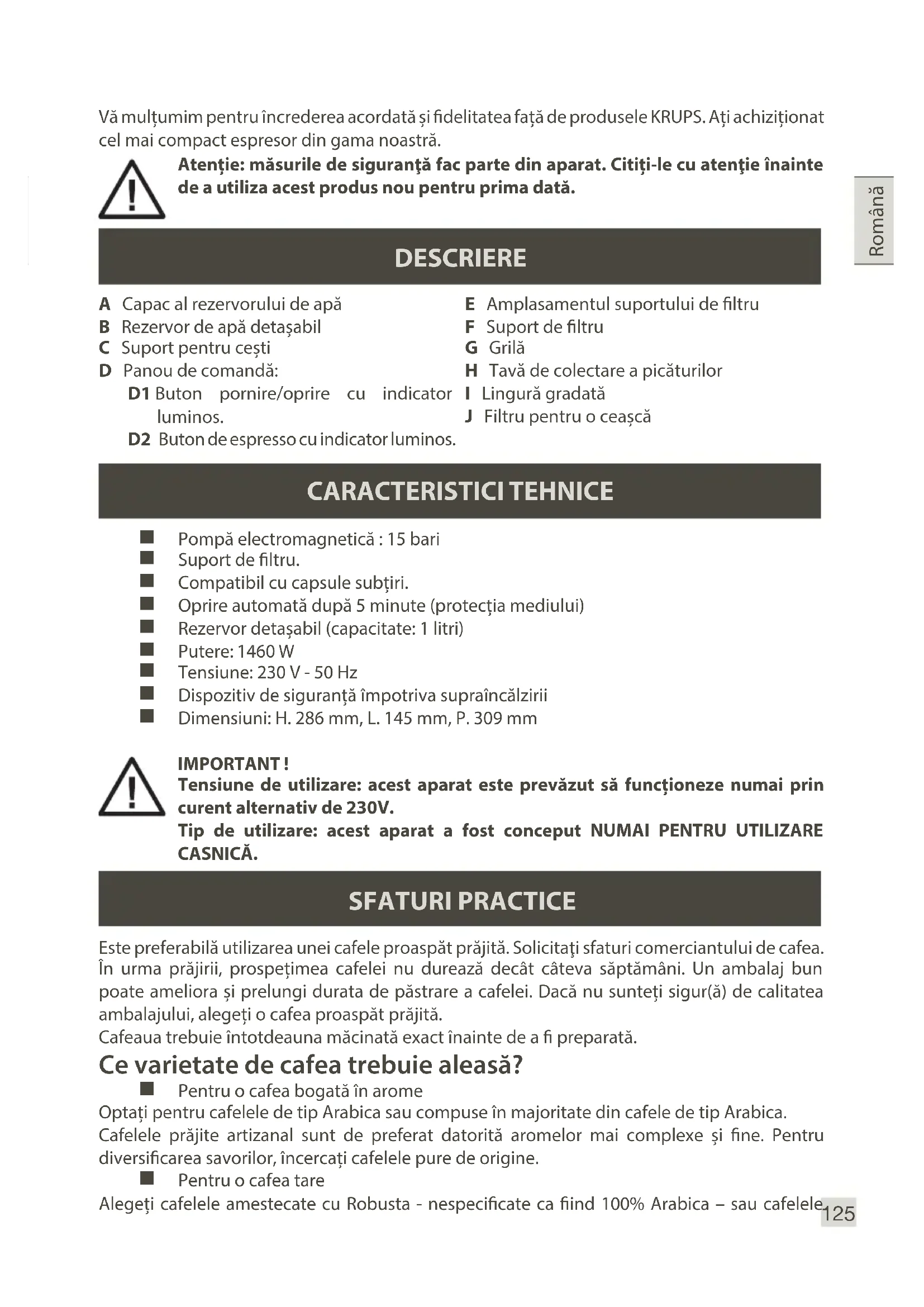 Włączmy się w ochronę środowiska! Urządzenie zawiera wiele materiałów nadających się do powtórnego wykorzystania lub recyklingu. W celu utylizacji prosimy więc oddać urządzenie do punktu zbiórki odpadów, a w przypadku jego braku – do autoryzowanego punktu serwisowego.125 Română A Capac al rezervorului de apă B Rezervor de apă detașabil C Suport pentru cești D Panou de comandă: D1 Buton pornire/oprire cu indicator luminos. D2 Buton de espresso cu indicator luminos. E Amplasamentul suportului de ltru F Suport de ltru G Grilă H Tavă de colectare a picăturilor I Lingură gradată J Filtru pentru o ceașcă CARACTERISTICI TEHNICE Pompă electromagnetică : 15 bari Suport de ltru. Compatibil cu capsule subțiri. Oprire automată după 5 minute (protecția mediului) Rezervor detașabil (capacitate: 1 litri) Putere: 1460 W Tensiune: 230 V - 50 Hz Dispozitiv de siguranță împotriva supraîncălzirii Dimensiuni: H. 286 mm, L. 145 mm, P. 309 mm IMPORTANT ! Tensiune de utilizare: acest aparat este prevăzut să funcționeze numai prin curent alternativ de 230V. Tip de utilizare: acest aparat a fost conceput NUMAI PENTRU UTILIZARE CASNICĂ. Vă mulțumim pentru încrederea acordată și delitatea față de produsele KRUPS. Ați achiziționat cel mai compact espresor din gama noastră. DESCRIERE SFATURI PRACTICE Este preferabilă utilizarea unei cafele proaspăt prăjită. Solicitaţi sfaturi comerciantului de cafea. În urma prăjirii, prospețimea cafelei nu durează decât câteva săptămâni. Un ambalaj bun poate ameliora și prelungi durata de păstrare a cafelei. Dacă nu sunteți sigur(ă) de calitatea ambalajului, alegeți o cafea proaspăt prăjită. Cafeaua trebuie întotdeauna măcinată exact înainte de a preparată. Ce varietate de cafea trebuie aleasă? Pentru o cafea bogată în arome Optați pentru cafelele de tip Arabica sau compuse în majoritate din cafele de tip Arabica. Cafelele prăjite artizanal sunt de preferat datorită aromelor mai complexe și ne. Pentru diversicarea savorilor, încercați cafelele pure de origine. Pentru o cafea tare Alegeți cafelele amestecate cu Robusta - nespecicate ca ind 100% Arabica – sau cafelele Atenție: măsurile de siguranţă fac parte din aparat. Citiți-le cu atenţie înainte de a utiliza acest produs nou pentru prima dată.126 prăjite italiene ori specice gusturilor italiene. Păstrați cafeaua măcinată în frigider, astfel ea își va păstra aroma mai mult timp. Nu umpleți suportul de ltru la maxim, ci utilizați lingura gradată (1 lingură pentru o ceașcă de 50ml). Îndepărtați excesul de cafea măcinată de pe muchia suportului de ltru. Dacă nu utilizați aparatul mai mult de 5 zile, goliți și clătiți rezervorul de apă. Înainte de a îndepărta rezervorul de apă pentru a-l reumple sau goli, asigurați-vă întotdeauna că aparatul este oprit. Amplasaţi întotdeauna aparatul pe o suprafaţă plană și stabilă. PRIMA PUNERE ÎN FUNCȚIUNE – sau după o perioadă lungă de neutilizare a espressorului dumneavoastră. Clătirea și amorsarea sistemului înaintea primei utilizări. Înainte de a utiliza aparatul pentru prima dată, curățați toate accesoriile în apă cu detergent, clătiți-le, apoi uscați-le. Efectuați clătirea urmând pașii următori: Racordați espressorul la o priză electrică (1). Dați la o parte capacul și scoateți rezervorul de apă (2). Umpleți rezervorul cu apă la temperatura camerei și puneți-l la loc în aparat asigurându- vă că este instalat corect. Repuneți capacul la loc (3-4). Porniţi aparatul apăsând pe butonul pornire/oprire (D1). Aparatul va emite un semnal sonor scurt la punerea sa în funcțiune și atunci când este oprit, lucru absolut normal. Acest semnal indică punerea în funcțiune/oprirea pompei (5). Indicatorul de temperatură (D1) va clipi după care rămâne aprins continuu (6). Introduceți suportul de ltru (F) (fără cafea) și rotiți-l înspre dreapta până la opritor (7). Amplasați un recipient de peste ½ litri sub suportul de ltru (8). Pentru a amorsarea circuitelor, apăsați butonul de Espresso (D2) și mențineți-l apăsat până când prin suportul de ltru (9) începe să se scurgă apa. În momentul în care apa începe să se scurgă, puteți elibera butonul. Durata acestui ciclu este limitată la 1 minut pentru a se evita supraîncălzirea. Lăsați aparatul să se răcească. Dacă apa nu se scurge (amorsarea pompei), reluați operația de la început dar fără suportul de ltru. Clătiți aparatul: în acest scop, apăsați pe butonul de Espresso (D2) pentru a lăsa să se scurgă echivalentul a 5 cești de espresso de 50ml (10). Lăsați aparatul să se răcească câteva minute. Repetați această operație de 4 ori, asigurându-vă că rezervorul conține o cantitate sucientă de apă. Scoateți rezervorul, goliți-l, clătiți-l bine și puneți-l la loc. IMPORTANT ! Dacă aparatul nu este utilizat timp de 5 minute, acesta se va închide automat (pentru protejarea mediului). IMPORTANT ! Aparatul va emite un semnal sonor la ecare punere în funcțiune și atunci când este oprit (prin apăsarea butonului pornire/oprire (D1), lucru absolut normal. Acest semnal indică punerea în funcțiune/oprirea pompei.127 Română