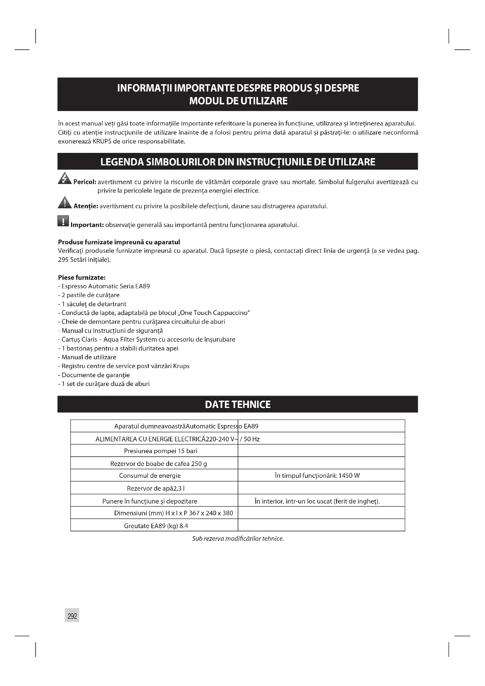 Important: observație generală sau importantă pentru funcționarea aparatului. Produse furnizate împreună cu aparatul Vericați produsele furnizate împreună cu aparatul. Dacă lipsește o piesă, contactați direct linia de urgență (a se vedea pag. 295 Setări inițiale). Piese furnizate: - Espresso Automatic Seria EA89 - 2 pastile de curățare - 1 săculeț de detartrant - Conductă de lapte, adaptabilă pe blocul „One Touch Cappuccino” - Cheie de demontare pentru curățarea circuitului de aburi - Manual cu instrucțiuni de siguranță - Cartuș Claris – Aqua Filter System cu accesoriu de înșurubare - 1 bastonaș pentru a stabili duritatea apei - Manual de utilizare - Registru centre de service post vânzări Krups - Documente de garanție - 1 set de curățare duză de aburi DATE TEHNICE Aparatul dumneavoastră Automatic Espresso EA89 ALIMENTAREA CU ENERGIE ELECTRICĂ 220-240 V~ / 50 Hz Presiunea pompei 15 bari Rezervor de boabe de cafea 250 g Consumul de energie În timpul funcționării: 1450 W Rezervor de apă 2,3 l Punere în funcțiune și depozitare În interior, într-un loc uscat (ferit de îngheț). Dimensiuni (mm) H x l x P 367 x 240 x 380 Greutate EA89 (kg) 8.4 Sub rezerva modicărilor tehnice.DESCRIEREA APARATULUI A Mâner capac rezervor de apăB Rezervor de apăC Vas colector zaț de cafea D Ieșiri pentru cafea, cu înălțime reglabilă E Grătar și recipient pentru picături F Capac rezervor de boabe de cafeaG Bloc detașabil One Touch Cappuccino H Conductă de lapte și mixer I Flotor nivel de apă Rezervor de boabe de cafeaJ Buton de reglare a neții de măcinareK Tub de alimentare pastilă de curățareL Accesoriu pentru măcinare cu pietre metalice Panou de comandăM EcranN Tastă „pornire/oprire”O Taste tactilePrecizări: Recipientul pentru picături: permite recuperarea apei sau a cafelei care se scurge din aparat în timpul și după prepararea băuturilor. Este important să îl lăsați în locașul său și să îl goliți periodic.
