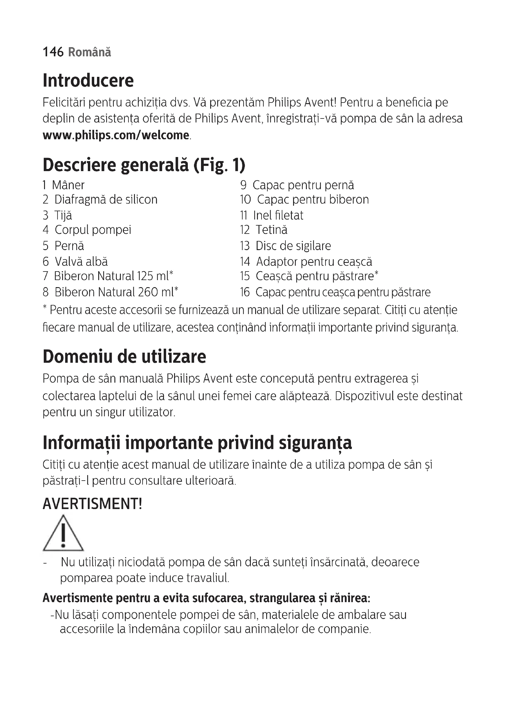 - Pentru aceste accesorii se furnizează un manual de utilizare separat. Citiţi cu atenţie ecare manual de utilizare, acestea conţinând informaţii importante privind siguranţa. Domeniu de utilizare Pompa de sân manuală Philips Avent este concepută pentru extragerea și colectarea laptelui de la sânul unei femei care alăptează. Dispozitivul este destinat pentru un singur utilizator. Informaţii importante privind siguranţa Citiţi cu atenţie acest manual de utilizare înainte de a utiliza pompa de sân și păstraţi-l pentru consultare ulterioară. AVERTISMENT! - Nu utilizaţi niciodată pompa de sân dacă sunteţi însărcinată, deoarece pomparea poate induce travaliul. Avertismente pentru a evita sufocarea, strangularea și rănirea: - Nu lăsaţi componentele pompei de sân, materialele de ambalare sau accesoriile la îndemâna copiilor sau animalelor de companie. 146 Română- Inspectaţi pompa de sân pentru a detecta semnele de deteriorare înainte de ecare utilizare. Nu utilizaţi pompa de sân dacă aceasta este deteriorată sau dacă nu funcţionează corect. Avertismente pentru evitarea contaminării și asigurarea igienei: - Din motive de igienă, pompa de sân este concepută numai pentru utilizare repetată de către o singură utilizatoare. - Curăţaţi și dezinfectaţi toate componentele înainte de prima și după ecare utilizare. - Nu utilizaţi agenţi de curăţare antibacterieni sau abrazivi pentru curăţarea componentelor pompei de sân, pentru a evita deteriorarea acestora. - Spălaţi-vă bine mâinile cu apă și săpun înainte de a atinge sânii și componentele pompei de sân, pentru a preveni contaminarea. Evitaţi să atingeţi interiorul recipientelor sau capacelor. Avertismente pentru a evita problemele la nivelul sânului și al mamelonului, inclusiv durerea: - Eliberaţi întotdeauna mânerul înainte de a îndepărta corpul pompei de pe sân, pentru a elibera vidul creat. - În cazul în care vidul devine inconfortabil sau cauzează durere, opriţi pomparea și îndepărtaţi pompa de sân de pe sân. - Nu continuaţi pomparea pe perioade mai mari de cinci minute, dacă nu reușiţi să provocaţi lactaţia Încercaţi din nou în alt moment al zilei. - Dacă procesul devine foarte inconfortabil sau dureros, încetaţi utilizarea pompei și solicitaţi sfatul unui profesionist din domeniul sănătăţii. - Utilizaţi numai accesoriile și componentele recomandate de Philips Avent. - Este interzisă modicarea pompei de sân. Avertisment: Dacă sunteţi o mamă infectată cu virusul imunodecienţei umane (HIV) sau cu hepatită B sau C, utilizarea pompei de sân nu va reduce sau elimina riscul transmiterii virusului la bebelușul dvs. prin intermediul laptelui matern. Atenţie - Nu lăsaţi componentele în apropierea suprafeţelor erbinţi, pentru a evita deformarea acestora. 147RomânăPregătirea pentru utilizare Dezasamblaţi, curăţaţi și dezinfectaţi toate componentele înainte de a utiliza pompa de sân pentru prima dată și după ecare utilizare. Atenţie: Atenţie la îndepărtarea și curăţarea valvei albe. Nu introduceţi obiecte în valva albă, pentru a evita deteriorarea acesteia. Curăţarea și dezinfectarea Pasul 1: Dezasamblarea Dezasamblaţi complet pompa de sân și biberonul. Îndepărtaţi și valva albă de pe pompa de sân. Pasul 2: Curăţarea Componentele pot curăţate manual sau în mașina de spălat vase. Avertisment: Nu utilizaţi agenţi de curăţare antibacterieni sau abrazivi pentru curăţarea componentelor pompei de sân, pentru a evita deteriorarea acestora. Pasul 2A: Curăţarea manuală 1 Clătiţi toate componentele sub jet de apă călduţă. 2 Înmuiaţi toate componentele timp de 5 minute în apă caldă cu puţin detergent lichid neagresiv. 3 Curăţaţi toate componentele cu o perie de curăţare. 4 Clătiţi bine toate componentele sub jet de apă rece limpede. 5 Lăsaţi toate componentele să se usuce în mod natural pe un prosop sau un suport pentru uscare curat. Pasul 2B: Curăţarea în mașina de spălat vase Notă: Coloranţii alimentari pot determina decolorarea componentelor. 1 Așezaţi toate componentele în sertarul superior al mașinii de spălat vase. 2 Introduceţi în mașină detergent lichid sau tip tabletă și rulaţi un program standard. 3 Lăsaţi toate componentele să se usuce în mod natural pe un prosop sau un suport pentru uscare curat. 148 RomânăPasul 3: Dezinfectarea Atenţie: În timpul dezinfectării cu apă clocotită, împiedicaţi biberonul și celelalte componente să atingă pereţii vasului. Acest lucru poate duce la deformare sau deteriorare iremediabilă a produsului pentru care Philips nu va răspunzătoare. 1 Umpleţi un vas de bucătărie cu apă sucientă pentru a acoperi toate componentele și introduceţi toate componentele în vas. Lăsaţi apa să arbă timp de 5 minute. Asiguraţi-vă că pereţii vasului nu ating componentele. 2 Lăsaţi apa să se răcească. 3 Scoateţi cu grijă componentele din apă. Așezaţi componentele pe o suprafaţă curată, un prosop sau un suport de uscare pentru a se usca în mod natural. Asamblarea pompei de sân Asiguraţi-vă că aţi curăţat și dezinfectat componentele pompei de sân care vin în contact cu laptele. Avertisment: Atenţie: atunci când aţi dezinfectat componentele pompei de sân prin erbere, acestea pot foarte erbinţi. Pentru a preveni arsurile, începeţi asamblarea pompei de sân numai după răcirea componentelor dezinfectate. Înainte de utilizare, vericaţi componentele kitului pompei de sân pentru semne de uzură sau deteriorare și înlocuiţi-le, dacă este necesar. Notă: Așezarea corectă a pernei și a diafragmei din silicon este esenţială pentru capacitatea pompei de sân de a crea un vid corespunzător. 1 Introduceţi valva albă în corpul pompei prin partea inferioară. Apăsaţi valva în interior cât mai mult posibil (Fig. 2). 2 Înșurubaţi corpul pompei pe