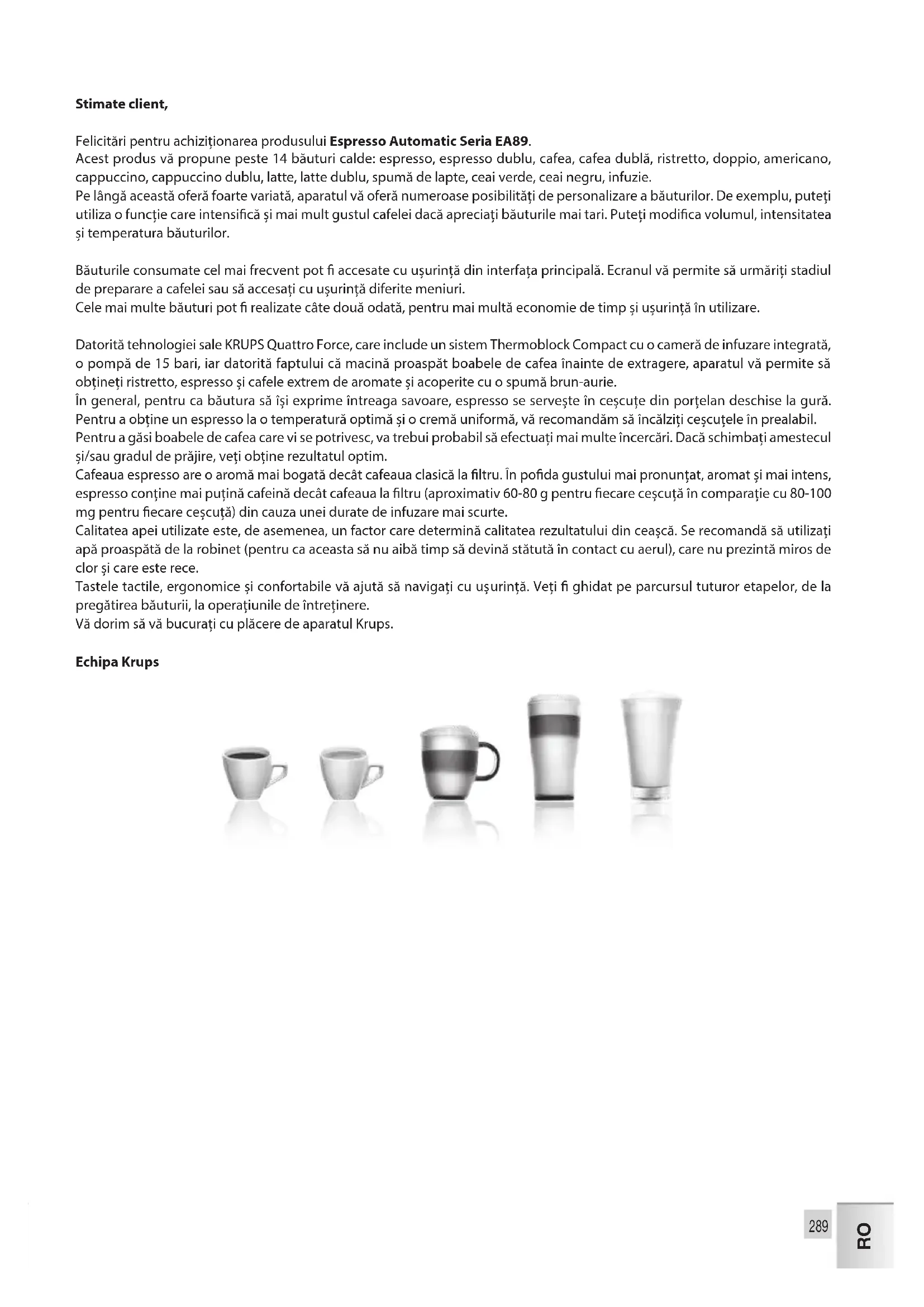 Stimate client, Felicitări pentru achiziționarea produsului Espresso Automatic Seria EA89. Acest produs vă propune peste 14 băuturi calde: espresso, espresso dublu, cafea, cafea dublă, ristretto, doppio, americano, cappuccino, cappuccino dublu, latte, latte dublu, spumă de lapte, ceai verde, ceai negru, infuzie. Pe lângă această oferă foarte variată, aparatul vă oferă numeroase posibilități de personalizare a băuturilor. De exemplu, puteți utiliza o funcție care intensică și mai mult gustul cafelei dacă apreciați băuturile mai tari. Puteți modica volumul, intensitatea și temperatura băuturilor. Băuturile consumate cel mai frecvent pot accesate cu ușurință din interfața principală. Ecranul vă permite să urmăriți stadiul de preparare a cafelei sau să accesați cu ușurință diferite meniuri. Cele mai multe băuturi pot realizate câte două odată, pentru mai multă economie de timp și ușurință în utilizare. Datorită tehnologiei sale KRUPS Quattro Force, care include un sistem Thermoblock Compact cu o cameră de infuzare integrată, o pompă de 15 bari, iar datorită faptului că macină proaspăt boabele de cafea înainte de extragere, aparatul vă permite să obțineți ristretto, espresso și cafele extrem de aromate și acoperite cu o spumă brun-aurie. În general, pentru ca băutura să își exprime întreaga savoare, espresso se servește în ceșcuțe din porțelan deschise la gură. Pentru a obține un espresso la o temperatură optimă și o cremă uniformă, vă recomandăm să încălziți ceșcuțele în prealabil. Pentru a găsi boabele de cafea care vi se potrivesc, va trebui probabil să efectuați mai multe încercări. Dacă schimbați amestecul și/sau gradul de prăjire, veți obține rezultatul optim. Cafeaua espresso are o aromă mai bogată decât cafeaua clasică la ltru. În poda gustului mai pronunțat, aromat și mai intens, espresso conține mai puțină cafeină decât cafeaua la ltru (aproximativ 60-80 g pentru ecare ceșcuță în comparație cu 80-100 mg pentru ecare ceșcuță) din cauza unei durate de infuzare mai scurte. Calitatea apei utilizate este, de asemenea, un factor care determină calitatea rezultatului din ceașcă. Se recomandă să utilizați apă proaspătă de la robinet (pentru ca aceasta să nu aibă timp să devină stătută în contact cu aerul), care nu prezintă miros de clor și care este rece. Tastele tactile, ergonomice și confortabile vă ajută să navigați cu ușurință. Veți ghidat pe parcursul tuturor etapelor, de la pregătirea băuturii, la operațiunile de întreținere. Vă dorim să vă bucurați cu plăcere de aparatul Krups. Echipa Krups290