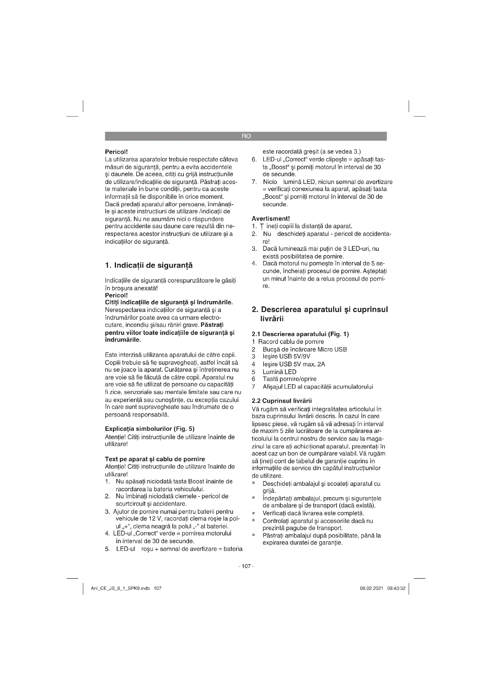Decuplaţi toţi consumatorii de curent (faruri, radio, ...) la vehicul. Nu încercaţi niciodată să porniţi un vehicul fără baterie de pornire Anl_CE_JS_8_1_SPK9.indb 109Anl_CE_JS_8_1_SPK9.indb 109 08.02.2021 08:43:3208.02.2021 08:43:32RO