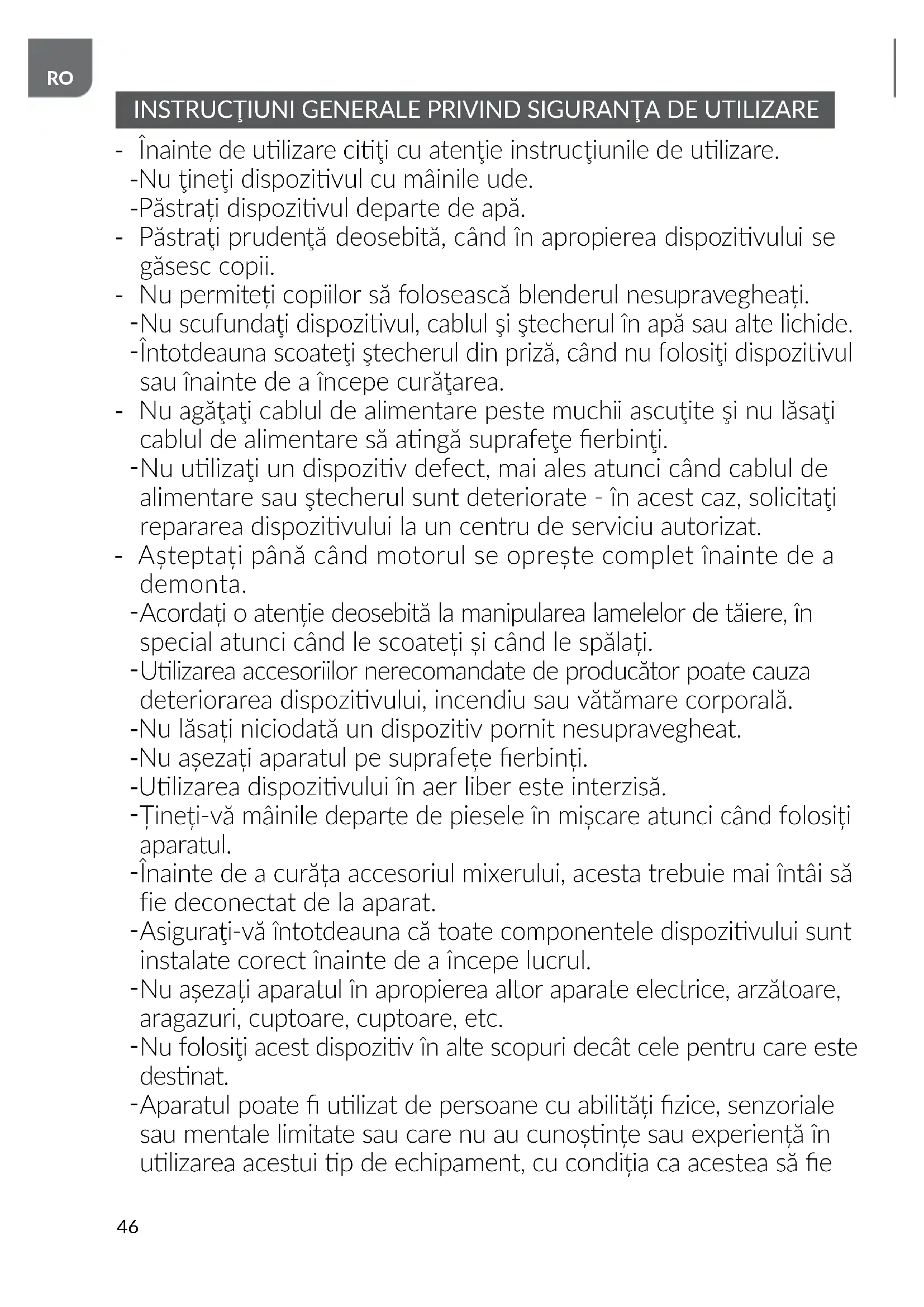 INSTRUCŢIUNI GENERALE PRIVIND SIGURANŢA DE UTILIZARE - Înainte de ulizare ciţi cu atenţie instrucţiunile de ulizare. - Nu ţineţi dispozivul cu mâinile ude. - Păstrați dispozivul departe de apă. - Păstraţi prudenţă deosebită, când în apropierea dispozivului se găsesc copii. - Nu permiteți copiilor să folosească blenderul nesupravegheați.